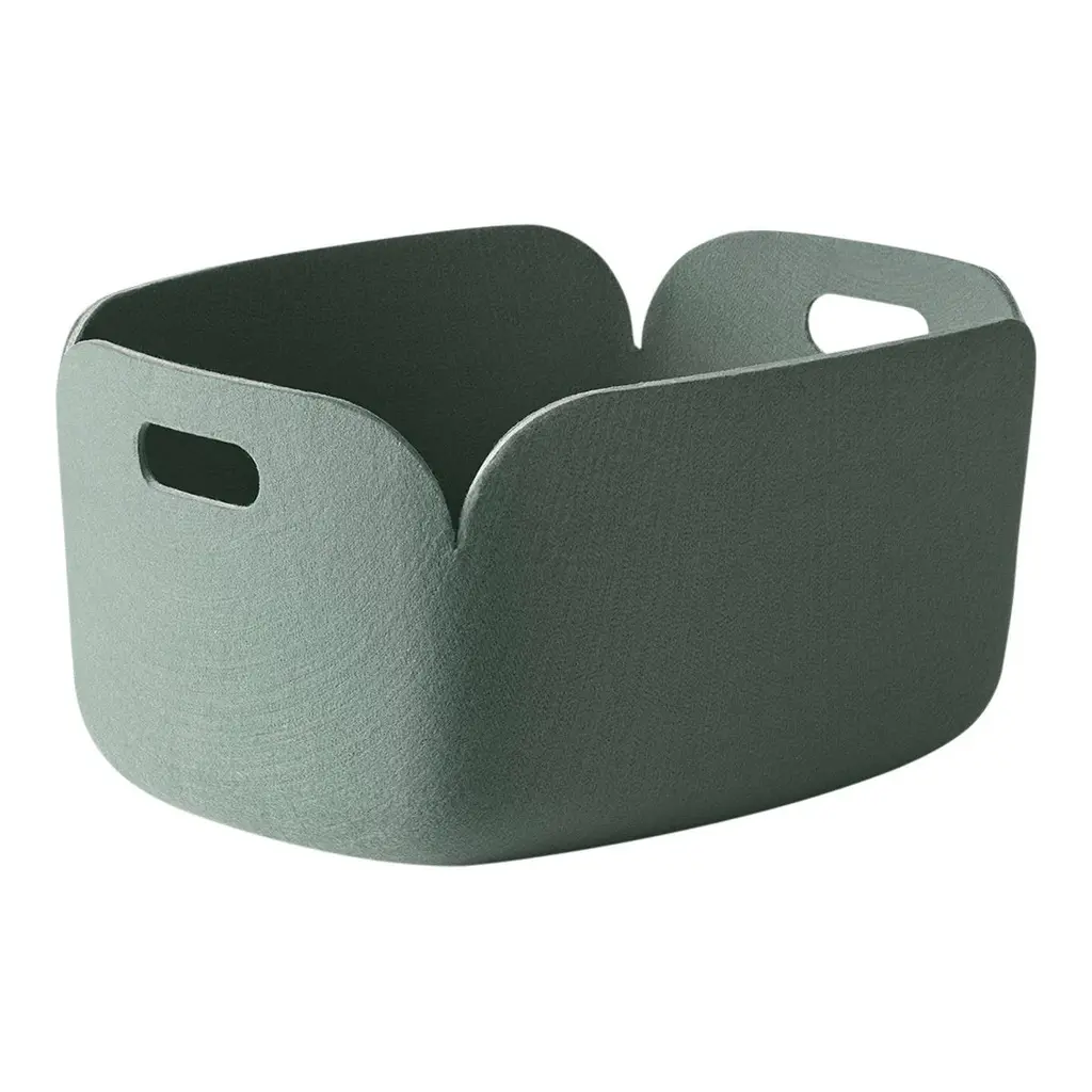 The Restore Basket by Mika Tolvanen for Muuto transforms sustainable design into beautiful storage, offering versatile organization perfect for living rooms, bedrooms, home offices, or entryways. This innovative Scandinavian storage basket elevates everyday tidying through thoughtful design that combines environmental responsibility with the refined aesthetics expected from premium Danish furniture. Constructed from 100% recycled plastic bottle fibers transformed into soft polymer felt, the Muuto Restore Basket challenges traditional storage materials while delivering exceptional durability and tactile appeal. Tolvanen's signature softly rounded silhouette breaks from utilitarian basket design, creating a friendly, non-obtrusive presence that seamlessly integrates into contemporary interiors from minimalist to mid-century modern styles. Available in sophisticated colorways including Black Melange with distinctive flecked texturing, timeless Midnight Blue, and fresh Aqua, each Restore Basket adds visual depth and personality to any room. The innovative recycled PET fiber construction creates surprisingly lightweight yet sturdy storage that maintains its shape and soft appearance through daily use, whether organizing throw blankets and magazines in living spaces or corralling toys and linens in bedrooms. Finnish designer Mika Tolvanen developed the Restore series in his Helsinki studio with the philosophy that "baskets should have a welcoming and distinct expression." The result is storage furniture that enhances rather than hides within your interior design, offering practical organization for newspapers, firewood, clothing, office supplies, or seasonal items while contributing to your home's sustainable story. Perfect for multiple room applications and versatile enough to complement various interior styles, the Muuto Restore Basket by Mika Tolvanen delivers both functional storage solutions and conscious design that transforms everyday organization into moments of Scandinavian sophistication.
