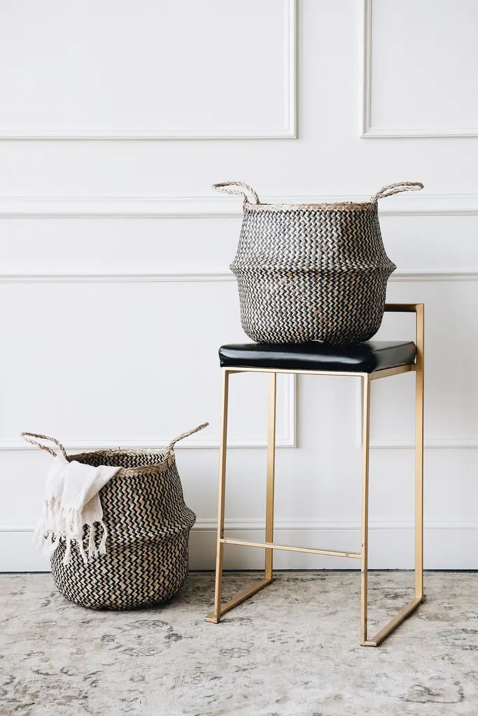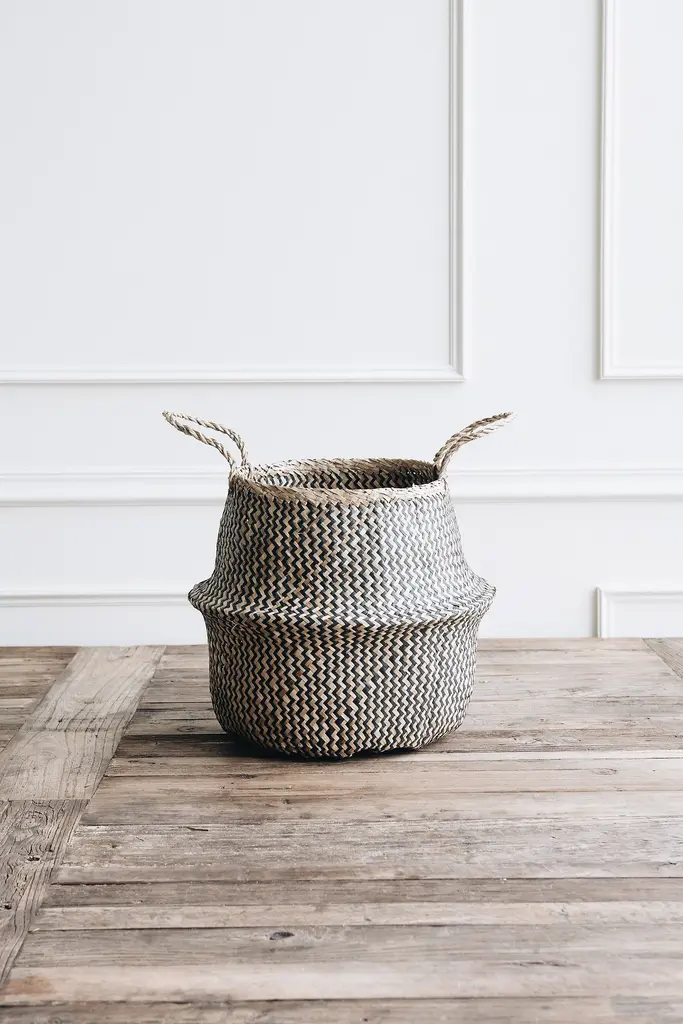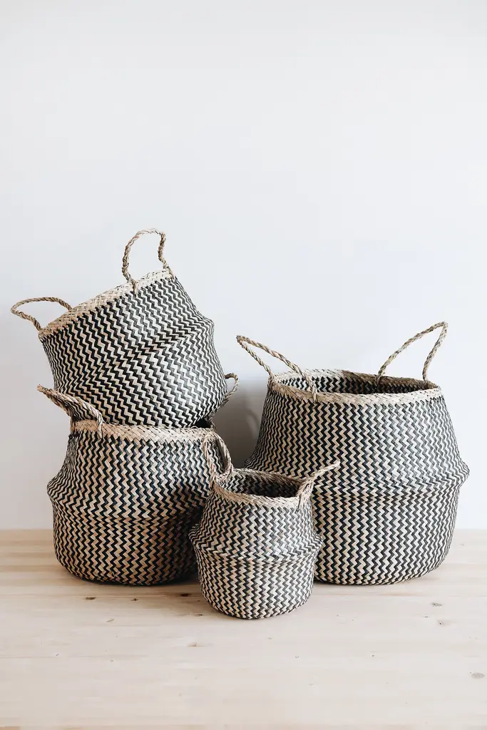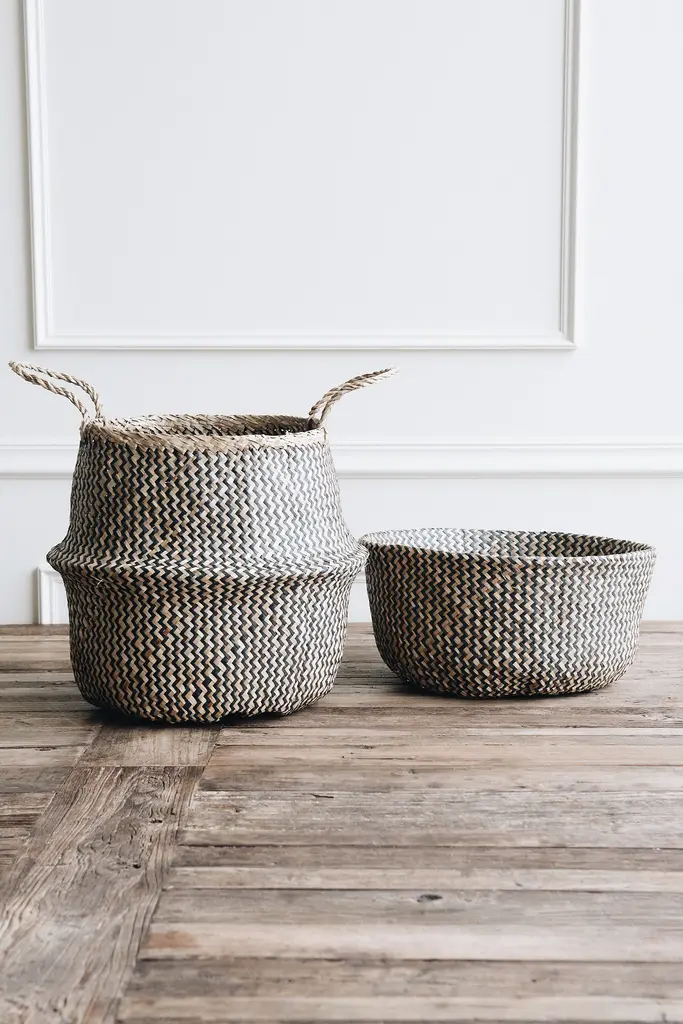 Conquer your clutter with these easy collapsible belly baskets. The perfect catch-all storage basket. Handmade by village artisans with recycled paper to create the interesting visual zig zag design. Connected Goods works with artisans around the globe to bring their craft and age-old techniques into the modern marketplace. This work brings fair wages and ethical working conditions into rural communities where employment opportunity is minimal, stimulating economic growth and promoting the artisan’s skills. Handwoven with seagrass and recycled paper Spot Clean Imported ####Dimensions Extra Small: 8” center diameter, 9” tall, 6” opening diameter Small: 11.5” center diameter, 10” tall, 8” opening diameter Medium: 14” center diameter, 12” tall, 11” opening diameter Large: 17” center diameter, 14” tall, 14” opening diameter Please note handmade products will have slight variations, this is a natural occurrence in handcrafted goods.