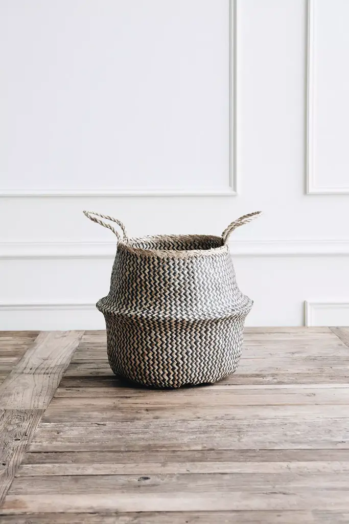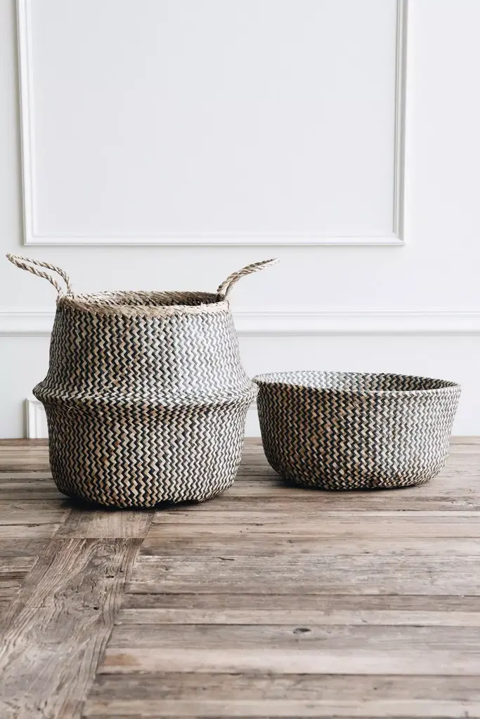Conquer your clutter with these easy collapsible belly baskets. The perfect catch-all storage basket. Handmade by village artisans with recycled paper to create the interesting visual zig zag design.Roan Iris works with artisans around the globe to bring their craft and age-old techniques into the modern marketplace. This work brings fair wages and ethical working conditions into rural communities where employment opportunity is minimal, stimulating economic growth and promoting the artisans skills.* Handwoven with seagrass and recycled paper* Spot Clean* Imported####*Dimensions** Extra Small: 8" center diameter, 9" tall, 6" opening diameter* Small: 11.5" center diameter, 10" tall, 8" opening diameter* Medium: 14" center diameter, 12" tall, 11" opening diameter* Large: 17" center diameter, 14" tall, 14" opening diameterPlease note handmade products will have slight variations, this is a natural occurrence in handcrafted goods.