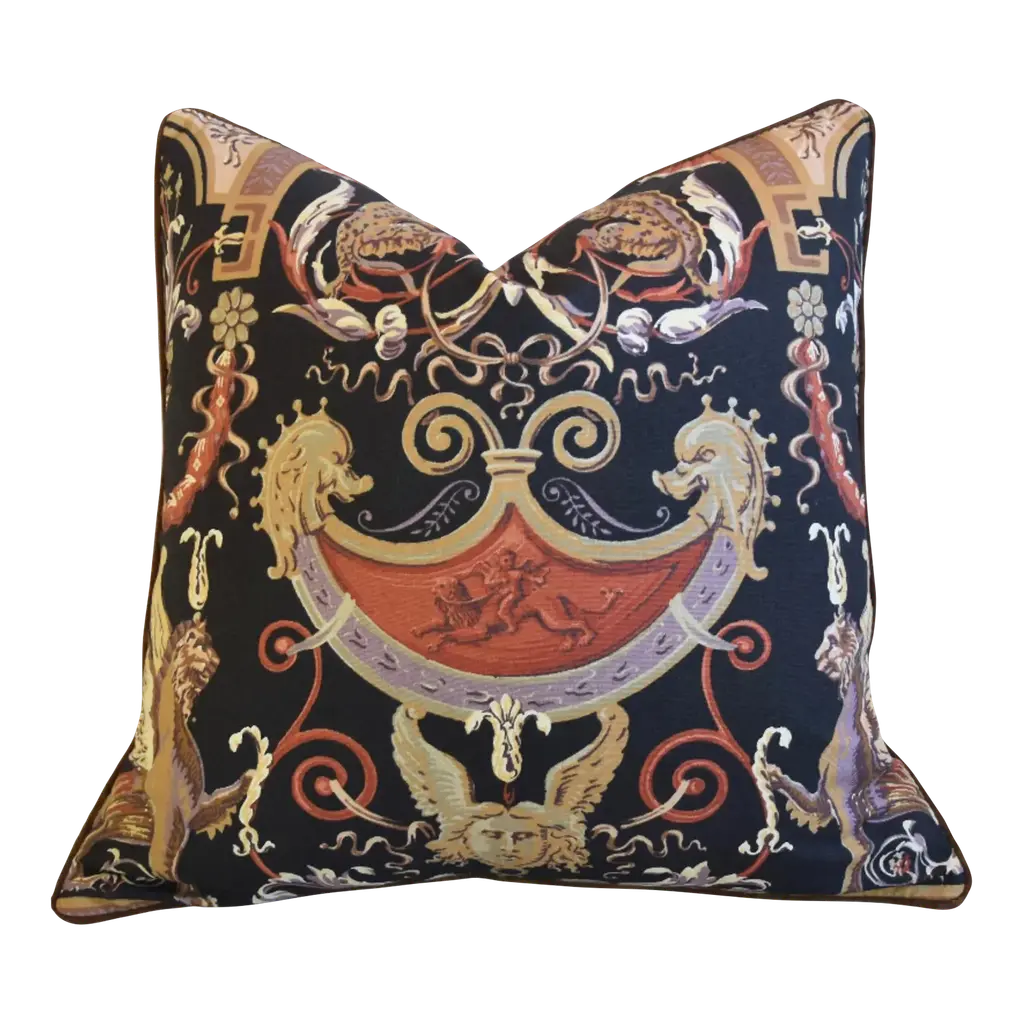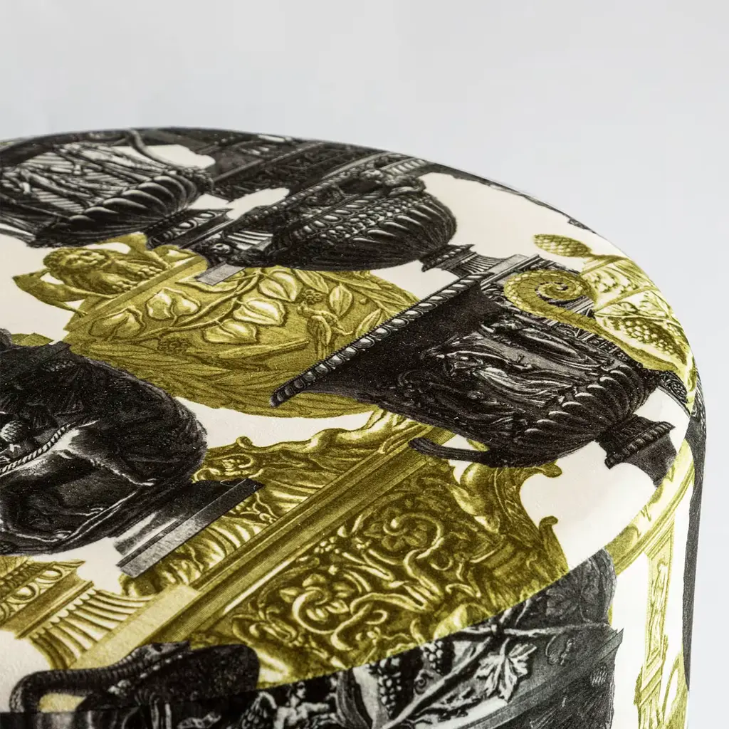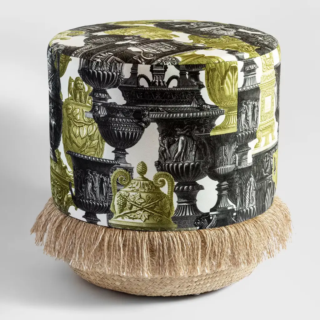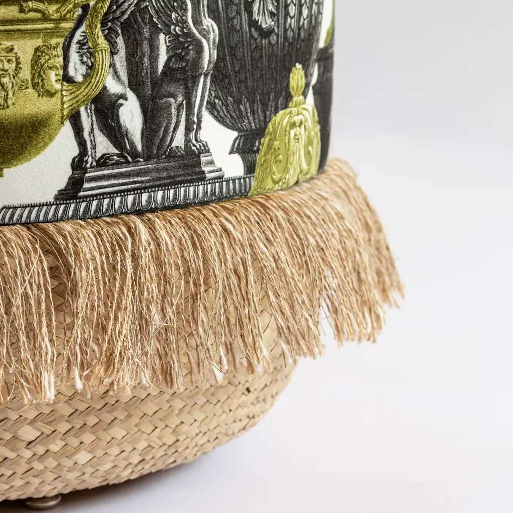 This pouf showcases the Roma design, characterized by a multitude of ancient Roman amphorae and vases in shades of yellow, white, and black. The Grand Tour poufs by Vito Nesta are a unique piece of furniture. Each pouf features a soft upper part made of printed velvet produced in the province of Como, while the structure is crafted in Veneto and distinguished by a basket base with fringes. Each pouf is circular, with a diameter of 45 cm and a height of 45 cm.