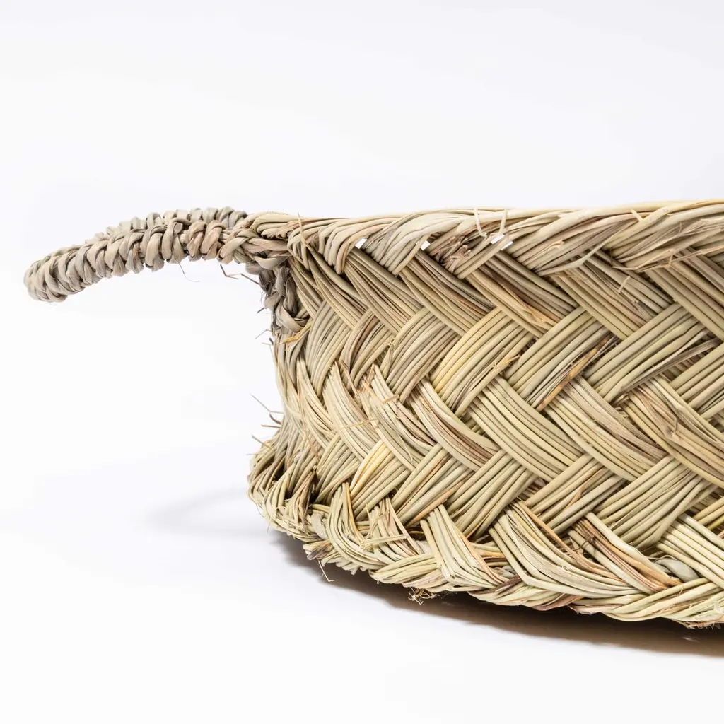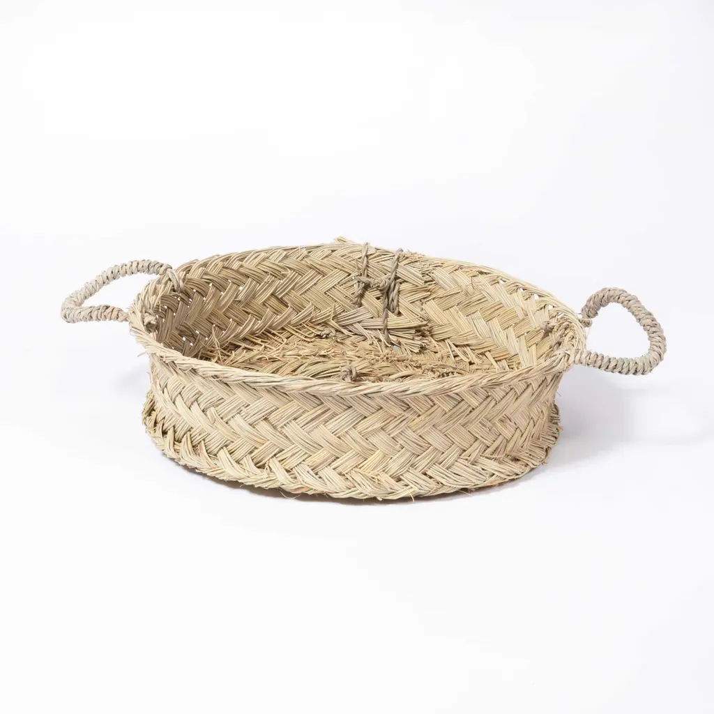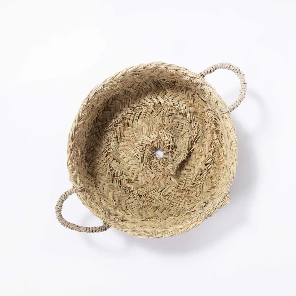 Round Two Handle Basket - Esparto Grass. Woven for us on the western coast of Morocco using the distinct coarse vegetable grass Esparto.Workshop Report:Contemporary product woven by hand in Morocco.Date:21st CenturyMaker:Handmade - MoroccoDimensions:32cm(w) x 42cm(l) x 16cm(h)
