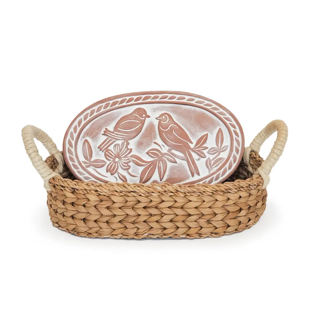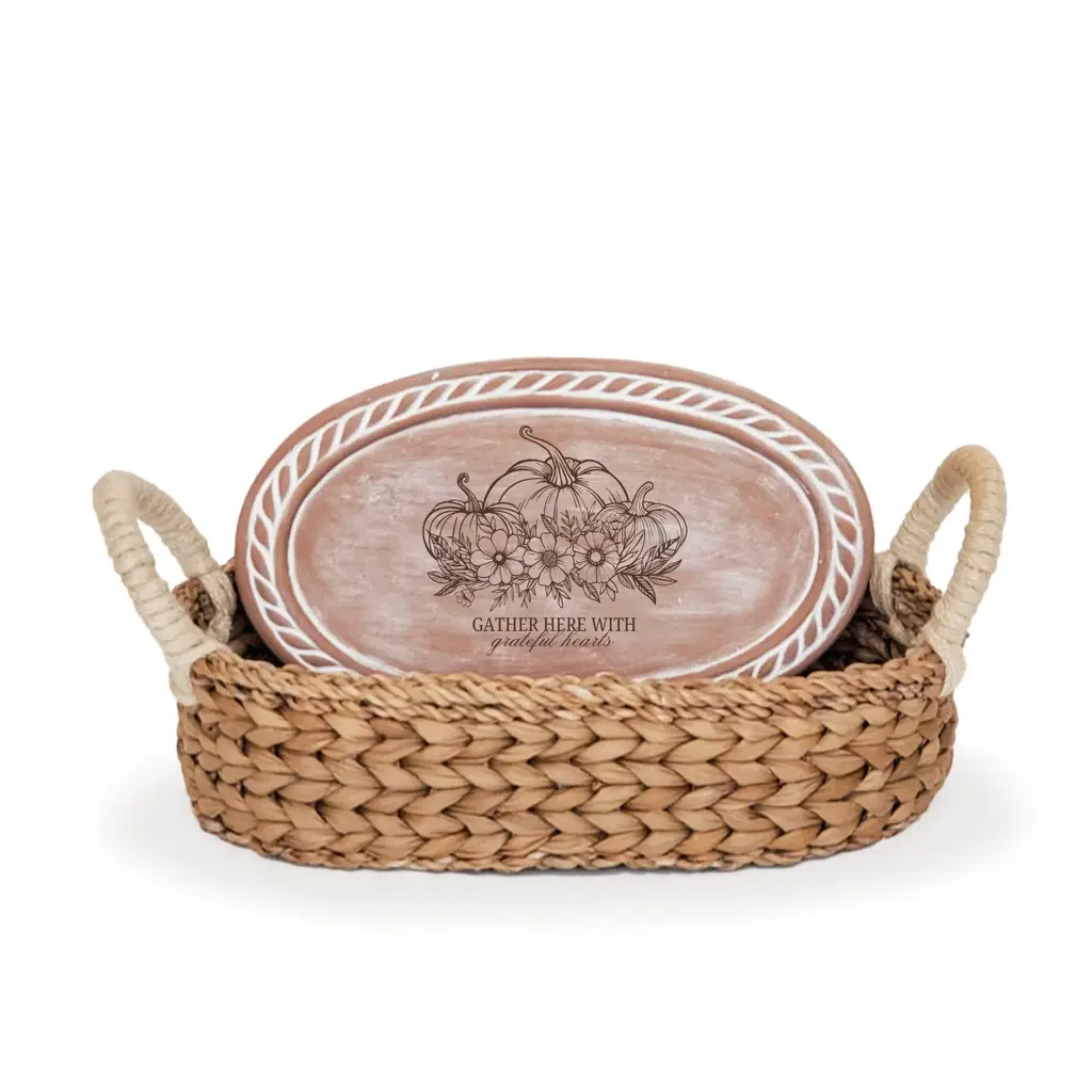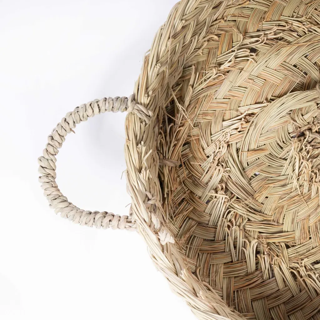 Round Two Handle Basket - Esparto Grass. Woven for us on the western coast of Morocco using the distinct coarse vegetable grass Esparto.Workshop Report:Contemporary product woven by hand in Morocco.Date:21st CenturyMaker:Handmade - MoroccoDimensions:32cm(w) x 42cm(l) x 16cm(h)