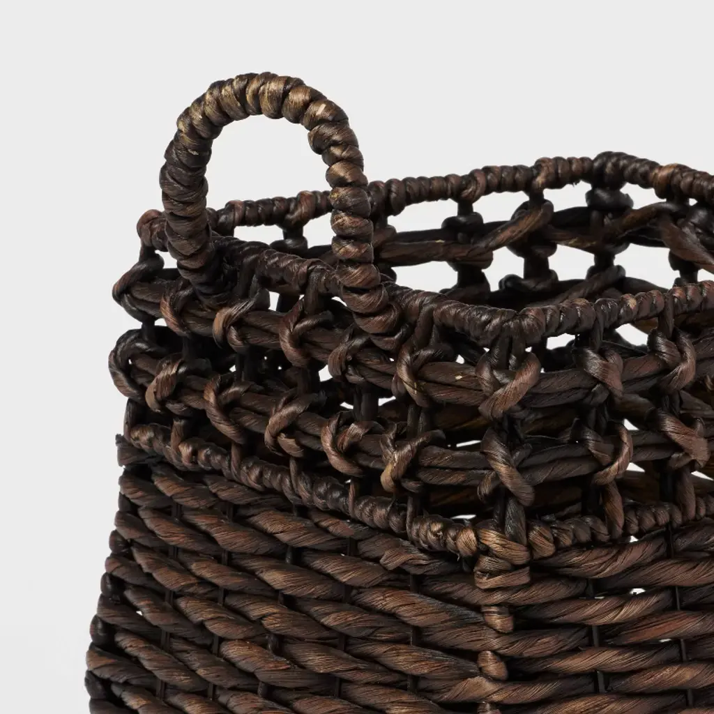 Add an appealing look to your interior decor while keeping it organized with the Rounded Square Chocolate Woven Basket with Lid from Threshold™. This square basket is made of water hyacinth and features a woven design for textured appeal that complements your decor well. It has a lid to help keep your throws, blankets, and other items nicely contained and covered, adding natural charm to your space.Threshold™: Looks like home, feels like you.