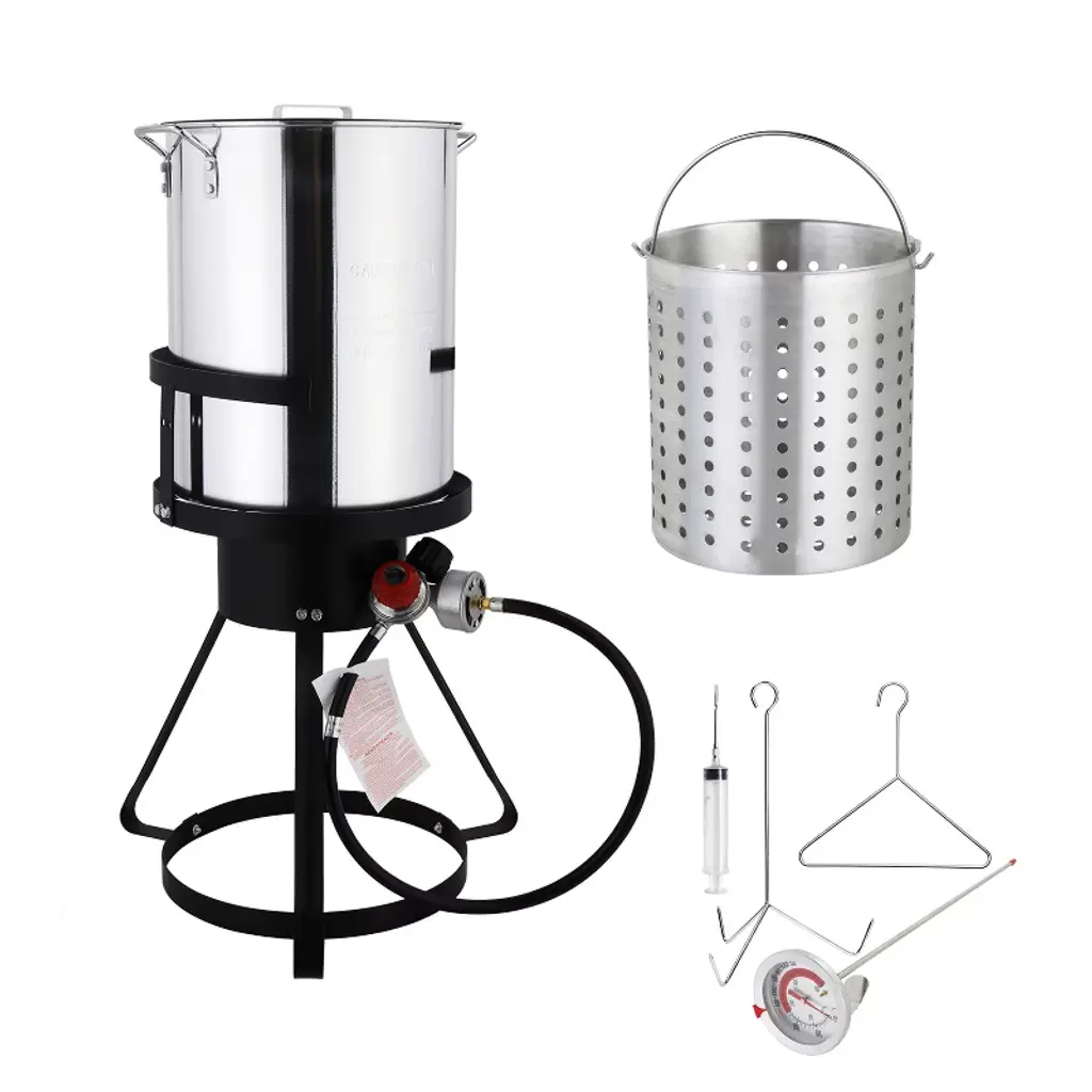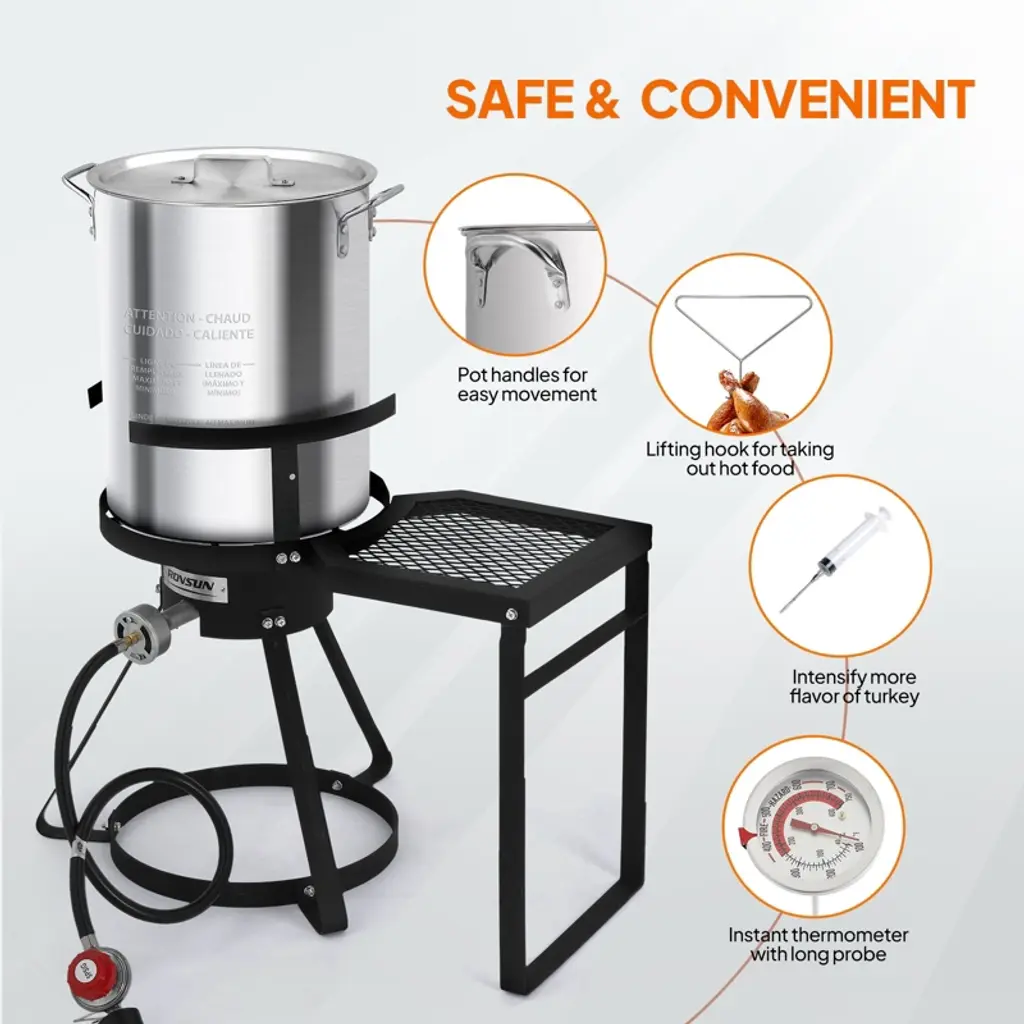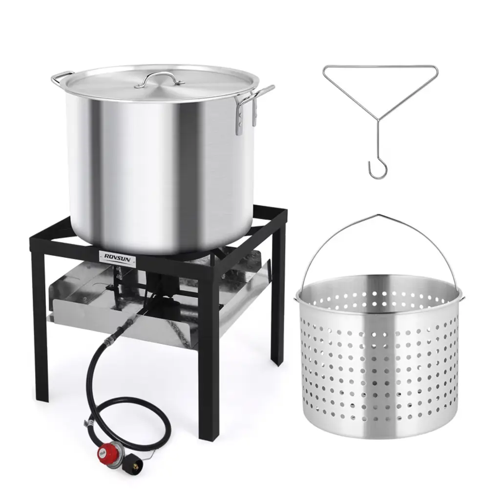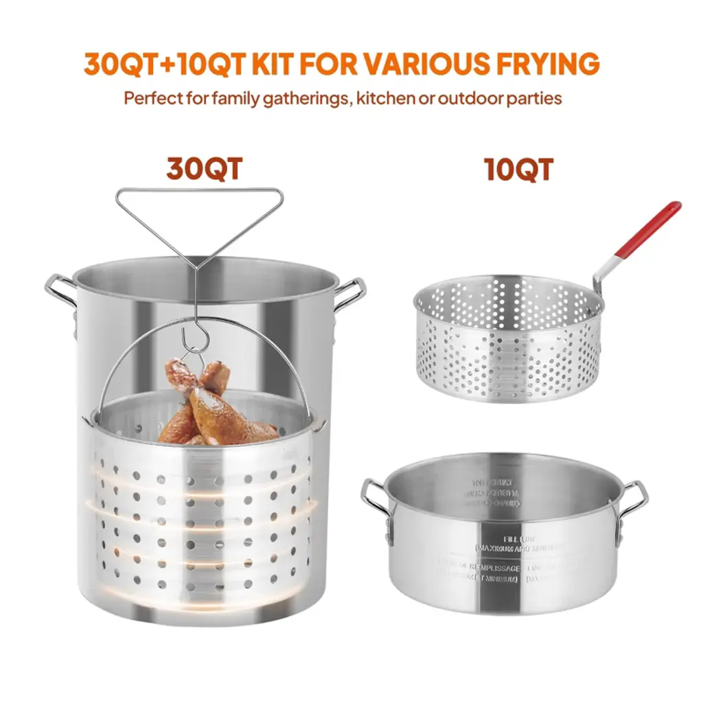 ROVSUN Turkey Fryer & Fish Fryer Kit comes with a full set of accessories for frying turkey. And its 55000BTU cast iron burner allows it to heat and cook fast. Our gas stove features a side storage rack, combining cooking functionality with convenient storage space. Tripod structure stand with base also improves its stability. What’s more, it can be used to deep fry various food, 30QT pot for frying turkey and 10QT pot for making fried fish, fried chicken wings, French fries or other small fried food. Perfect for gatherings, celebrations, or simply enjoying delicious homemade fried dishes. Elevate your outdoor cooking today with this versatile and powerful fryer kit! Features: 1. Turkey fryer & fish fryer combo kit for frying various food 2. 55000BTU cast iron burner for quick heating and fast cooking 3. Full set of accessories for frying turkey 4. Four legs steel stand for better support and stability 5. Side storage rack keeps utensils and ingredients within easy reach 6. Simple construction and easy assembly Specifications: 1. Brand: ROVSUN 2. Materials: aluminum, steel 3. Burner BTU Rating: 55000BTU 4. Regulator: 5PSI 5. 30QT Pot Dimension: 12.2” Dia. X 15.75”H 6. 10QT Pot Dimension: 12.8” Dia. X 4.92”H 7. Stand Dimension: 24”L X 10.87”W X 17”H 8. Overall Dimensions: 24”L X 10.87”W X 32”H 9. Weight:19.2 LB 10. Assembly Required: Yes Package Includes: 1 X 30QT Frying Pot w/ Basket 1 X 10QT Frying Pot w/ Basket 1 X Burner w/ Stand & Shelf 1 X Regulator w/ Hose 1 X Lid 1 X Marinade Injector 1 X Thermometer 1 X Poultry Rack 3 X Metal Skewer 1 X Rack Lifter