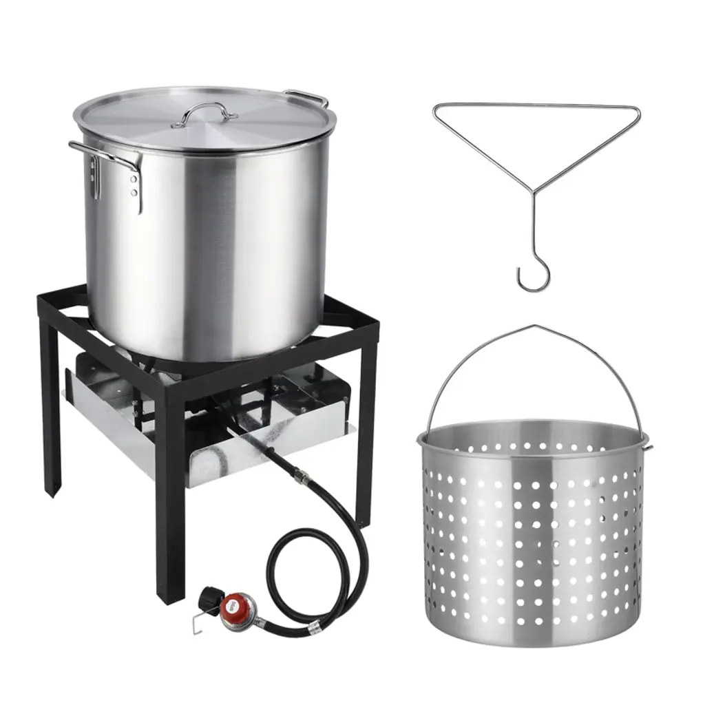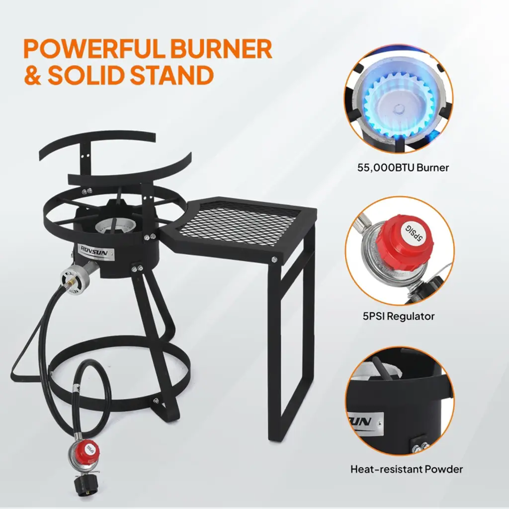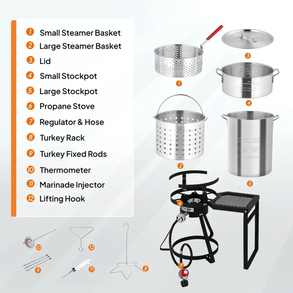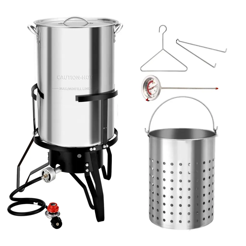 ROVSUN Turkey Fryer & Fish Fryer Kit comes with a full set of accessories for frying turkey. And its 55000BTU cast iron burner allows it to heat and cook fast. Our gas stove features a side storage rack, combining cooking functionality with convenient storage space. Tripod structure stand with base also improves its stability. What’s more, it can be used to deep fry various food, 30QT pot for frying turkey and 10QT pot for making fried fish, fried chicken wings, French fries or other small fried food. Perfect for gatherings, celebrations, or simply enjoying delicious homemade fried dishes. Elevate your outdoor cooking today with this versatile and powerful fryer kit! Features: 1. Turkey fryer & fish fryer combo kit for frying various food 2. 55000BTU cast iron burner for quick heating and fast cooking 3. Full set of accessories for frying turkey 4. Four legs steel stand for better support and stability 5. Side storage rack keeps utensils and ingredients within easy reach 6. Simple construction and easy assembly Specifications: 1. Brand: ROVSUN 2. Materials: aluminum, steel 3. Burner BTU Rating: 55000BTU 4. Regulator: 5PSI 5. 30QT Pot Dimension: 12.2” Dia. X 15.75”H 6. 10QT Pot Dimension: 12.8” Dia. X 4.92”H 7. Stand Dimension: 24”L X 10.87”W X 17”H 8. Overall Dimensions: 24”L X 10.87”W X 32”H 9. Weight:19.2 LB 10. Assembly Required: Yes Package Includes: 1 X 30QT Frying Pot w/ Basket 1 X 10QT Frying Pot w/ Basket 1 X Burner w/ Stand & Shelf 1 X Regulator w/ Hose 1 X Lid 1 X Marinade Injector 1 X Thermometer 1 X Poultry Rack 3 X Metal Skewer 1 X Rack Lifter
