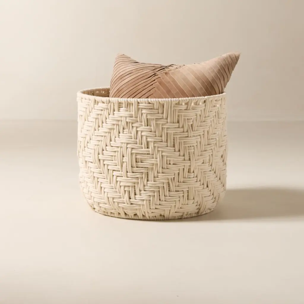 Warm white cotton rope is woven by hand to create a generously sized storage basket. The tight, geometric weave and hidden iron frame keeps things neat with soft, touchable texture. CB2 exclusive.