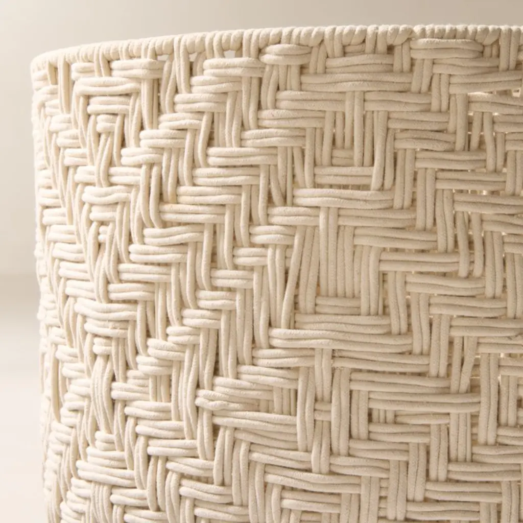 Warm white cotton rope is woven by hand to create a generously sized storage basket. The tight, geometric weave and hidden iron frame keeps things neat with soft, touchable texture. CB2 exclusive.