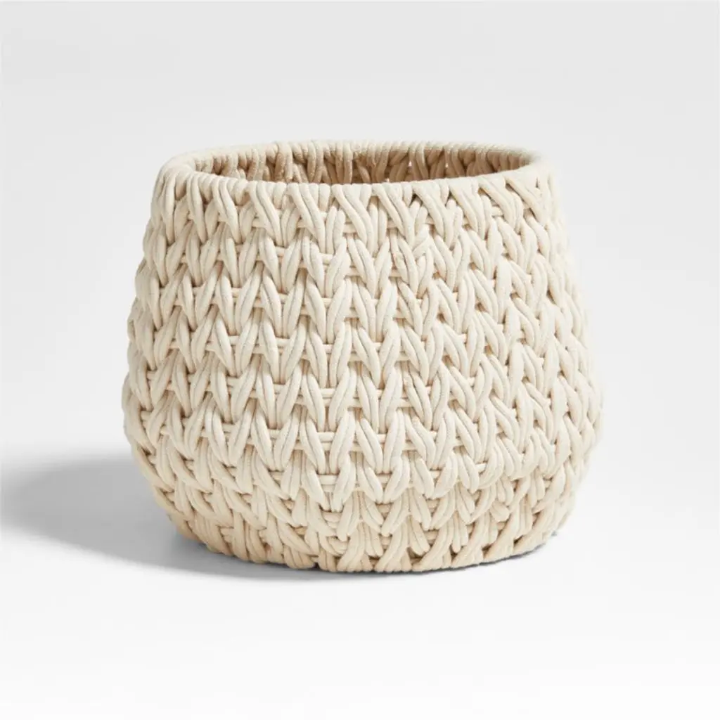 Coziness squared. Creamy cotton rope knits a structured soft storage basket ideal for corralling throw blankets. The chunky weave is as irresistible as a well-loved sweater, and the hidden iron frame keeps the look neat yet touchable. Our medium Rulon tote effortlessly wrangles toys, knitting supplies, guest towels and morewe especially love using it to upgrade a potted plant.