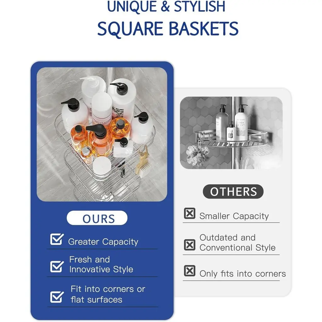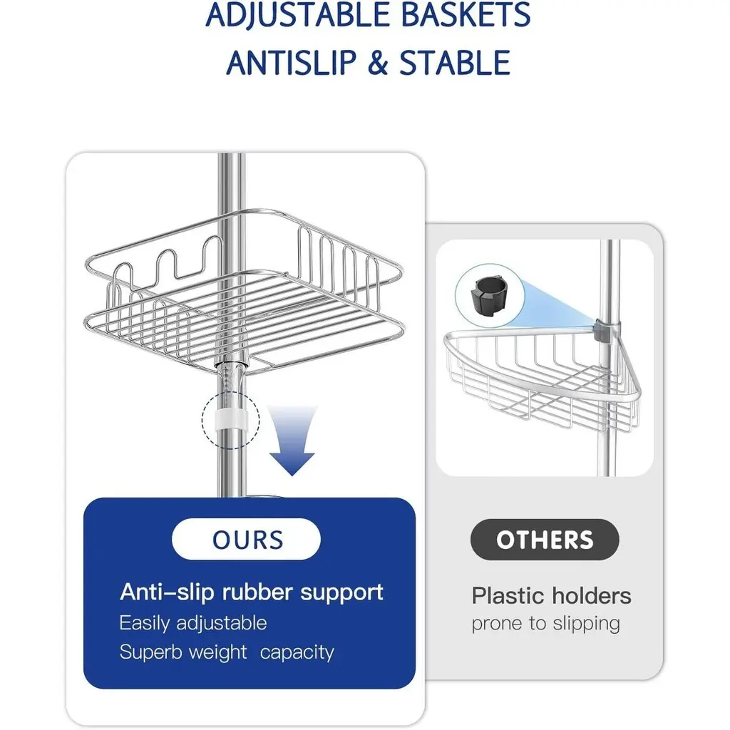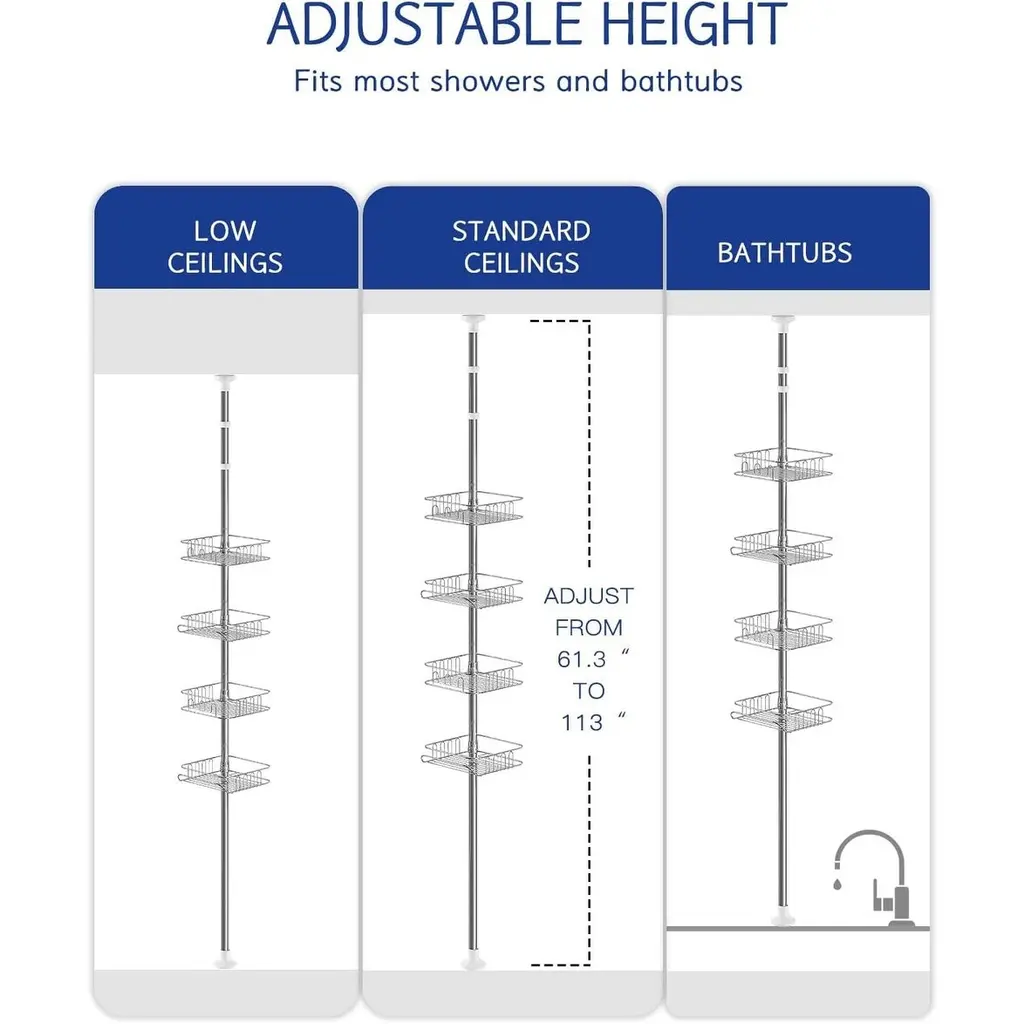 Style:ModernNumber of Shelves:4Assembly Required:YesFinish:Stainless SteelSpecial Feature:Rust ResistantMaximum Weight Capacity:10 PoundsProduct Dimensions:7.6"D x 7.6"W x 113"HProduct Care Instructions:Wipe with Dry ClothRecommended Uses For Product:Shower storage and organizationIncluded Components:pole, baskets, foot cap, manualFurniture Finish:Stainless SteelInstallation Type:FreestandingRUSTPROOF MATERIAL- This shower caddy is made of stainless steel for both poles and baskets. It can last for yearsSTABLE & SECURE - This shower organizer used larger pole and it is more solid than others, very strong and sturdy once located in placeNICE APPEARANCE - Different than the traditional triangle shape, this one designed with square type and looks very pretty on your shower room. Yes it can be used in the corner or turn baskets so it's flat against the shower wallFIT MOST SHOWERS - You can use this tension shelf on any of place as long as your shower place height is between 61.3 to 113 Inch, no need to bother you to cut the rod. (Note: This shower caddy set is not designed for sloped ceilings.)LARGE STORAGE CAPACITY - Each shelf can storage 5 large 17oz pump bottles and some small bottles. Ideal for contain bath supplies like shampoo bottles, soap, conditioner, body wash, towel bar, hook razor, loofah and more