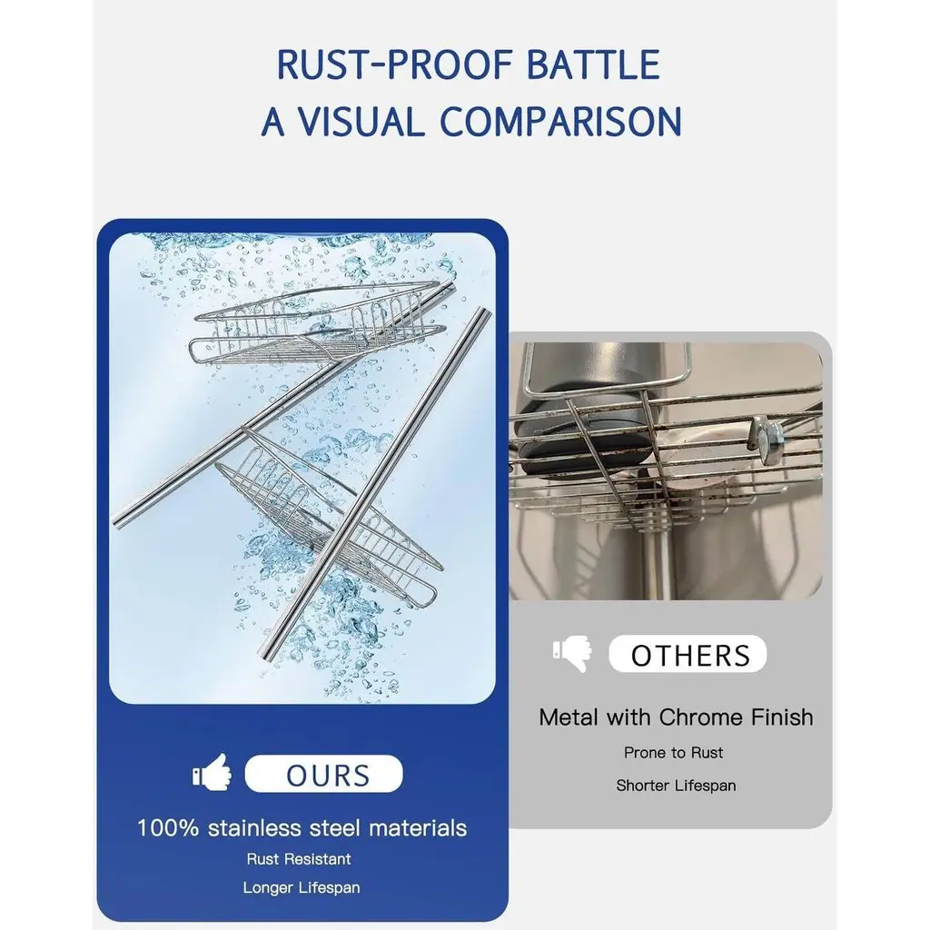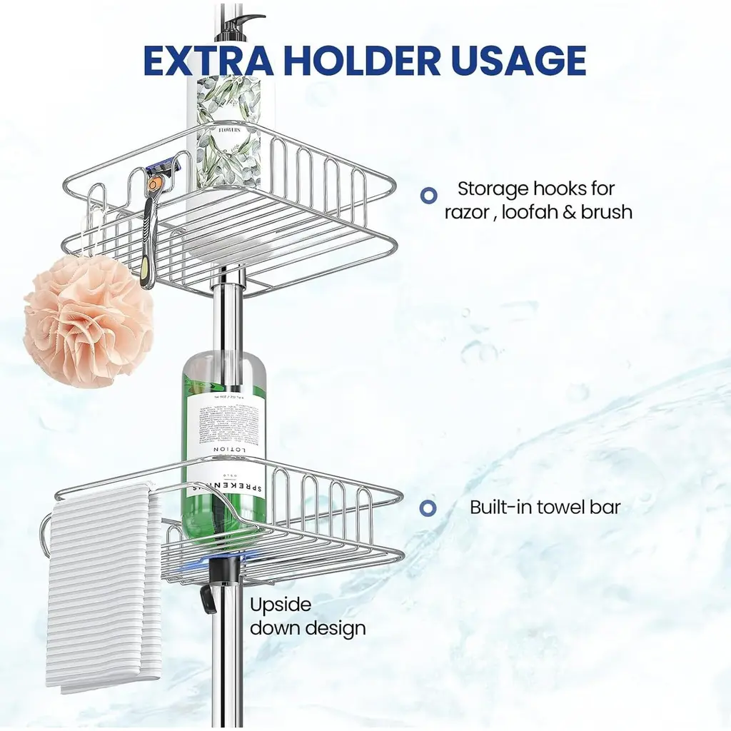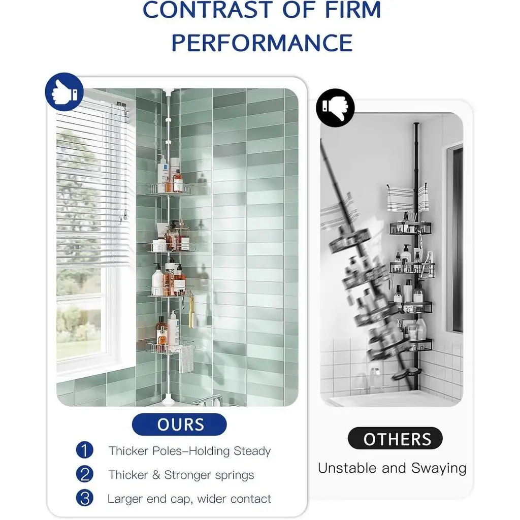 Style:ModernNumber of Shelves:4Assembly Required:YesFinish:Stainless SteelSpecial Feature:Rust ResistantMaximum Weight Capacity:10 PoundsProduct Dimensions:7.6"D x 7.6"W x 113"HProduct Care Instructions:Wipe with Dry ClothRecommended Uses For Product:Shower storage and organizationIncluded Components:pole, baskets, foot cap, manualFurniture Finish:Stainless SteelInstallation Type:FreestandingRUSTPROOF MATERIAL- This shower caddy is made of stainless steel for both poles and baskets. It can last for yearsSTABLE & SECURE - This shower organizer used larger pole and it is more solid than others, very strong and sturdy once located in placeNICE APPEARANCE - Different than the traditional triangle shape, this one designed with square type and looks very pretty on your shower room. Yes it can be used in the corner or turn baskets so it's flat against the shower wallFIT MOST SHOWERS - You can use this tension shelf on any of place as long as your shower place height is between 61.3 to 113 Inch, no need to bother you to cut the rod. (Note: This shower caddy set is not designed for sloped ceilings.)LARGE STORAGE CAPACITY - Each shelf can storage 5 large 17oz pump bottles and some small bottles. Ideal for contain bath supplies like shampoo bottles, soap, conditioner, body wash, towel bar, hook razor, loofah and more