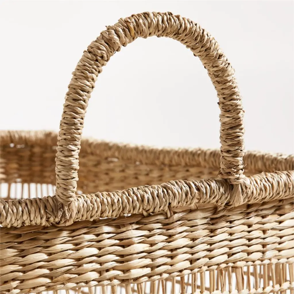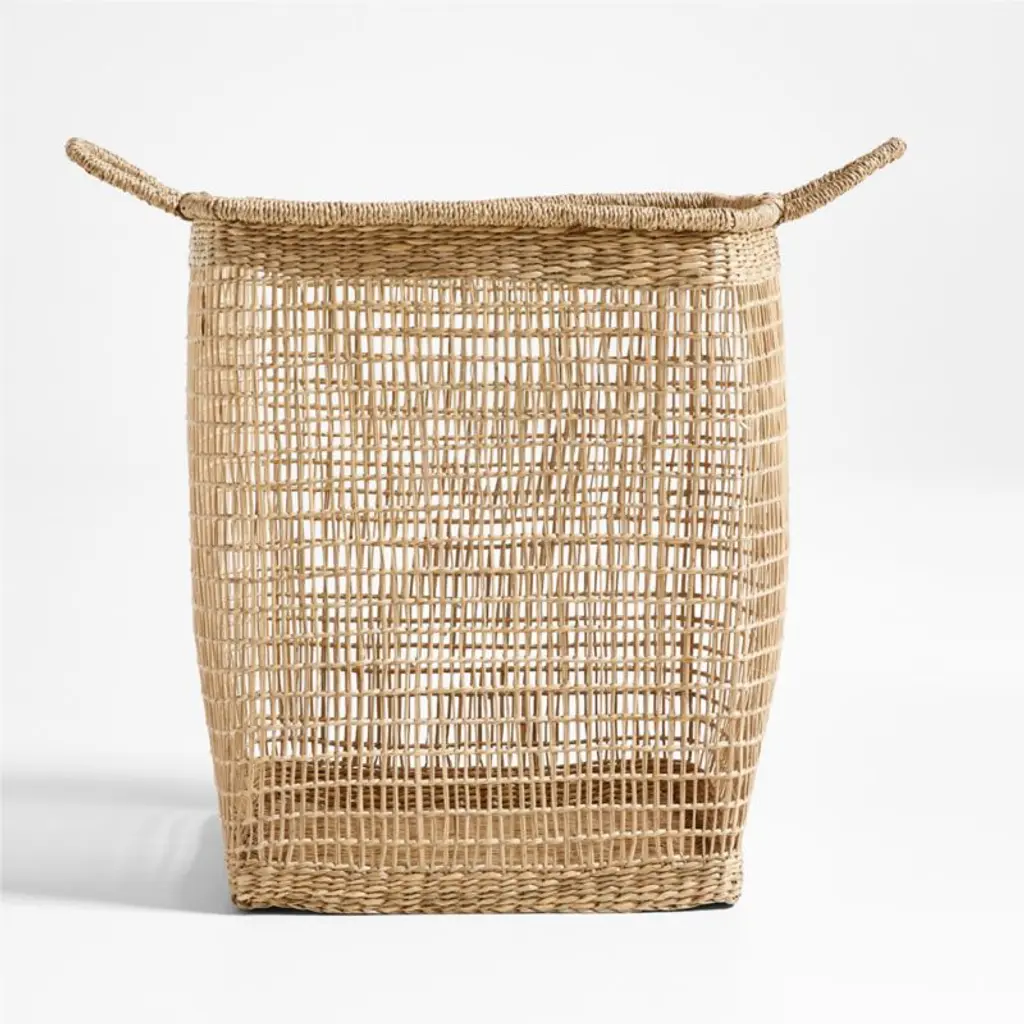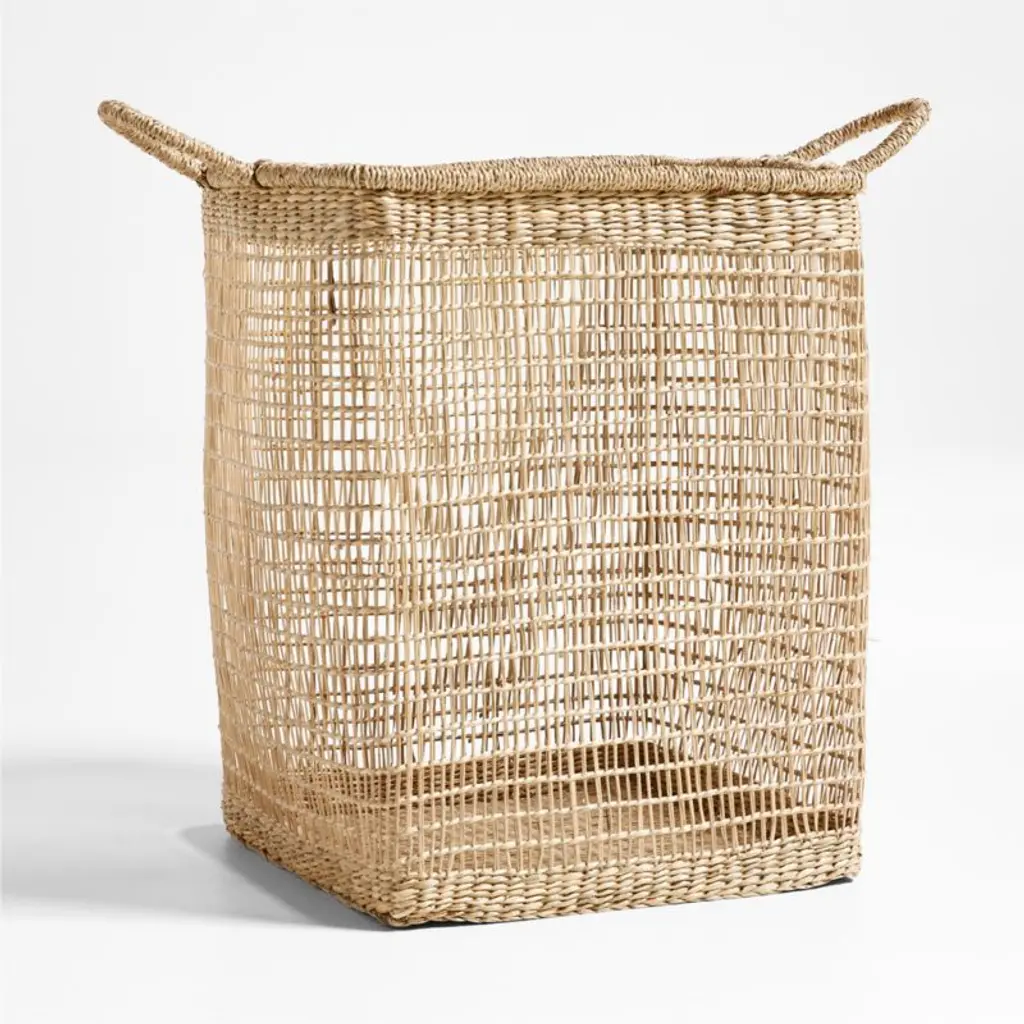 The open weave of our Rybak basket provides a glimpse of the throw blankets, scarves, guest towels or whatever you choose to store within. Woven of natural seagrass, the medium square basket adds an airy and sophisticated presenceas well as useful storagethroughout the home. Pair with the larger blanket basket to corral essentials with a cohesive look.