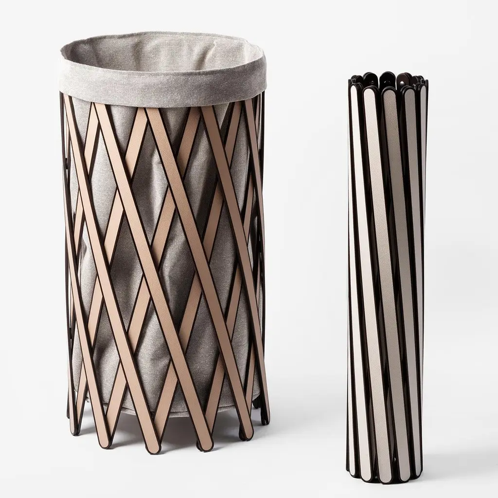 An elegant addition to any bedroom or bathroom decor, this foldable hamper boasts a stylish leather grid of flat wooden sticks covered with beige leather framing the natural canvas removable bag. Both frame and bag are available in other colors.