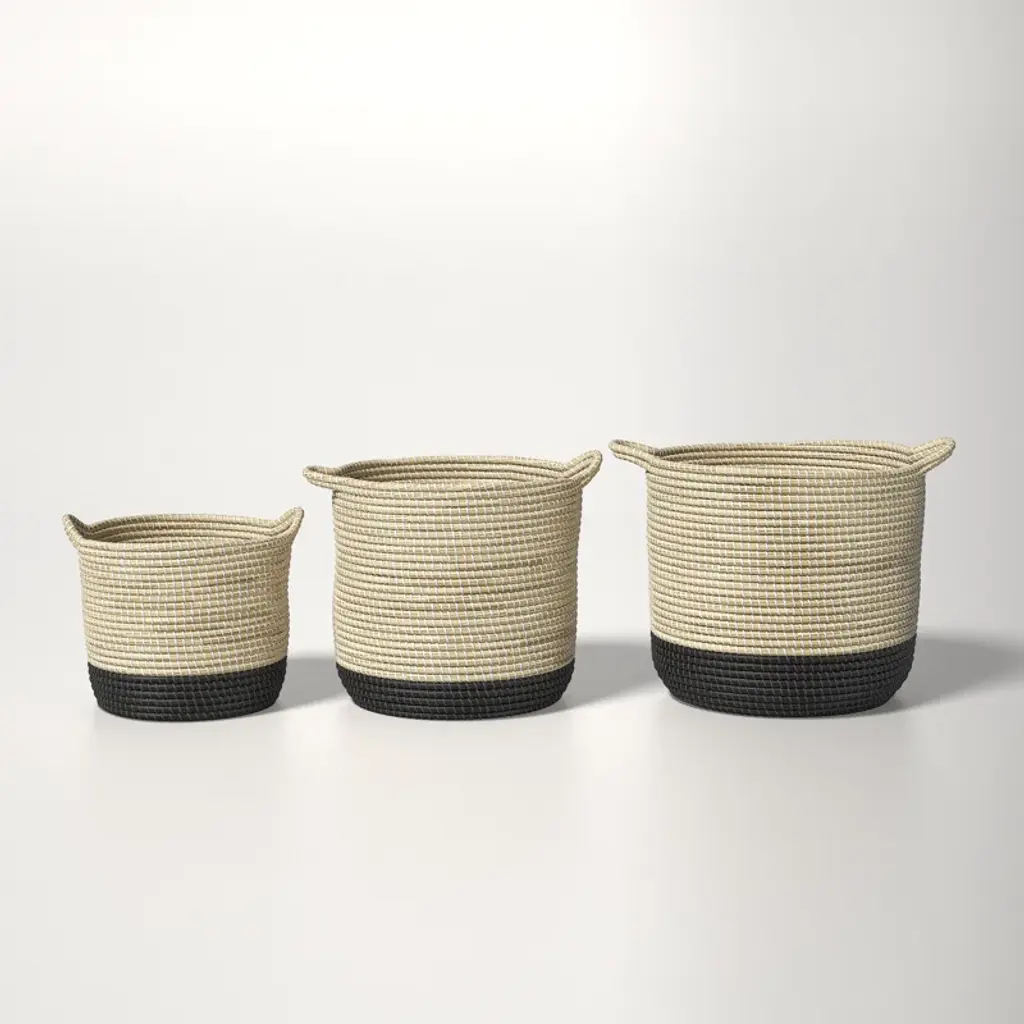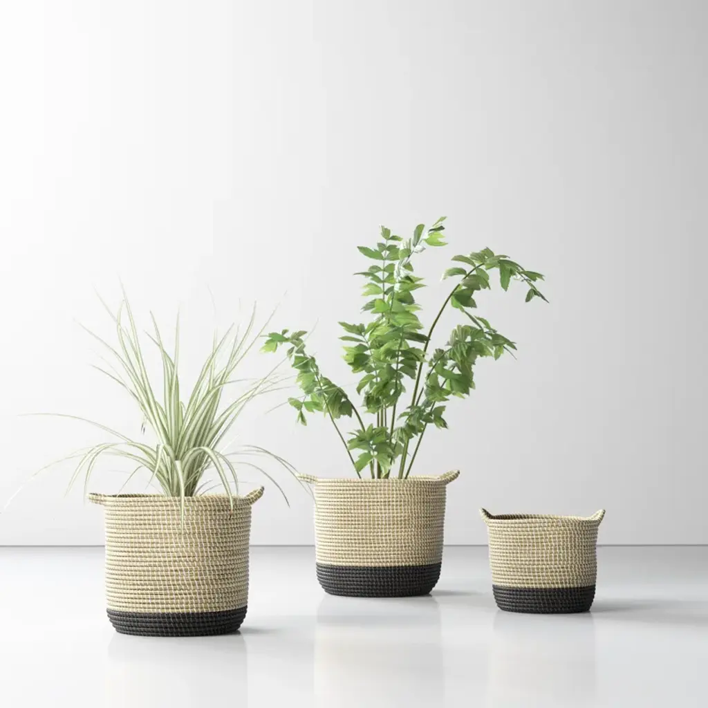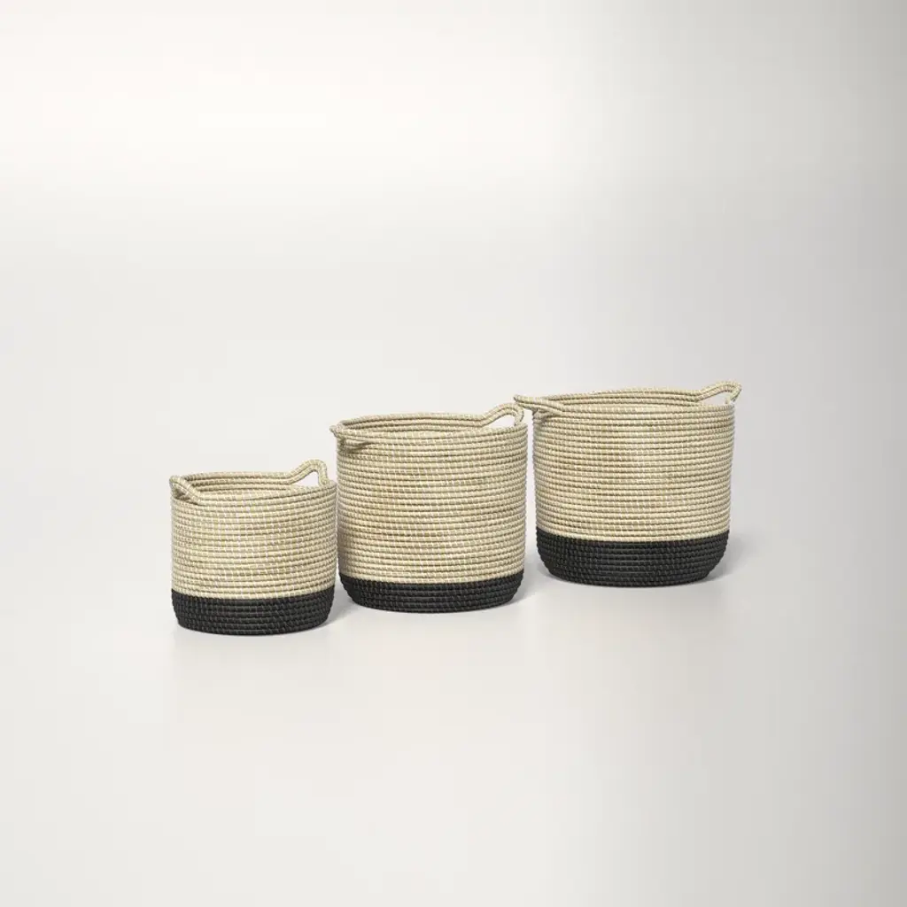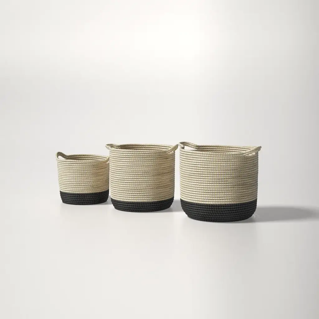 The Salazar baskets measure 13.8L x 13.8W x 15.0H. The Salazar baskets are carefully crafted in a woven pattern, and are finished in a light brown warm tone, with black dipped bottoms. These baskets give the feeling of being somewhere warm and tropical, with their beautiful weaving detail and warm toned colors, they suit coastal and tropical styled spaces and are a instant head turner.