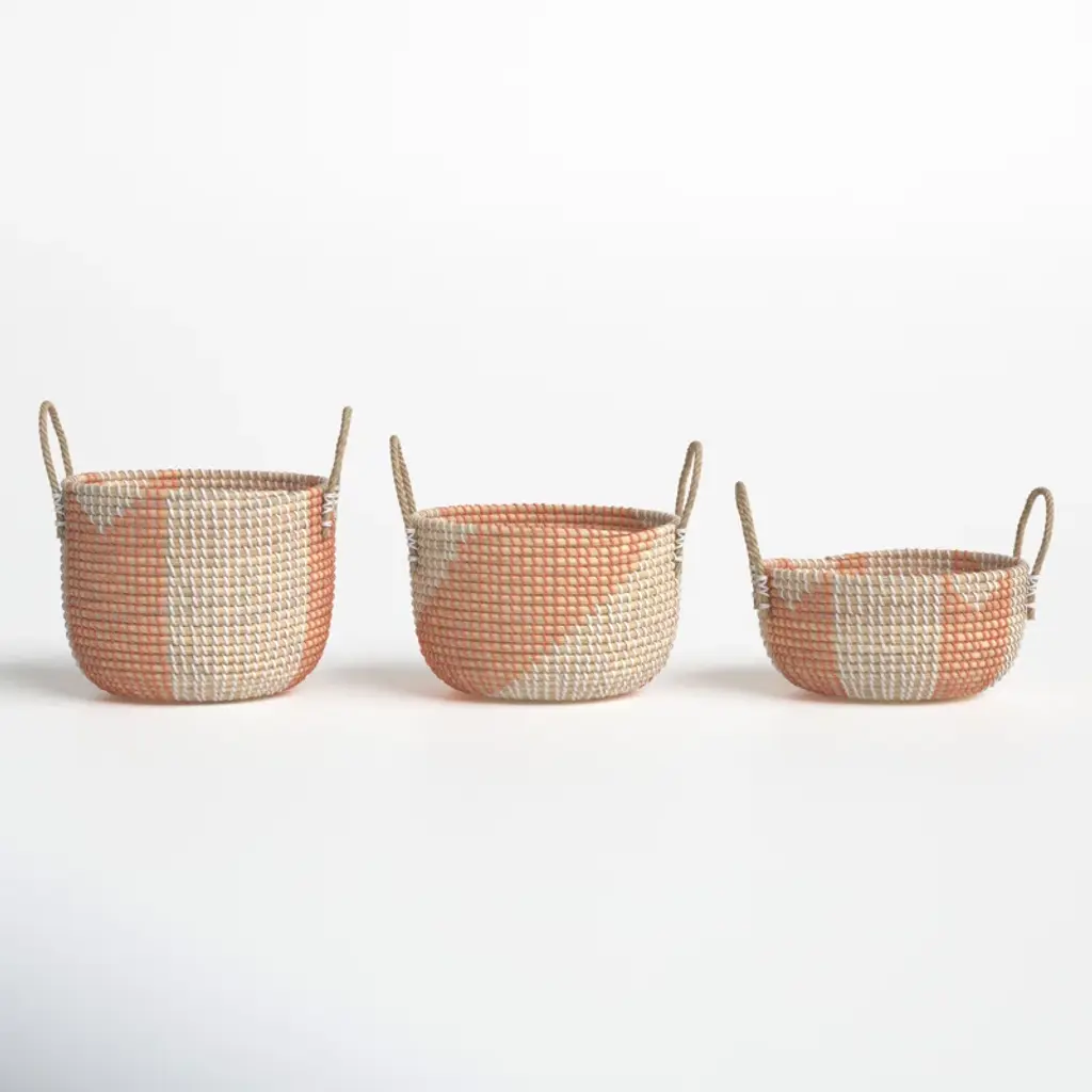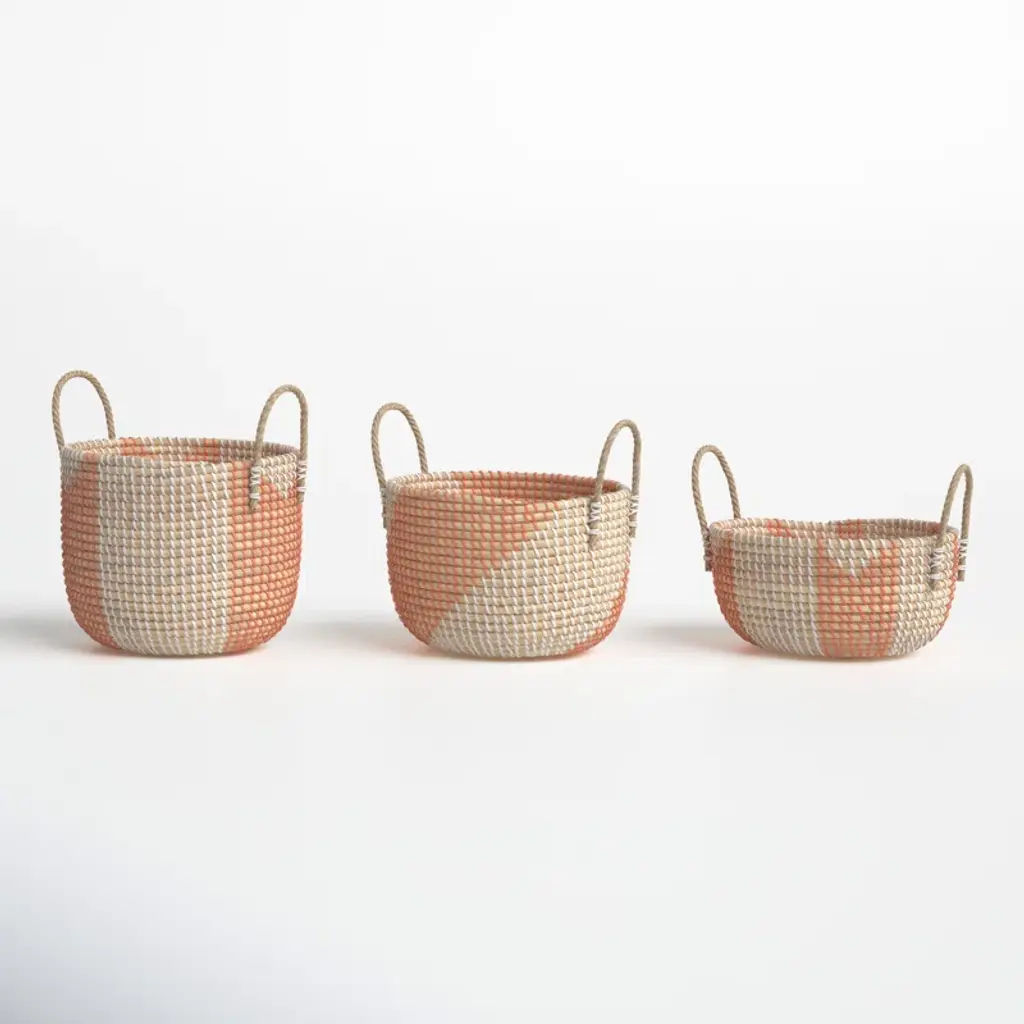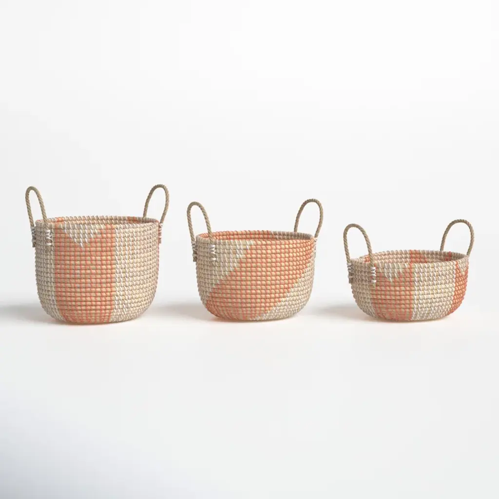 Set of three sturdy yet fashionable seagrass baskets in fresh shades of natural and orange with crisp white stitching and seagrass handles