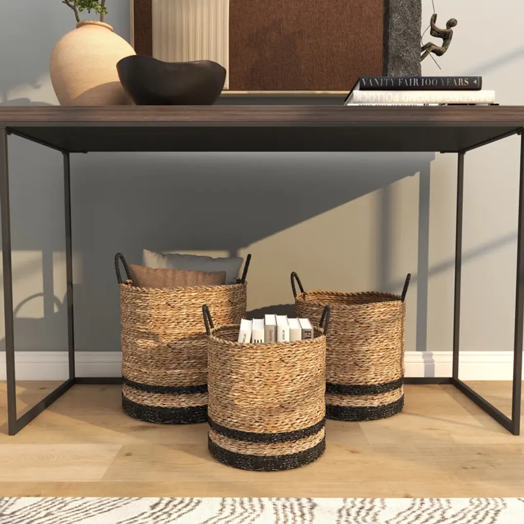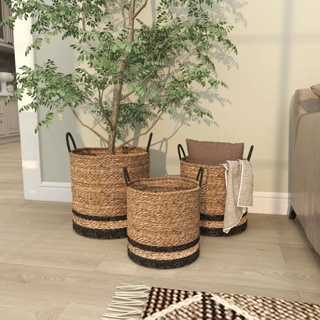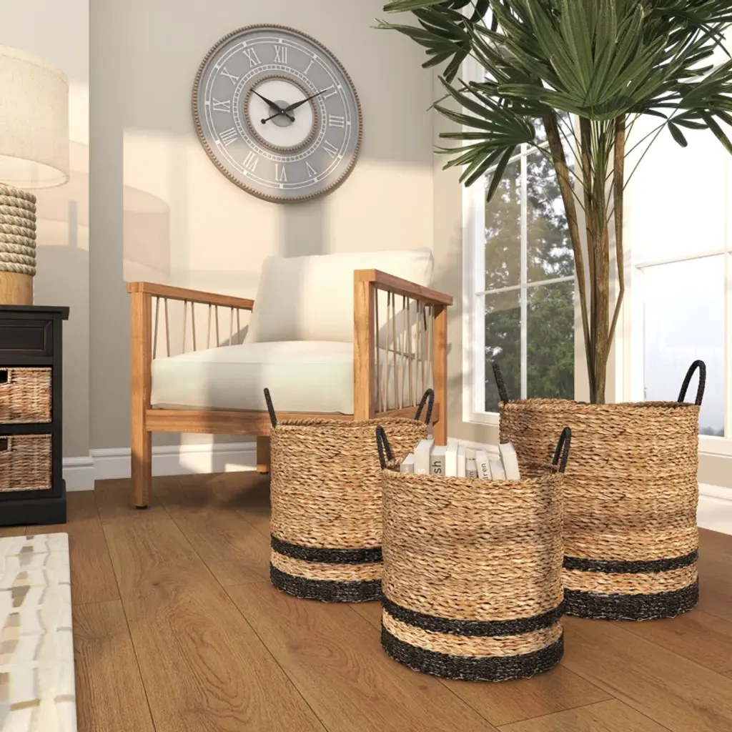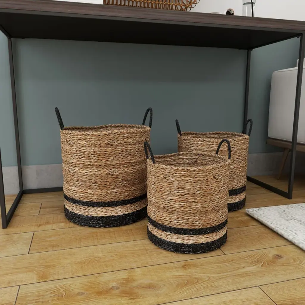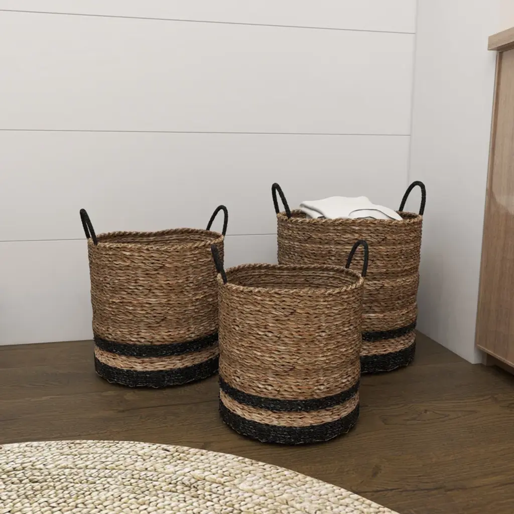 Give organizing a playful twist with these striped seagrass storage basket that would complement your modern home space. This item ships in 1 carton. Due to the handmade nature of these, there will be slight color, shape, and size variations, as well as loose fibers. Suitable for indoor use only. This item ships fully assembled in one piece. Maximum weight limit is 5 lbs. Made in Vietnam. This black colored basket organizer comes as a set of 3. Modern style.