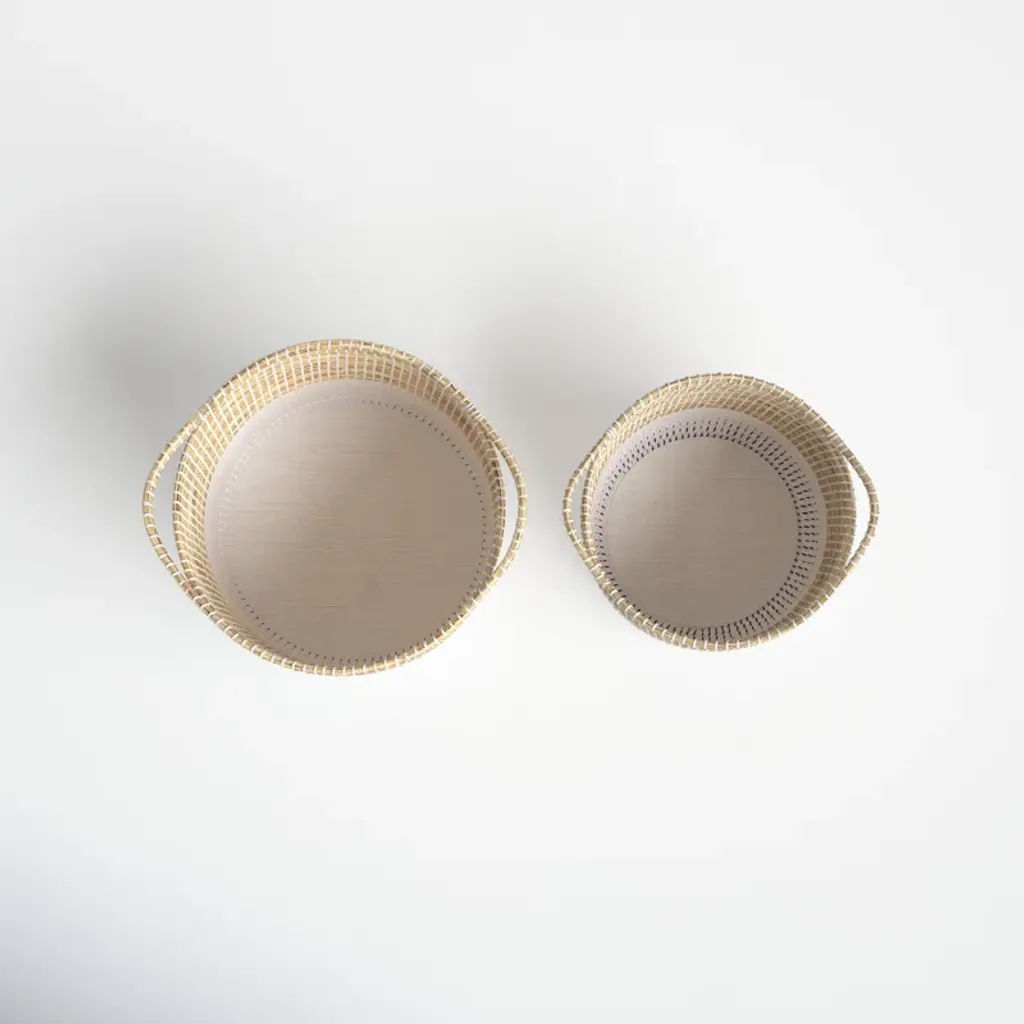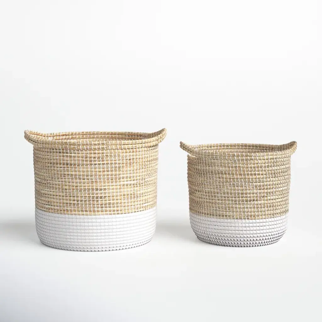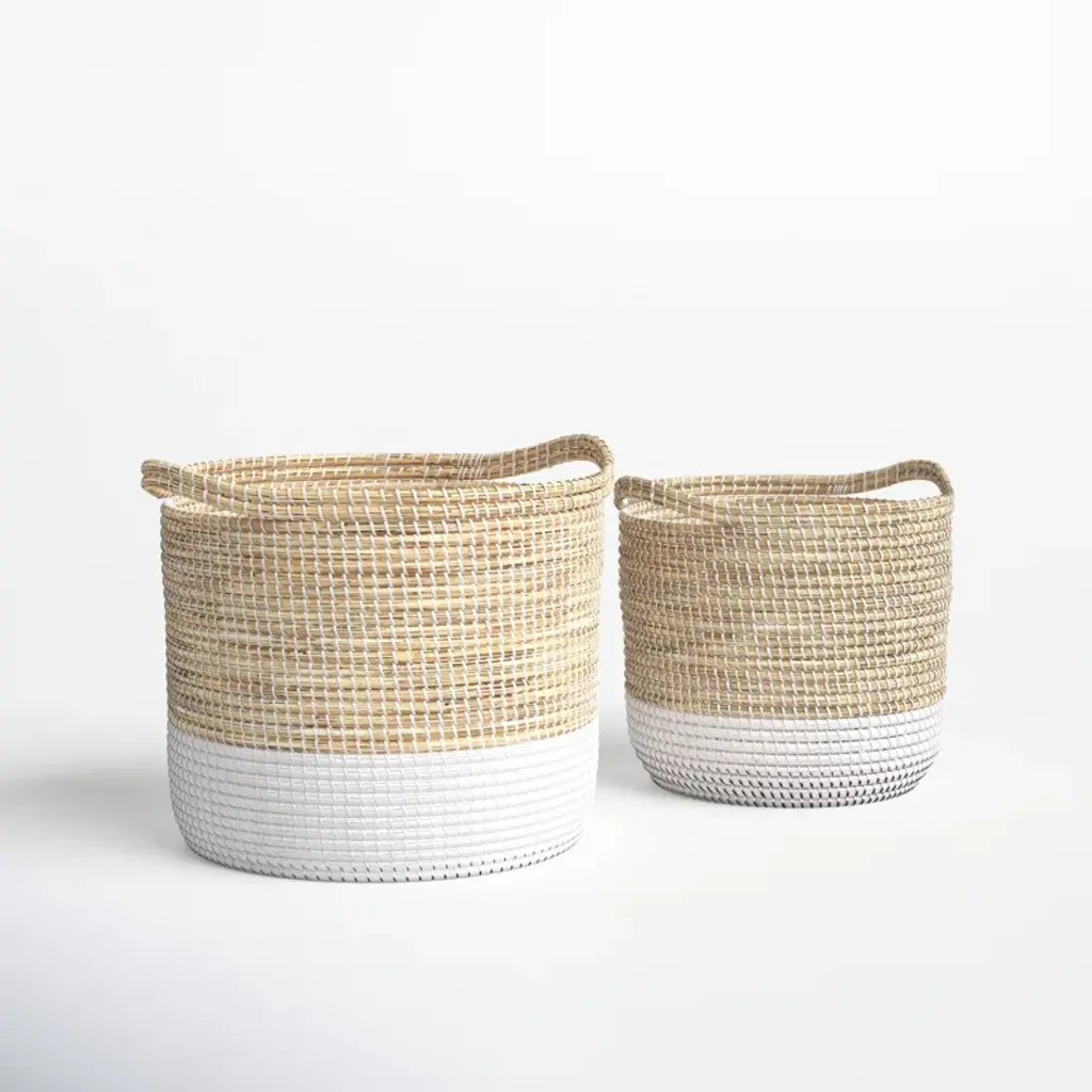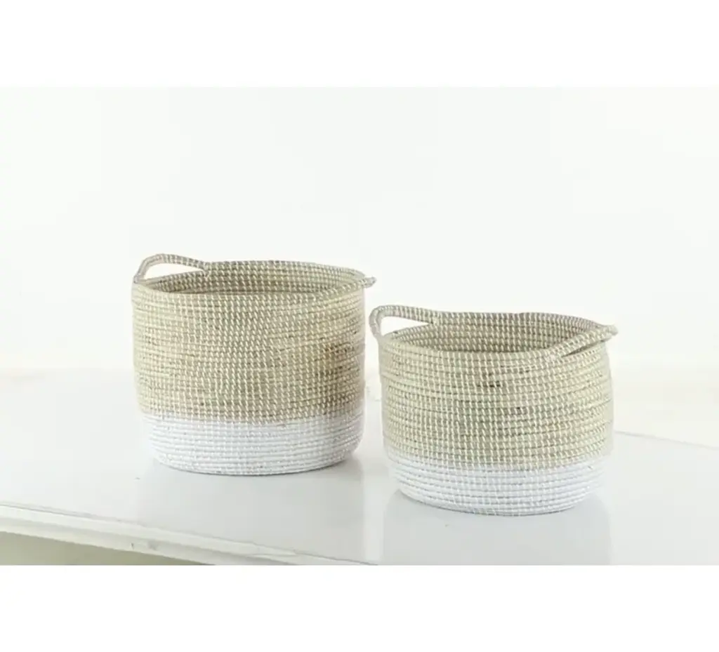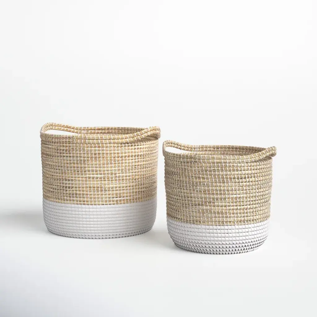 Go all-natural with this 2-piece set of baskets, which are ideal for storage and organization in almost any room. Each piece is made from hand-woven seagrass and hand-woven braided fibers to create a non-collapsible, robust body. The neutral brown and white color palette is easy to pair with almost anything, while the convenient handles make it easy and convenient to carry them to wherever they're needed. Best of all, these baskets are nestable for easy storage when you're not using them.