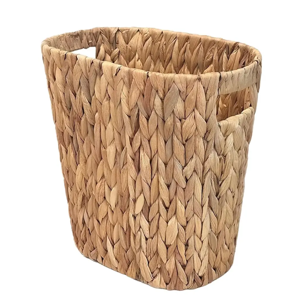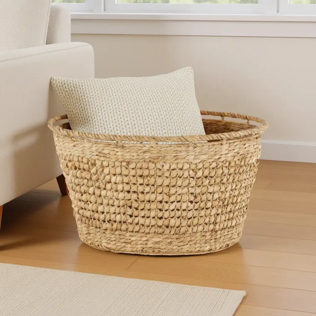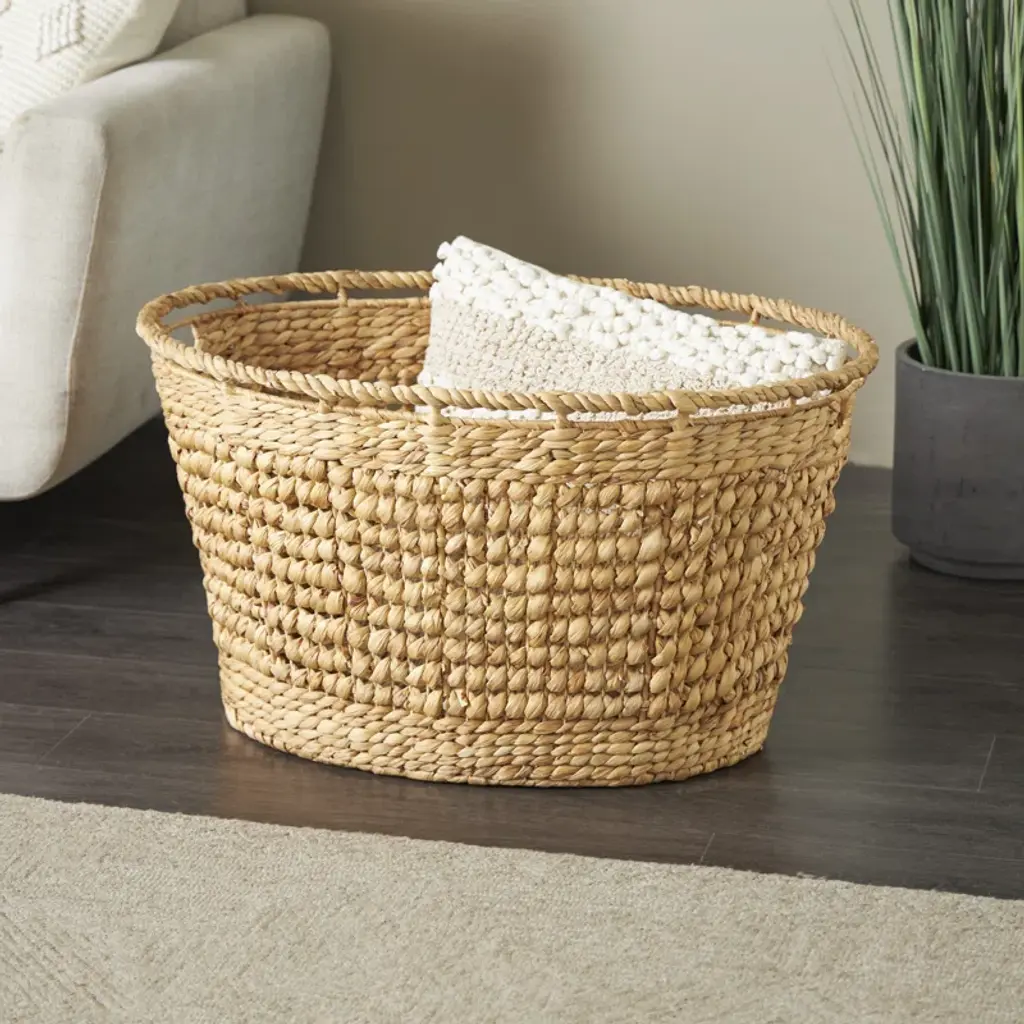 Seagrass Handmade Woven Oval Storage Basket With Elevated Rim And Slot Handles