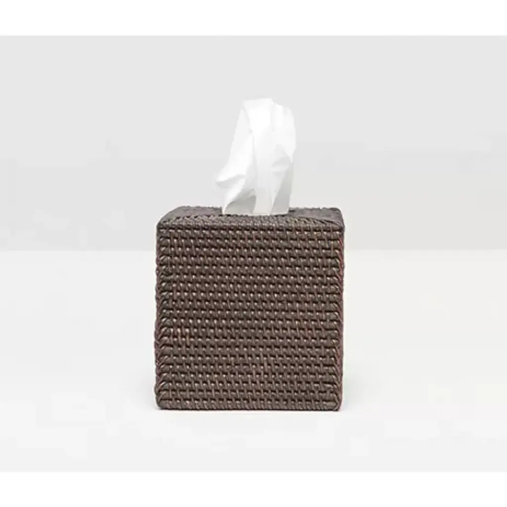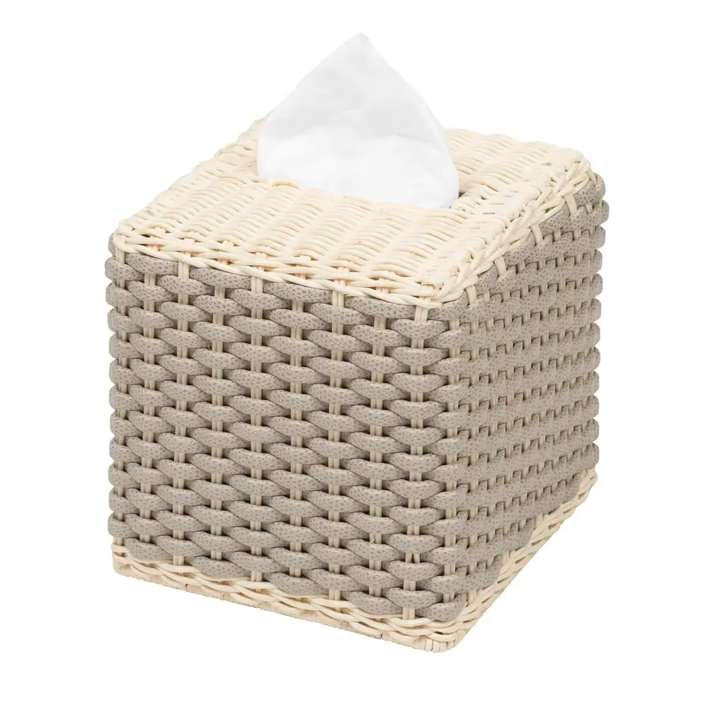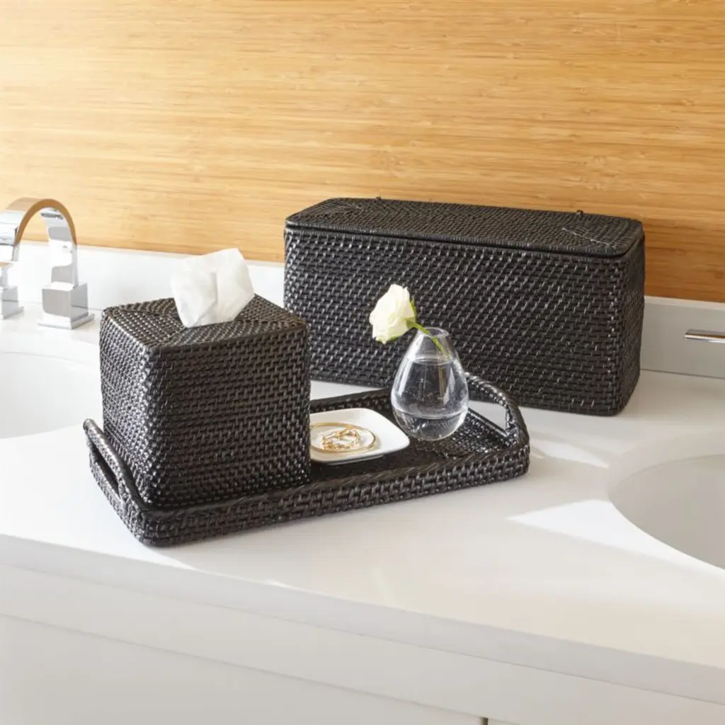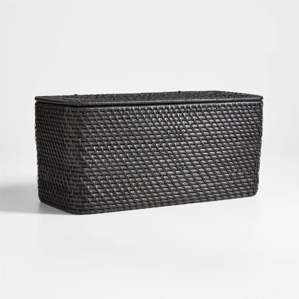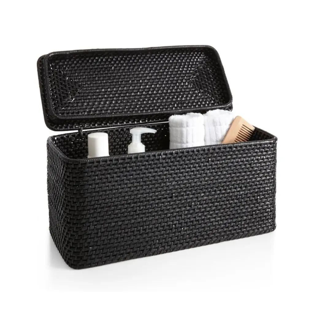 This rounded rectangle of a tote keeps a lid on bathroom storage. Handwoven of sturdy rattan and finished in black, the lidded tote conceals toilet paper rolls and other bathroom essentials or offers up towels, robes and bottles of water in the guest room. Complete the look with other black bath accessories in our exclusive Sedona collection.