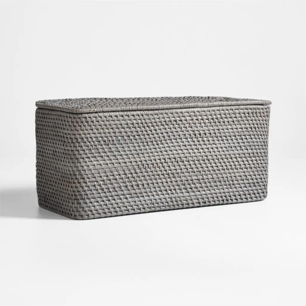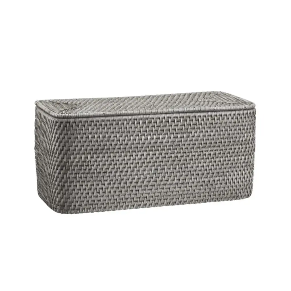 Rounded rectangle keeps a lid on toilet paper rolls or bathing sundries with loads of texture, handwoven of sturdy rattan and finished in warm grey. Our lidded tote conceals essentials in the bathroom, or offers up towels, slippers, eye masks and bottles of water in the guest room. Complete the look with our other Sedona grey bath accessories. Due to its handcrafted nature, each one will be slightly unique.