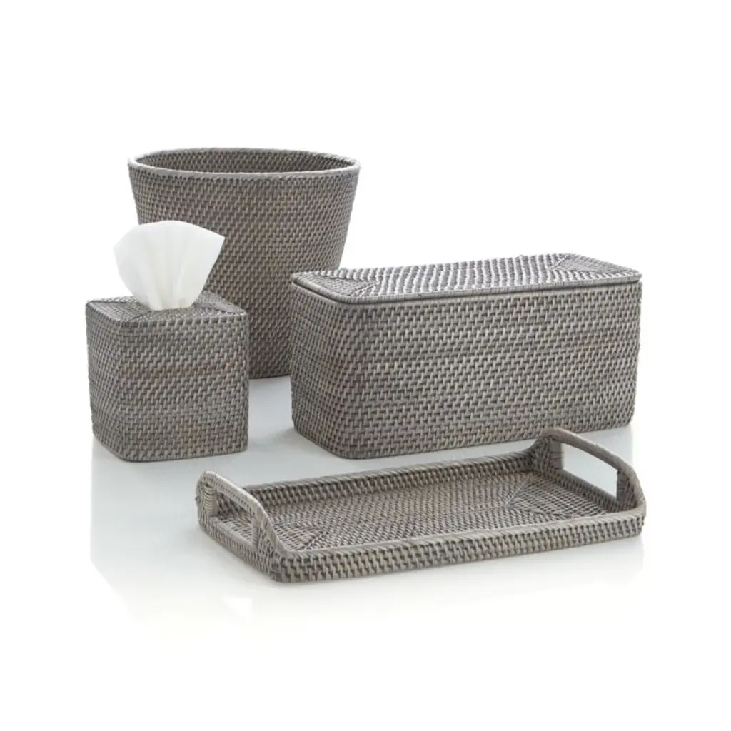 Rounded rectangle keeps a lid on toilet paper rolls or bathing sundries with loads of texture, handwoven of sturdy rattan and finished in warm grey. Our lidded tote conceals essentials in the bathroom, or offers up towels, slippers, eye masks and bottles of water in the guest room. Complete the look with our other Sedona grey bath accessories. Due to its handcrafted nature, each one will be slightly unique.