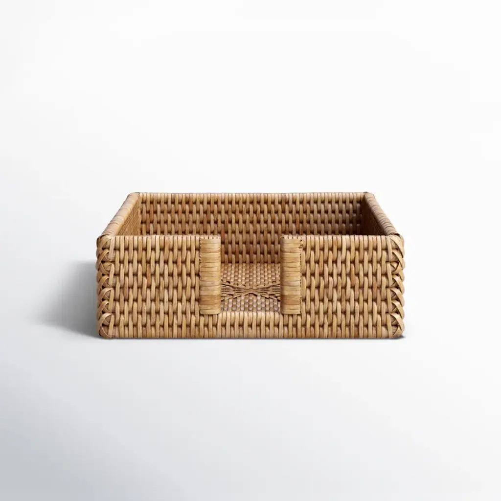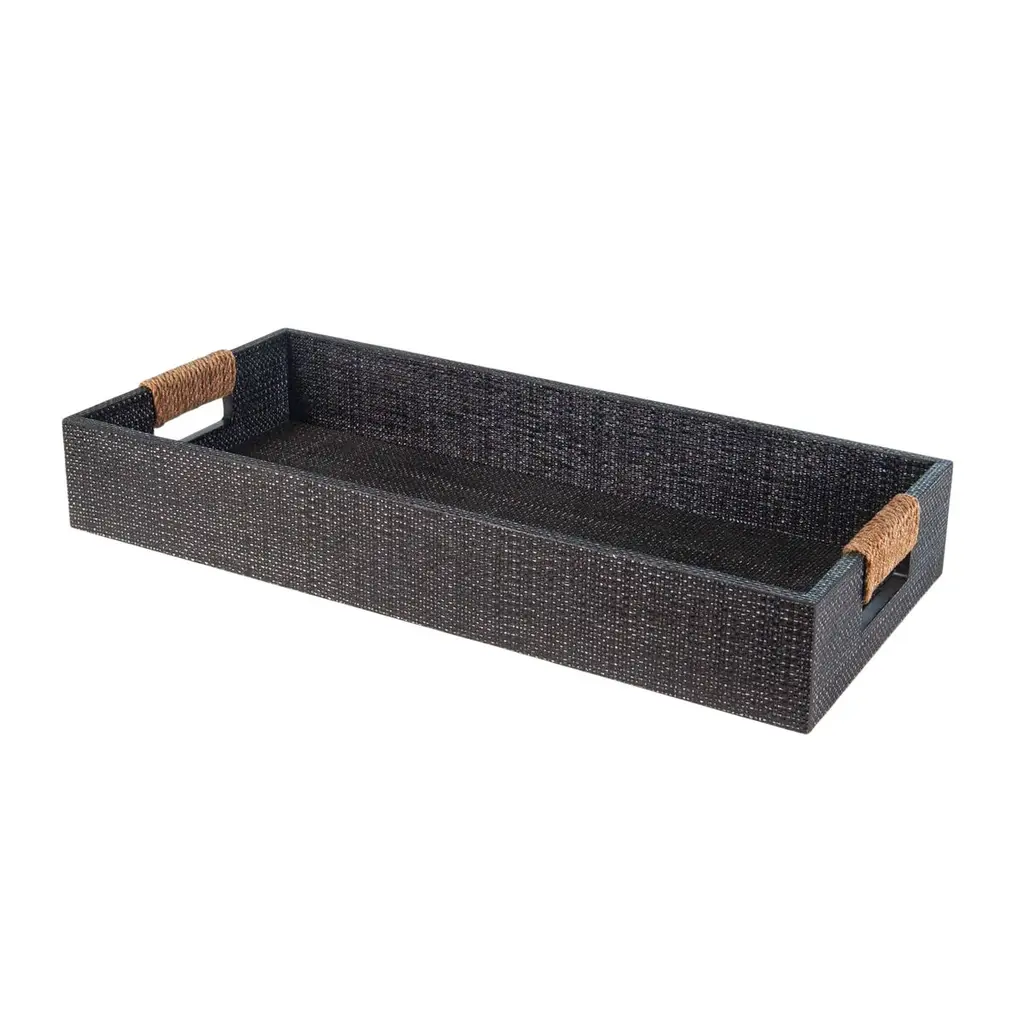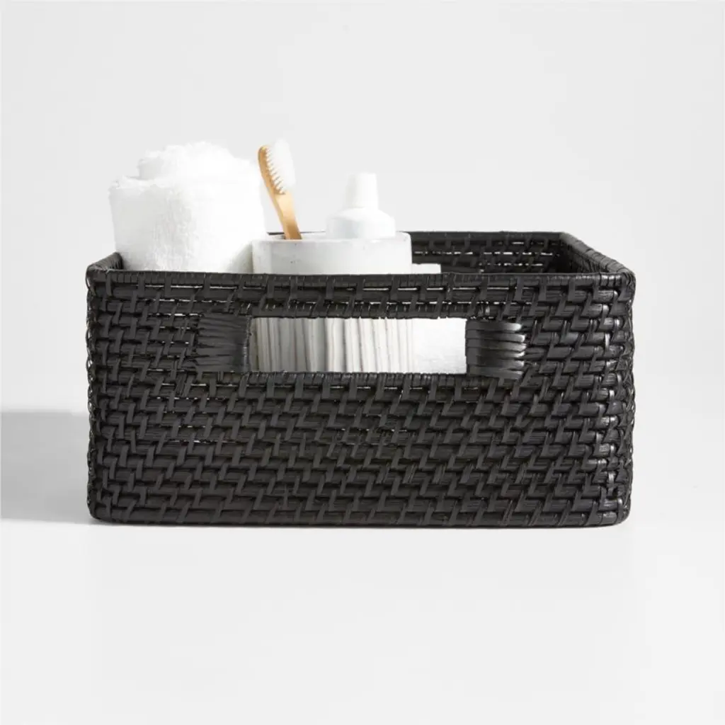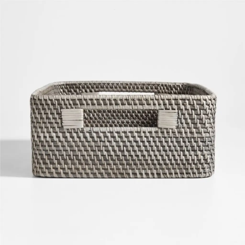 Sedona storage offers loads of texture, handwoven of sturdy rattan and finished in warm grey. Rounded tote has cutout handles with wrap detail to stow in bath, bedroom or office. Complete the look with our other Sedona grey bath accessories. Due to its handcrafted nature, each one will be slightly unique.