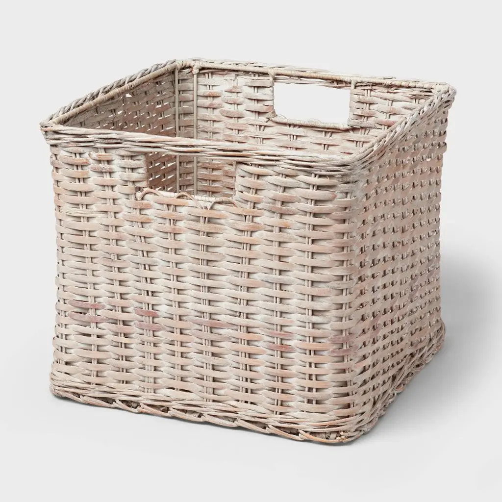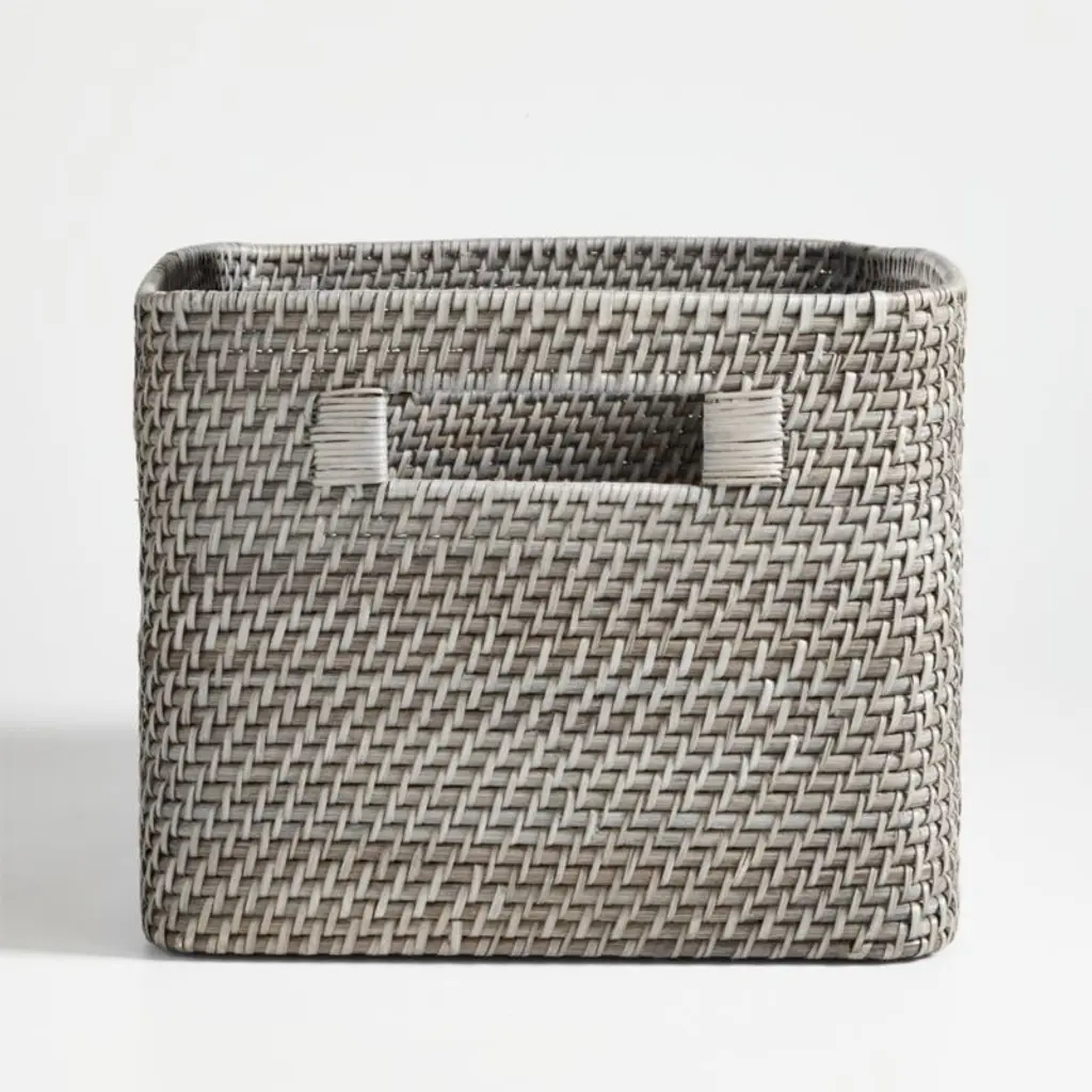 Sedona storage offers loads of texture, handwoven of sturdy rattan and finished in warm grey. Rounded tote has cutout handles with wrap detail to stow in bath, bedroom or office. Each handmade piece will vary slightly in size.
