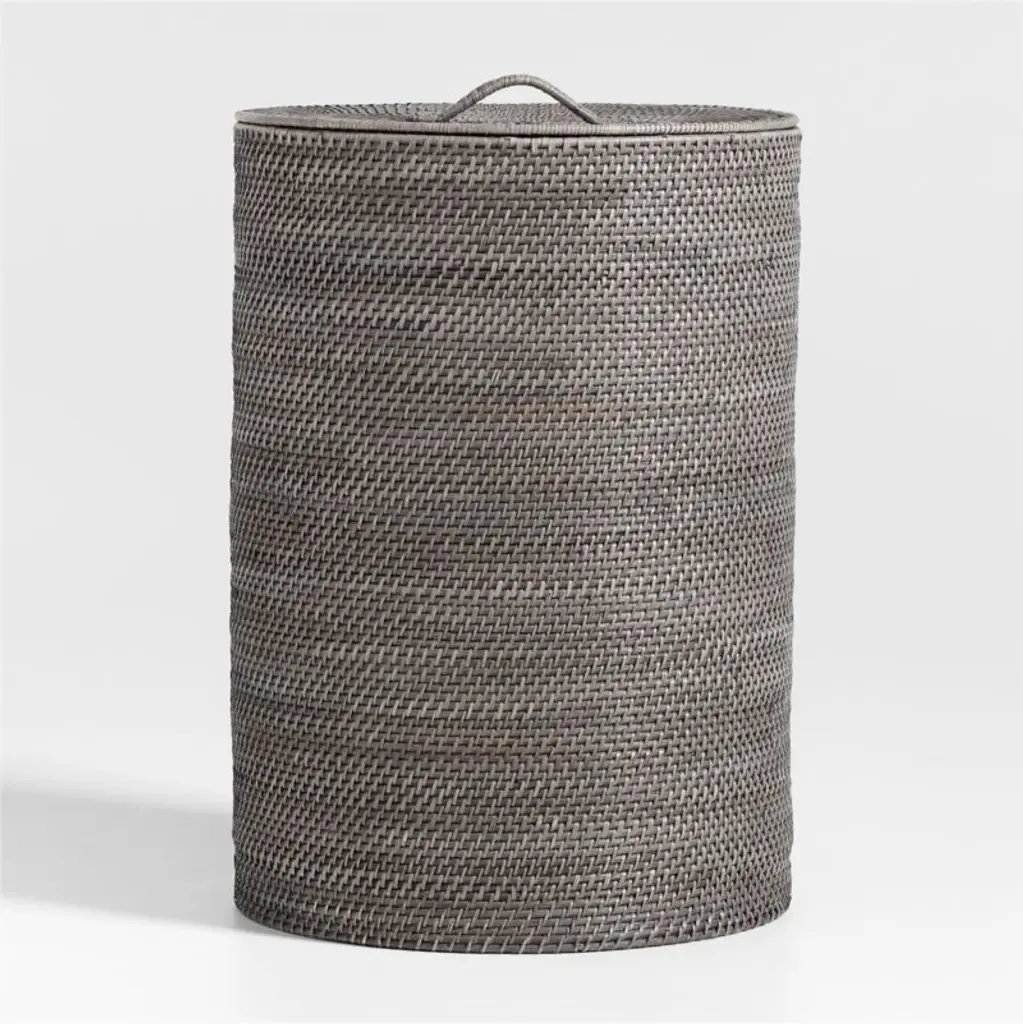 Handwoven rattan, finished in white lacquer, crafts a tall, roomy cylinder, lidded to keep laundry or used towels out of view. Each handmade hamper will vary slightly in size. Complete the look with our other Sedona white bath accessories.
