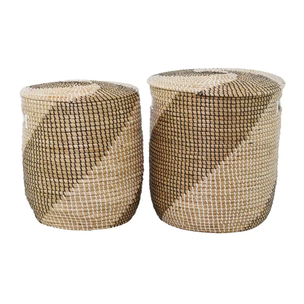 Keep your space tidy and neat with the help of these storage baskets. Filled with shoes, books, blankets and more, these storage baskets are a stylish way to store your stuff. Use these wicker baskets as hampers or storage containers for a chic complement to your contemporary home space interior design. This item ships in 1 carton. Due to the handmade nature of these, there will be slight color, shape, and size variations, as well as loose fibers. Suitable for indoor use only. This item ships fully assembled in one piece. Maximum weight limit is 5 lbs. Made in Vietnam. This brown colored laundry hamper comes as a set of 2. Contemporary style.