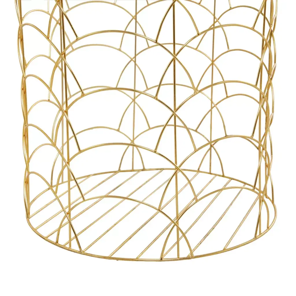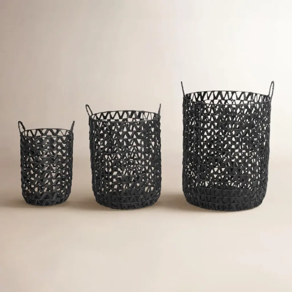 Keep your space tidy and neat with the help of these storage baskets. Maintain a tidy home with a welcoming look with the help of these chic storage baskets. Use these metal baskets in any space for additional storage to hold your pillows, blankets or magazine. This item ships in 1 carton. Suitable for indoor use only. This item ships fully assembled in one piece. Leather and hair on hide are natural products, and therefore no two will be alike. There may slight variations in pattern, natural blemishes, colors, and overall aesthetic of the product. Maximum weight limit is 5 lbs. Made in India. This gold colored basket organizer comes as a set of 3. Glam style.