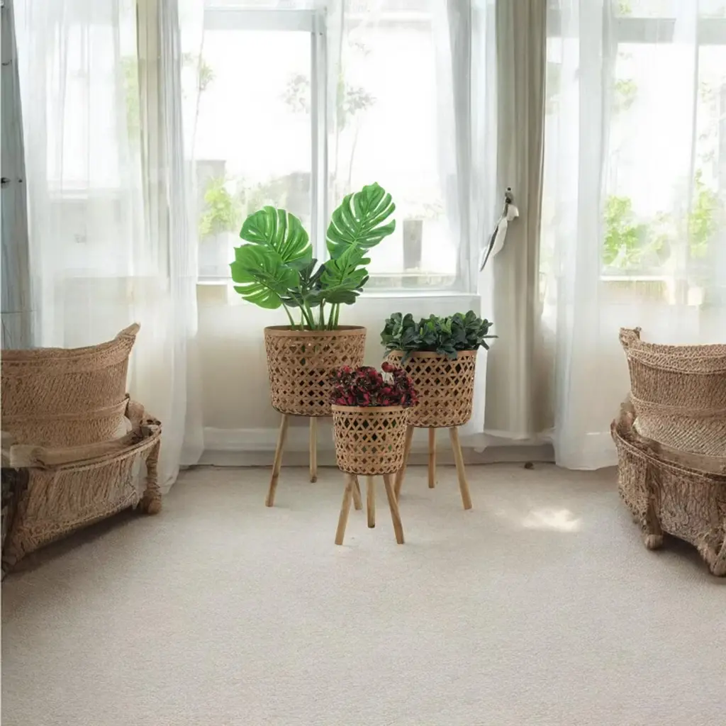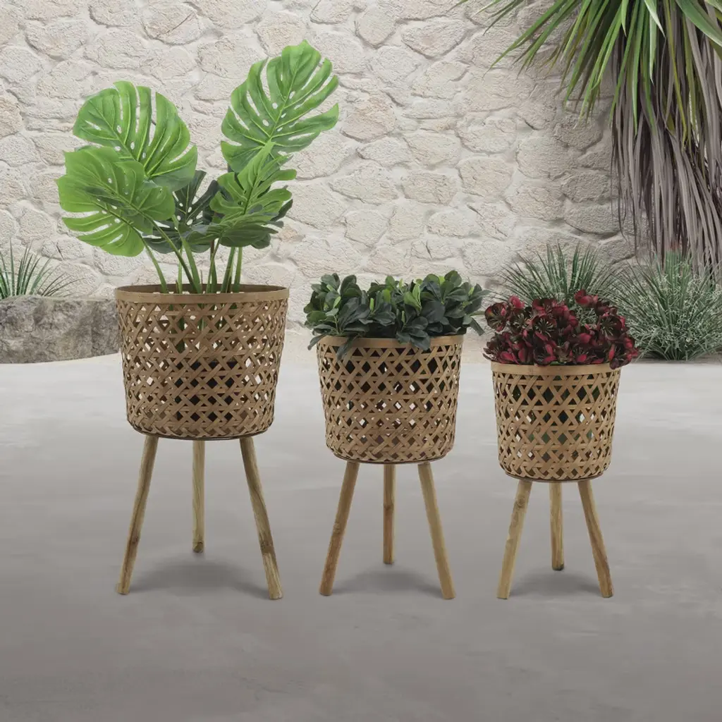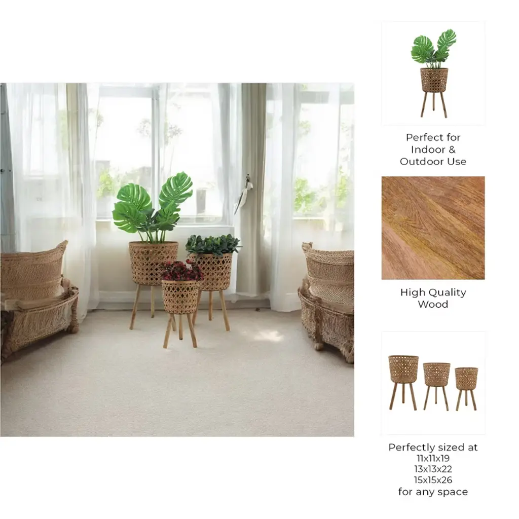 Enhance your home and garden with this beautiful set of three wooden planters on stands, designed to elevate your indoor and outdoor decor with a rustic yet modern touch. Crafted from premium bamboo and pine wood, these durable planters feature a charming woven basket design that adds texture, warmth, and natural beauty to any space. The set includes three different sizes?small (11x11x19 inches), medium (13x13x22 inches), and large (15x15x26 inches)?perfect for displaying a variety of plants, from lush greenery to blooming flowers. The sturdy wooden legs offer enhanced stability and keep your plants elevated, preventing water damage to floors and surfaces while creating an eye-catching display. Lightweight yet strong, these planters can be easily moved and arranged to fit your aesthetic needs, whether in the living room, patio, balcony, or garden. Their versatile, neutral brown color seamlessly blends with boho, farmhouse, and modern decor styles, making them a stylish addition to any home. Designed for plant lovers and home decorators alike, this planter set provides a functional and decorative way to showcase your favorite plants while keeping your space organized and inviting. Whether used together as a cohesive set or separately to complement different areas of your home, these wooden planters offer timeless appeal and practicality. Transform your home with the natural elegance of these beautifully crafted wooden planters and bring life to your living space. Order now to add a touch of organic charm to your decor.