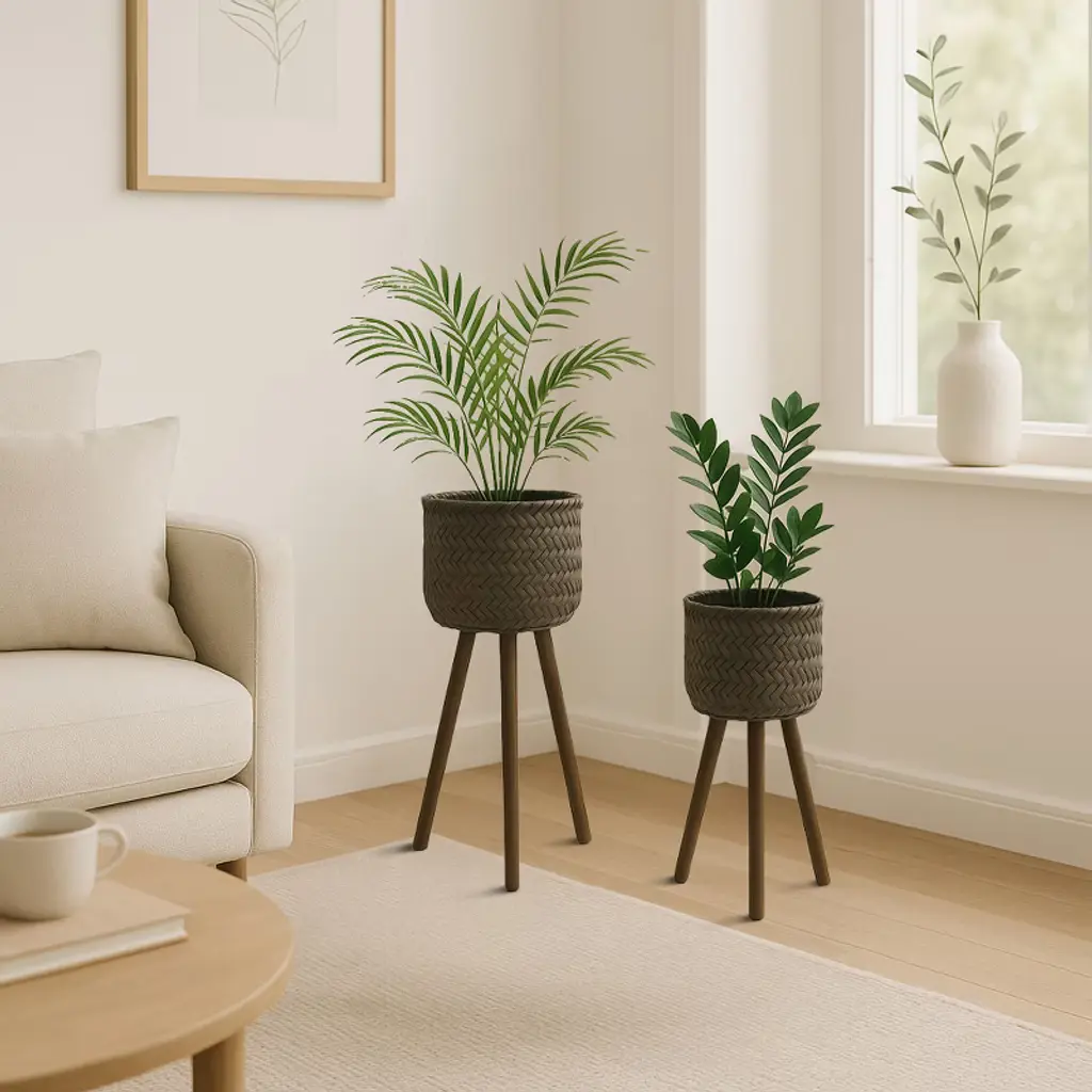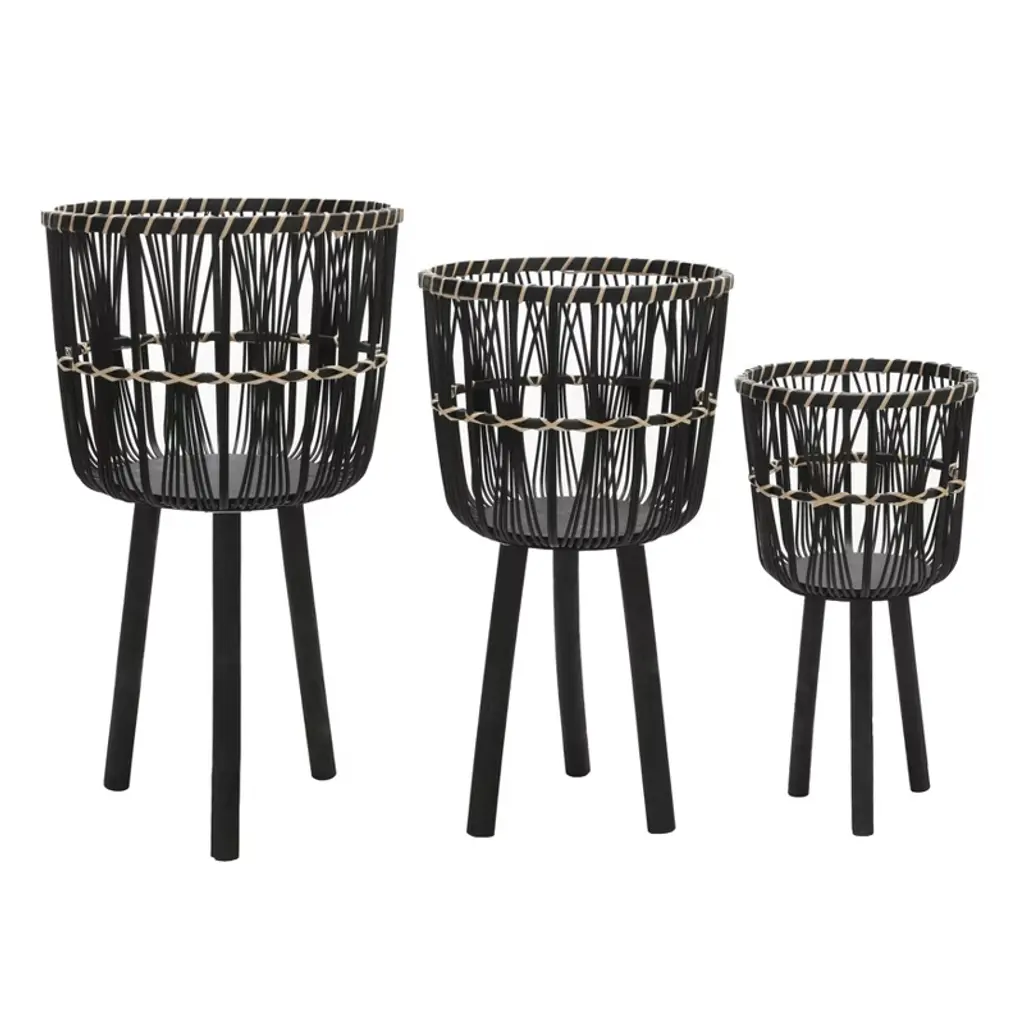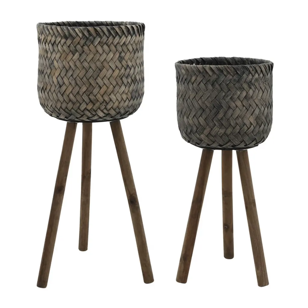 Enhance your home and garden with this beautiful set of three wooden planters on stands, designed to elevate your indoor and outdoor decor with a rustic yet modern touch. Crafted from premium bamboo and pine wood, these durable planters feature a charming woven basket design that adds texture, warmth, and natural beauty to any space. The set includes three different sizes?small (11x11x19 inches), medium (13x13x22 inches), and large (15x15x26 inches)?perfect for displaying a variety of plants, from lush greenery to blooming flowers. The sturdy wooden legs offer enhanced stability and keep your plants elevated, preventing water damage to floors and surfaces while creating an eye-catching display. Lightweight yet strong, these planters can be easily moved and arranged to fit your aesthetic needs, whether in the living room, patio, balcony, or garden. Their versatile, neutral brown color seamlessly blends with boho, farmhouse, and modern decor styles, making them a stylish addition to any home. Designed for plant lovers and home decorators alike, this planter set provides a functional and decorative way to showcase your favorite plants while keeping your space organized and inviting. Whether used together as a cohesive set or separately to complement different areas of your home, these wooden planters offer timeless appeal and practicality. Transform your home with the natural elegance of these beautifully crafted wooden planters and bring life to your living space. Order now to add a touch of organic charm to your decor.