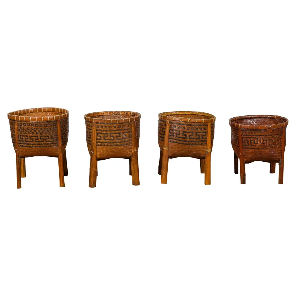 Set Of 3 Wooden Planters With Stands - Handcrafted Woven Basket Design, Rustic Boho Style For Indoor & Outdoor Home Garden Decor - 26" 22" & 19" Brown