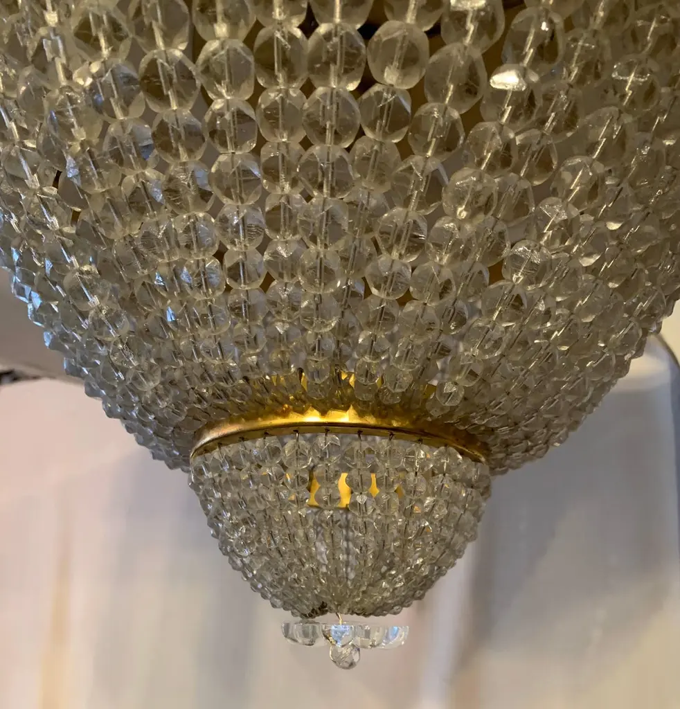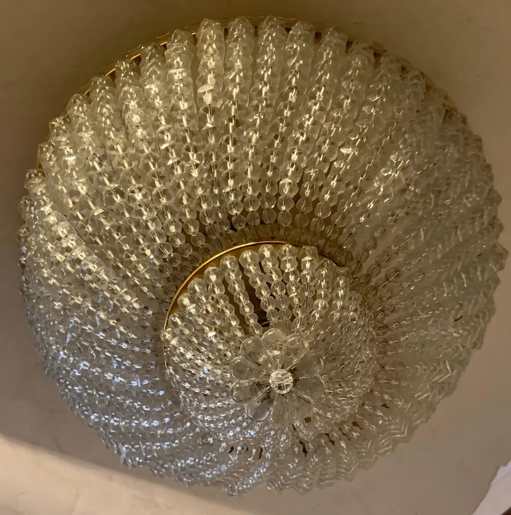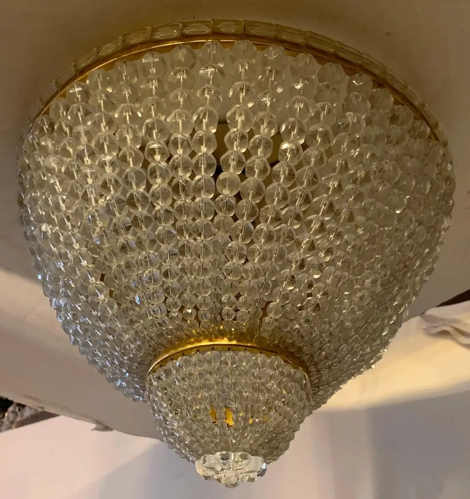 A wonderful set of 4 beaded crystal basket form flush mount brass ceiling light fixtures with a candelabra socket in each, rewired with new sockets and ready to install. Each sold separately.