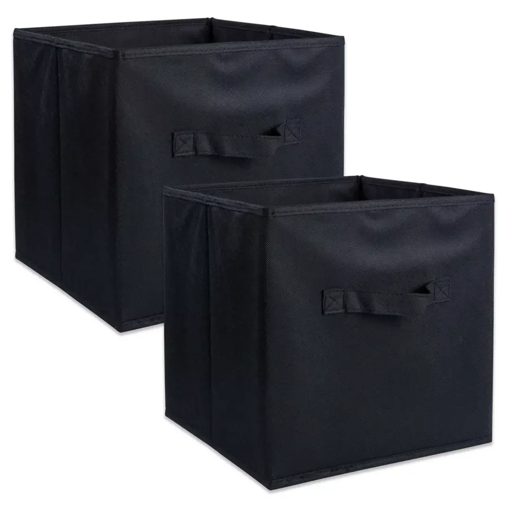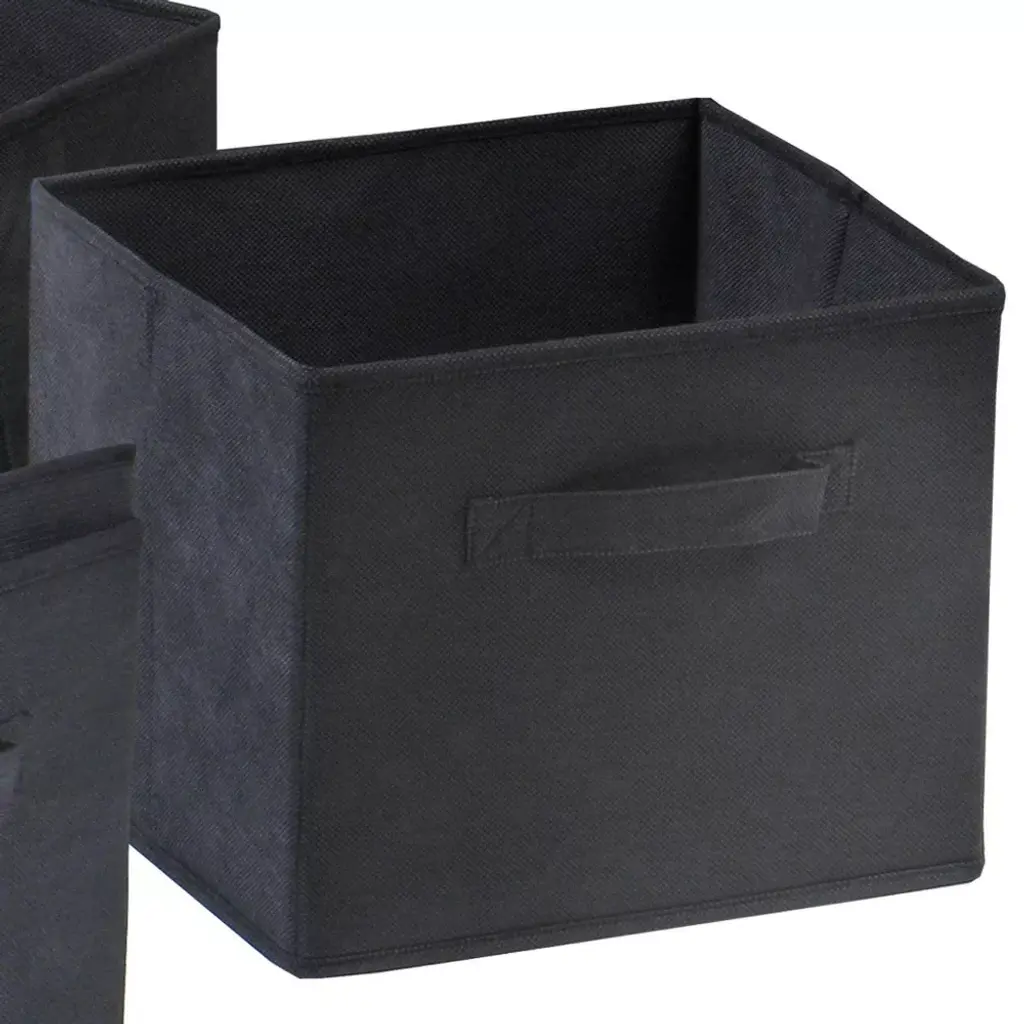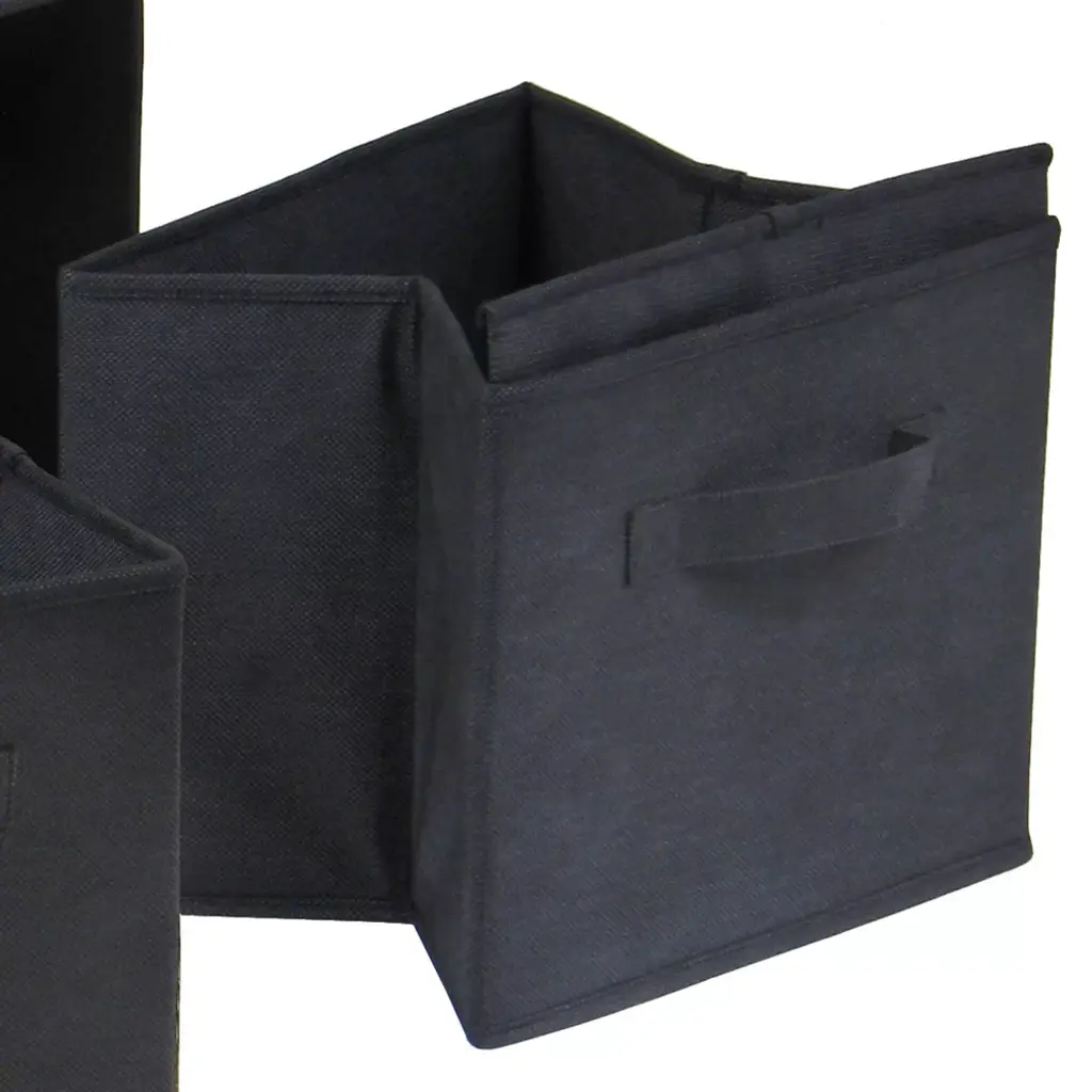Keep your living room or den neat and organized with a Capri Set of Four Foldable Fabric Baskets from Winsome. This set of fabric baskets comes in black for a look that mixes easily with your existing decor, and the foldable design makes them easy to store when not in use. Fabric handles offer a convenient carrying option, and the cube shape makes them an ideal addition to your coordinating shelving unit. Opened size is 10.9"W x 10"D x 9"H. Easy to assemble.