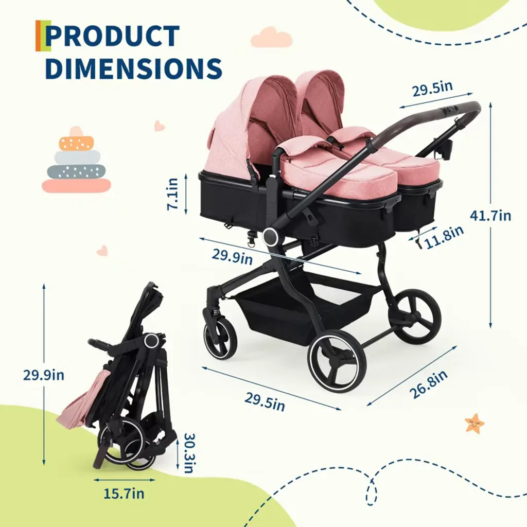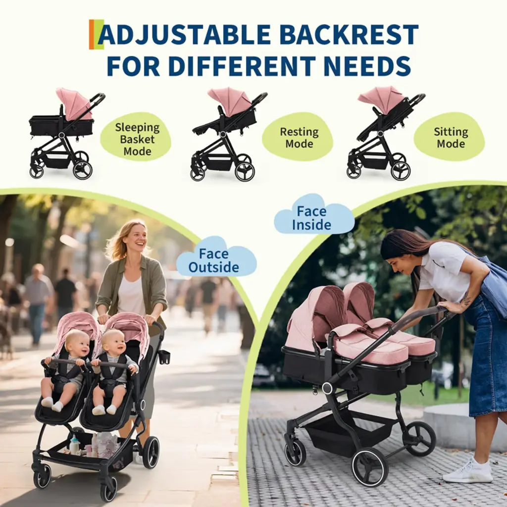 Lightweight Side by Side Double Stroller with Reversible Seats for Newborn and ToddlerDesigned for the dynamic needs of modern families, this side-by-side double stroller offers a perfect blend of comfort, convenience, and versatility for parents with two young children. Whether you have twins or siblings of different ages, this stroller grows with your family, providing a safe and smooth ride from infancy through the toddler years. Its thoughtful features, from the reversible seats to the effortless folding mechanism, make every outing a pleasure.Key Features:Customizable Comfort for Every Stage: Each seat is independently adjustable, allowing you to tailor the experience for each child. The multi-position backrest can be configured as a flat sleeping basket for newborns, a semi-reclined resting position, or an upright sitting mode for curious toddlers. Best of all, each seat can be easily reversed to face inward for bonding with you or outward for exploring the world.Superior Sun and Weather Protection: Keep your little ones sheltered from the elements with the extended, multi-section canopy. Each side features a hidden sunshade with a built-in skylight and a zippered ventilation window for adjustable airflow. For added comfort on breezy or cooler days, the detachable windproof foot cover ensures your children remain cozy in any season.Effortless One-Hand Folding and Portability: Simplify your busy life with a smart, one-click folding system. With a single action, the stroller collapses compactly and locks securely with a double safety mechanism. This lightweight and space-saving design allows for easy storage in your car trunk or at home, making travel and daily errands remarkably hassle-free.Enhanced Safety and a Smooth Ride: Engineered with your children's security in mind, the stroller is equipped with a reliable five-point safety harness for each seat. A one-touch central brake pedal provides instant stopping power when needed, while the carefully designed suspension and smooth seat angle adjustments ensure a comfortable and stable journey on various terrains.Lightweight and Versatile for Everyday Use: Crafted to be both sturdy and easy to maneuver, this lightweight twin stroller glides effortlessly alongside your daily adventures. It is the ideal companion for trips to the park, city walks, shopping malls, and family vacations, adapting seamlessly to your active lifestyle.Ample Storage and Personalized Style: A large, easy-access storage basket underneath accommodates all your essentials, from diaper bags to groceries. To suit your personal taste, this double stroller is available in a range of contemporary colors. You can also select from different models to find the perfect size and feature set for your family's needs.