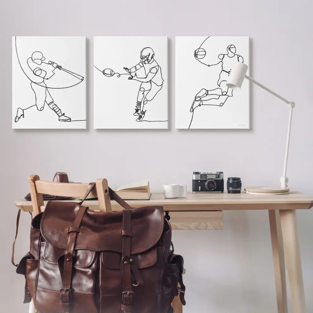 Simple Line Doodle People Playing Baseball Football Basketball, 3Pc, Each 24x30