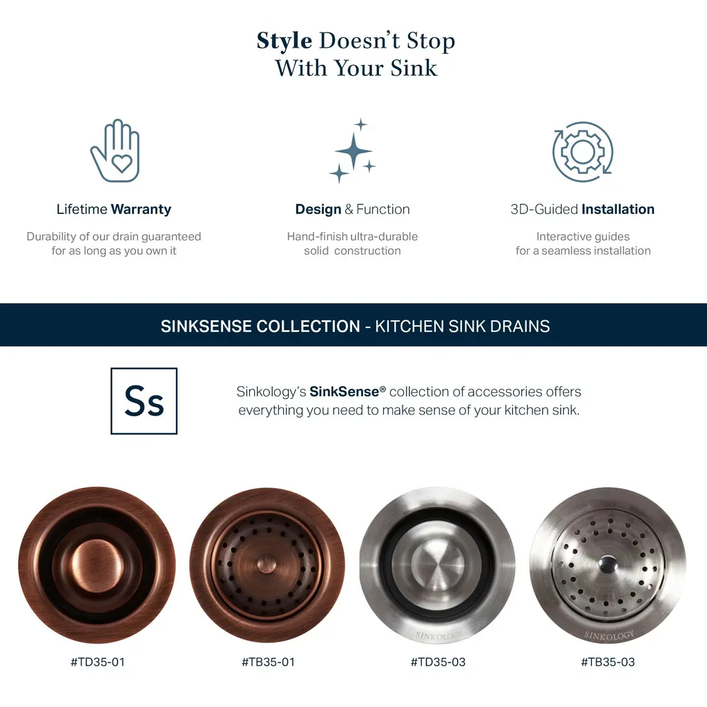 Getting the perfect match between your sink and your accessories is important for a beautiful space. Sinkology drains are designed to match our unique sink materials and finishes. With an ultra-durable solid brass construction that is hand-finished, our drains are beautiful and functional. Our lifetime warranty guarantees the durability of this strainer for as long as you own it. Recommended Products: