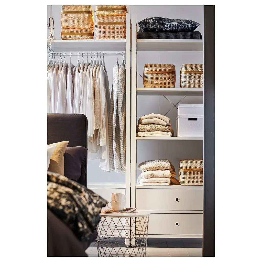 SMARRA Box with lid - natural 11 ¾x11 ¾x9 ". In this decorative basket you can hide media and clothing accessories like chargers, cords, shawls and belts. Fits EKET cabinet, 13¾" deep, and other storage furniture with shelves which are at least 12" deep.