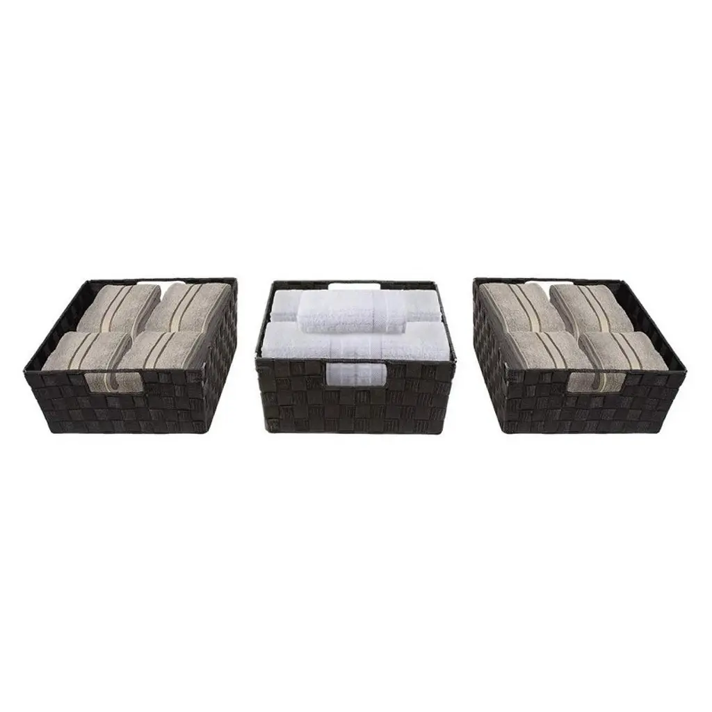 Organize household essentials with our woven basket bin set! Designed with a wire frame, each fabric basket features a woven strap pattern for contemporary appeal. If staying tidy is your goal, store anything from accessories to hand towels and office supplies. Two built-in handles make it easy to carry around the home and when not in use, simply stack together. It's the perfect storage solution for any cube organizer, shelf, or tabletop to stay organized in style.