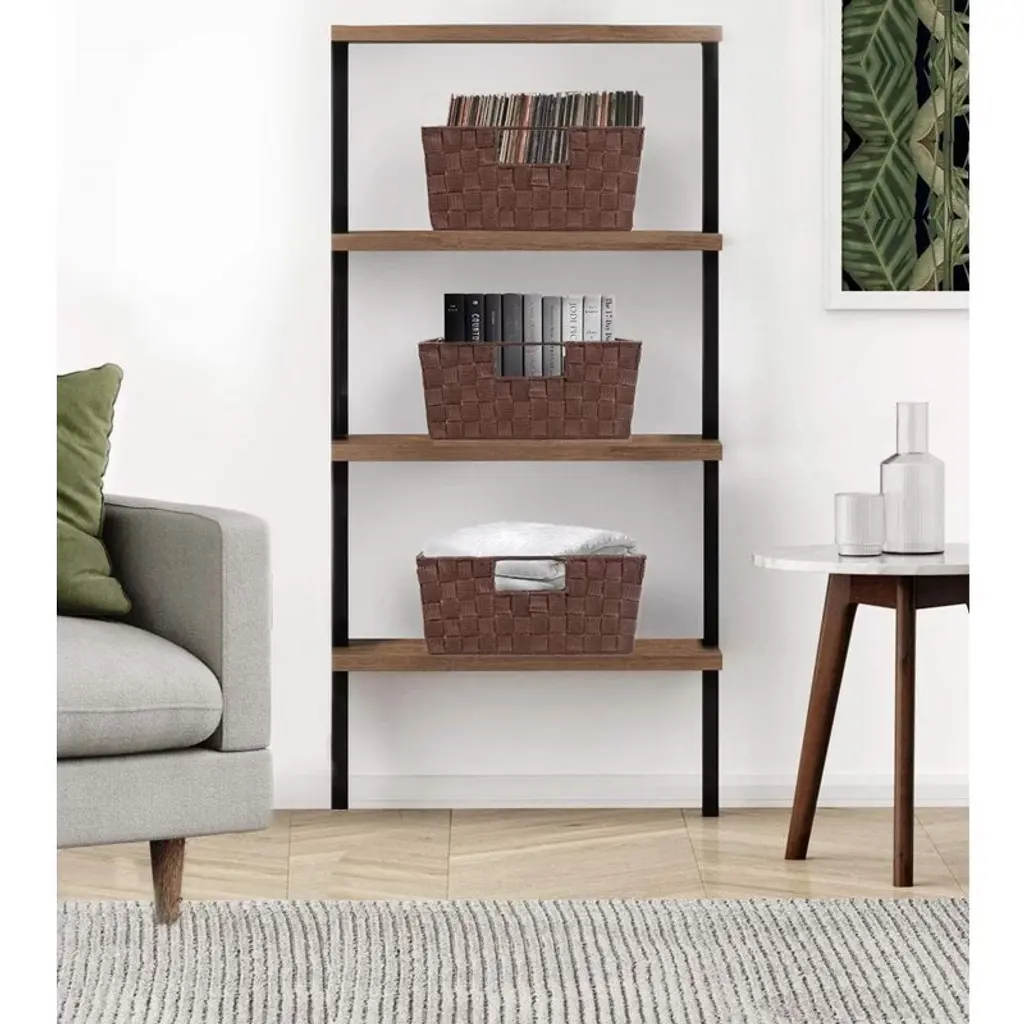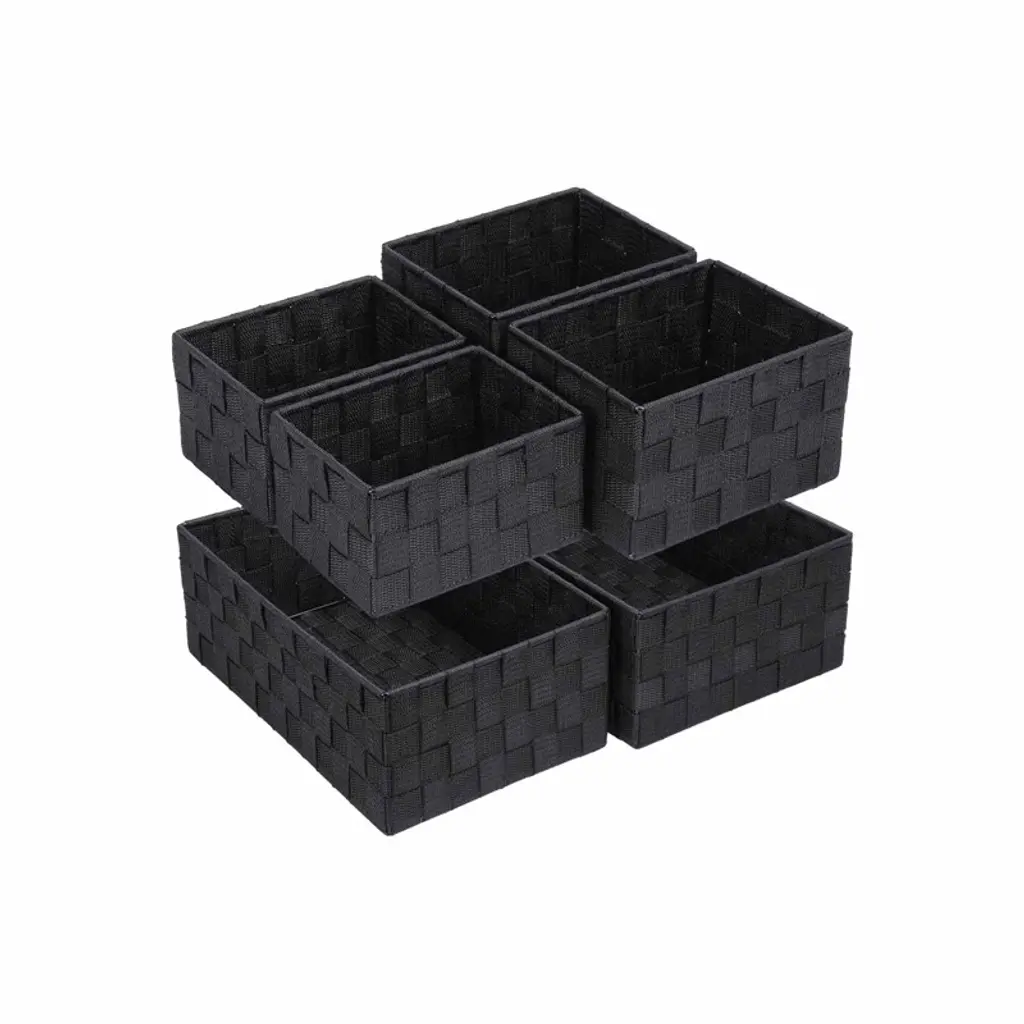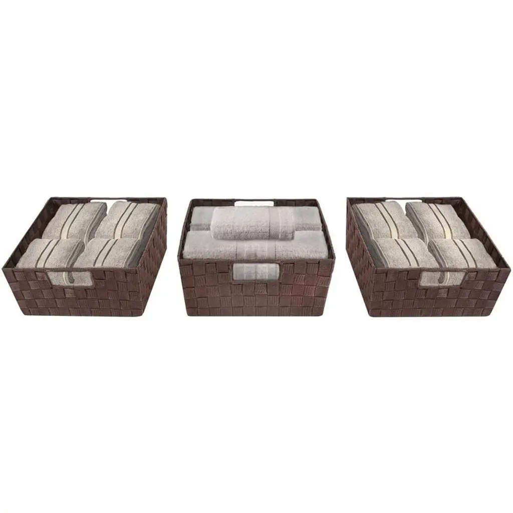 Organize household essentials with our woven basket bin set! Designed with a wire frame, each fabric basket features a woven strap pattern for contemporary appeal. If staying tidy is your goal, store anything from accessories to hand towels and office supplies. Two built-in handles make it easy to carry around the home and when not in use, simply stack together. It's the perfect storage solution for any cube organizer, shelf, or tabletop to stay organized in style.