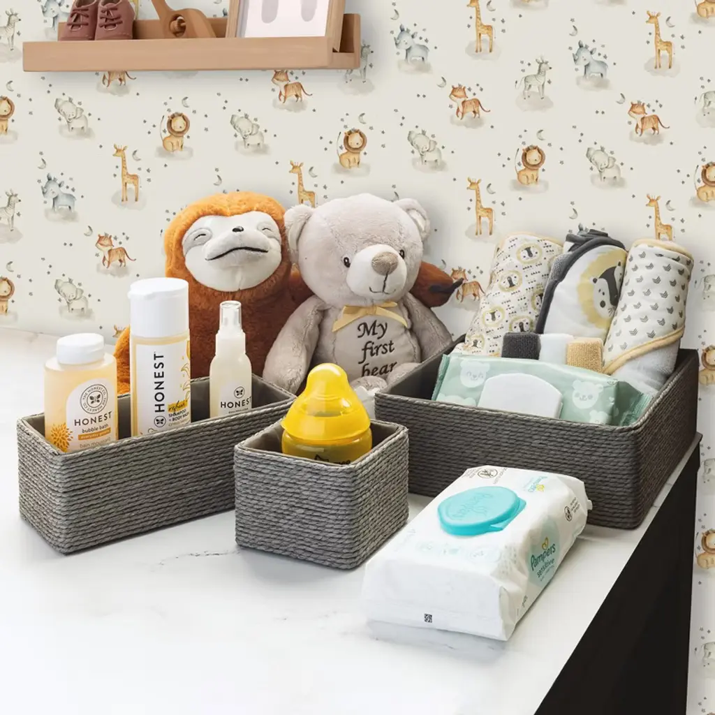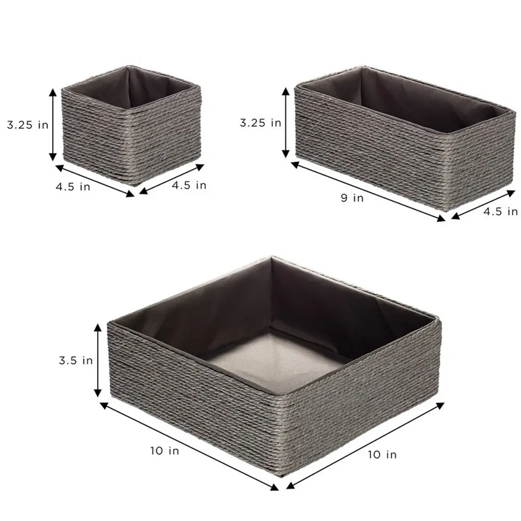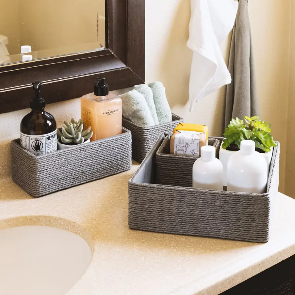 The Sorbus Storage Baskets are the perfect way to organize your bathroom, vanity, or open shelving. This organizer bin set is versatile for any space. Organize your office, nursery, pantry, laundry room, and more. The paper rope material and soft design complement many home decor styles. Tuck away toiletries, nursery items, office supplies, snacks, laundry supplies, cosmetics, makeup, skincare, and more. This is an excellent set for small spaces, especially apartments and college dorm rooms. Maximize your storage possibilities with this four-piece set. It's the perfect storage solution for any drawer, shelf, or tabletop, so you can stay organized in style.