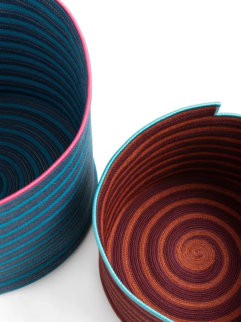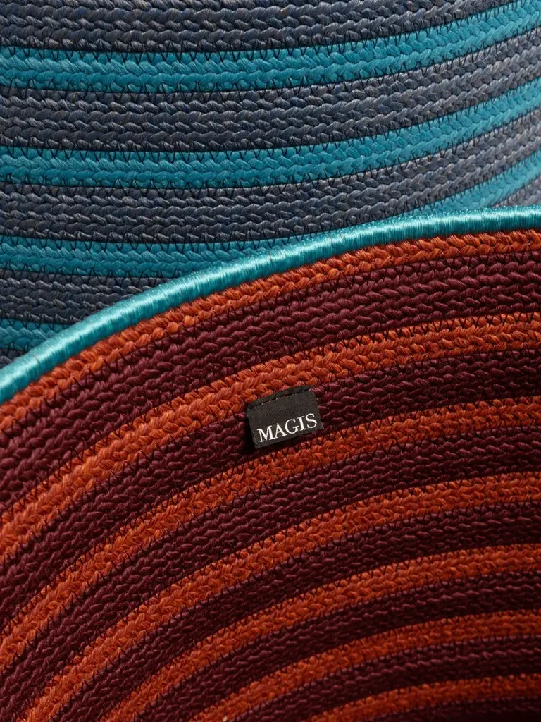 Baskets.Materials: 100% polyolefin. Suitable for outdoor use.Accuracy is the essence of Konstantin Grcic’s work, and his new collection, South, designed for outdoors but ideal for indoors too, is no different. In cataphoresis-treated and powder-coated steel tube and wire, it is available in a range of colours: orange, bordeaux, light blue and night blue.Sinuous yet minimal, the collection consists of an armchair, a low armchair, a bench and a low bench, all with armrests. It also includes four tables (200x120 cm with top in teak slats, 200x90, 160x90 and 90x90 cm with top in steel sheet) and two coffee tables (120x120 cm with top in either teak slats or in lava stone enamelled with recycled coloured glass and 90x90 cm with top in steel sheet). The collection also features woven mattings for the seats, carpets, baskets and a plaid, all in the same outdoor-friendly fabric.As always, Konstantin Grcic combines formal rigour with a keen sense of design and architecture and demonstrates his passion for technology with careful research into materials and creative yet practical expertise.The South collection’s curved and inviting lines make explicit its direct and unconventional invitation to relax, resulting in dynamic comfort. To make the seats even more comfortable, a full (seat and backrest) woven matting can be secured to the shell with Velcro, offering a chic and practical alternative to classic cushions.