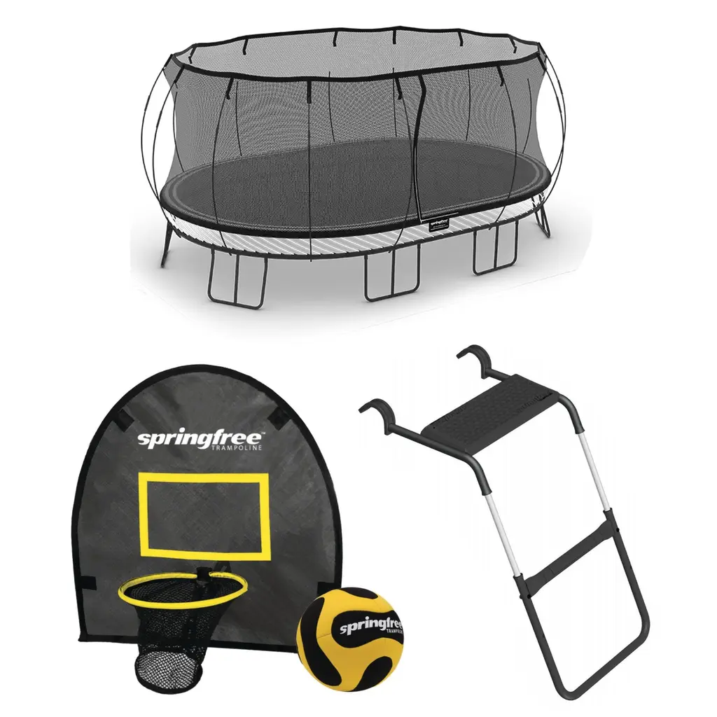 Embark on an epic adventure of bouncing bliss while perfecting your slam dunks with this 12 by 19-feet Oval Trampoline with Basketball FlexrHoop and Ladder from Springfree Trampoline. Spanning an impressive 12 by 19-foot space, this colossal playground promises endless excitement for the whole family. This outdoor trampoline requires a space measuring 22 by 29 feet for installation. Featuring a tested maximum weight capacity of 1500 pounds, this trampoline ensures robust support for all your bouncing adventures, and with a single jumper weight capacity of 220 pounds, there's no limit to the fun you can have on this impressive trampoline. The basketball backboard FlexrHoop accessory adds extra fun to your jumping adventures. Designed with the same materials as a Springfree trampoline, this basketball hoop attaches to the trampoline without adding any hazardous hard surfaces to the jumping area and comes with an inflatable ball and air pump. Featuring an adjustable backboard, this can be used by kids and adults alike. Meanwhile, the FlexrStep V2 Trampoline Ladder features a secure lock, and is ideal for active families with young children, preventing unsupervised jumping and ensuring safety. With a weight capacity of up to 154 pounds, this durable ladder offers peace of mind. Transform every jumping session with loved ones into an unforgettable experience with this 12 by 19-feet Oval Trampoline with Basketball FlexrHoop and Ladder from Springfree Trampoline. Jumbo Oval Trampoline, measuring 12 feet by 19 feet and requires a footprint of 22 feet by 29 feet, offering an expansive space for everyone to enjoy endless fun and excitement Tested to hold up to 1500 pounds, offering robust support for all jumpers, allowing individuals weighing up to 220 pounds to bounce endlessly FlexrHoop basketball attachment, exclusively for Springfree trampolines and made with matching material, adds an exciting game to the jumping area Basketball hoop with easy installation process includes an inflatable ball and pump and attaches safely to the compatible trampoline without adding any hazardous hard surfaces Exclusive to Springfree trampolines, the FlexrStep V2 ladder supports up to 154 pounds and includes a lock to deter unsupervised use; Secured entry for kids and adults alike Springfree Trampoline 12' x 19' Jumbo Oval Trampoline Color: Black Dimensions (L x W x H): 144 x 228 x 112 inches Weight: 323 pounds Manufacturer warranty: 10-year limited warranty Springfree Trampoline Basketball FlexrHoop Accessory Color: Black Dimensions (L x W x H): 37.4 x 3.9 x 35.4 inches Weight: 7.4 pounds Springfree Trampoline FlexrStep V2 Ladder Color: Black Dimensions (L x W x H): 2 x 17.1 x 25.2 inches Weight: 9.5 pounds