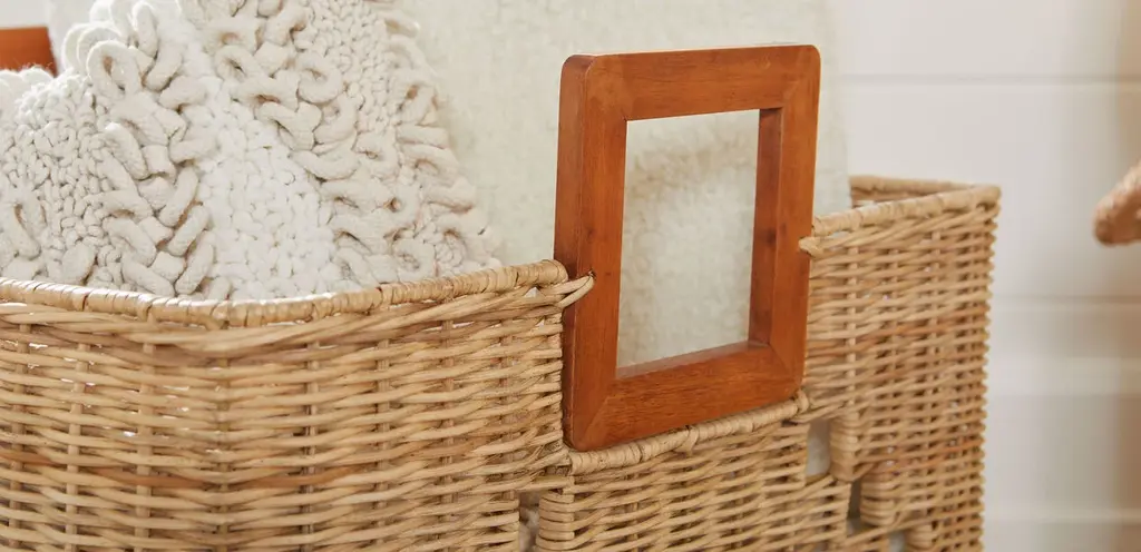This square storage basket's wood handle is a little modern and a lot functional. Fill it with towels and sandals for the pool or even with dishes for the patio—then carry it outside to be used as functional décor.