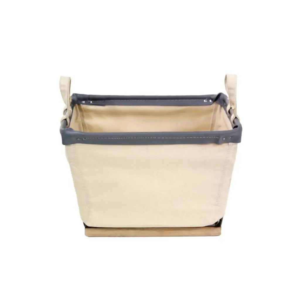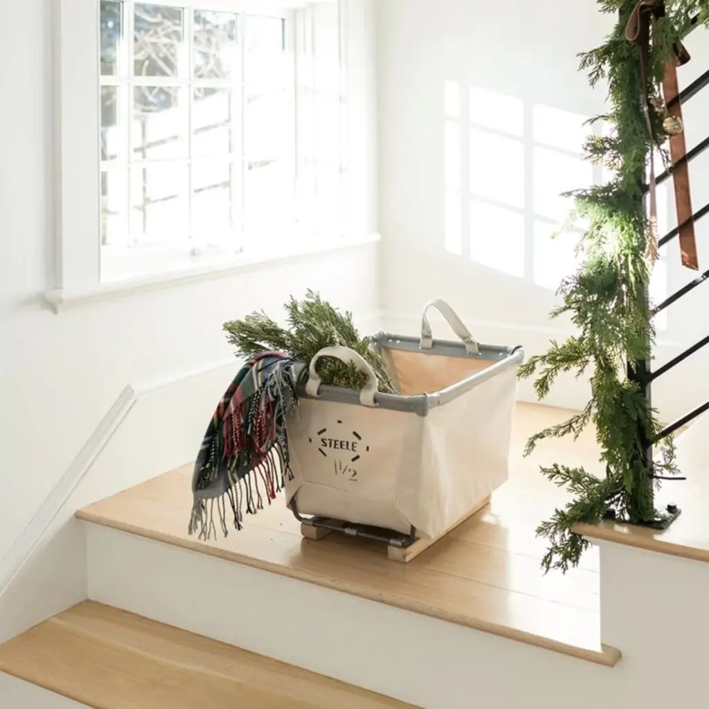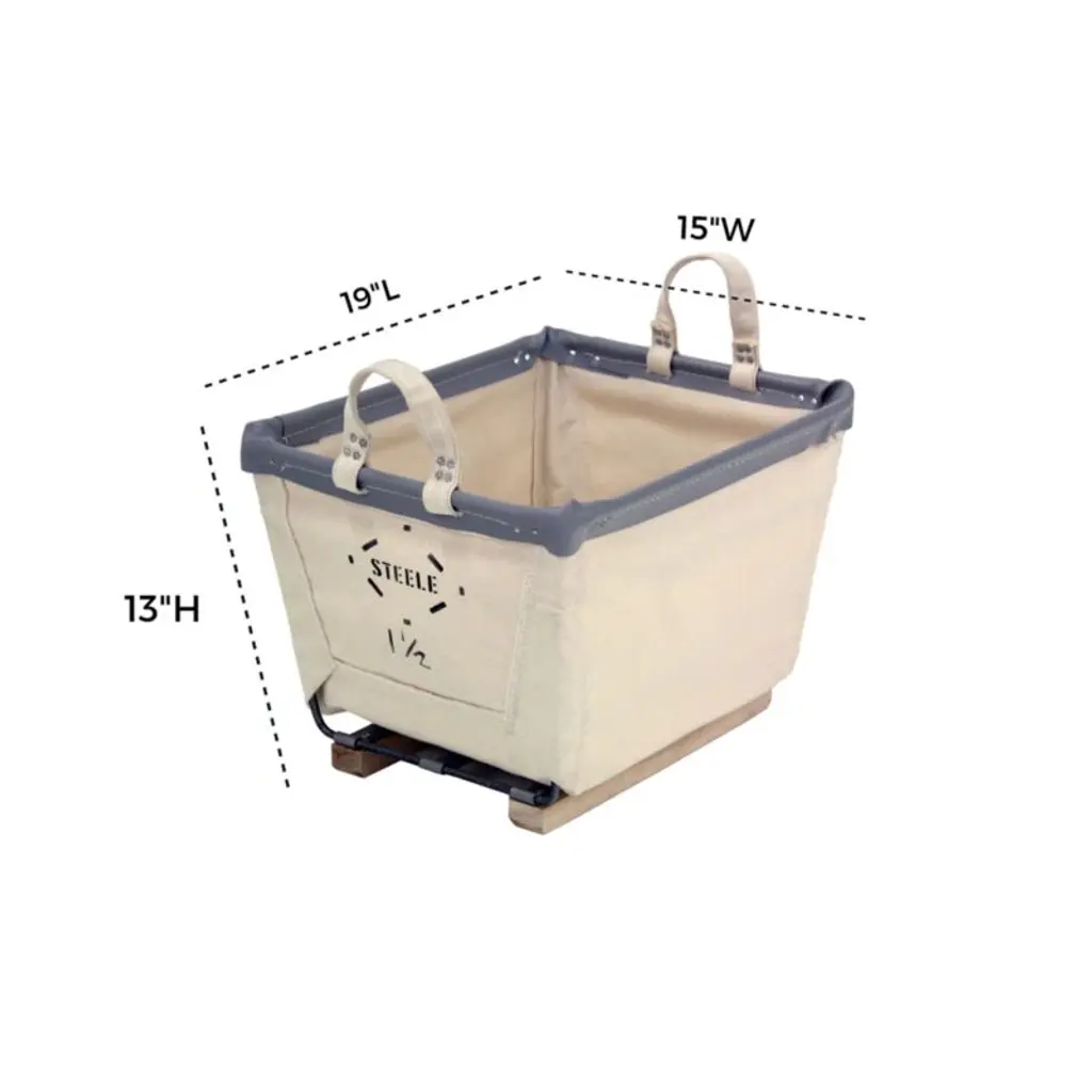 Bring commercial-style efficiency, organization and beauty to your home laundry room. Our exclusive small hamper stores laundry as well as toys, cushions, throw blankets and more throughout the home. Made by the Steele Canvas Basket Co., the basket has a sturdy steel frame wrapped in natural cotton canvas with a thermal plastic rubber edge and Reinforced leather trim for easy carrying. Designed with the durability and style of a professional launderer's bin, it boasts a 100-pound, 1.5-bushel capacity while being lightweight and easy to nest in multiples. The striking Steele logo is hand-applied using the original brass stencil from 1921 when the company began producing commercial-grade canvas products. Because each carry basket is cut, bent and welded by hand, there will be a slight variance in size.View all Steele products