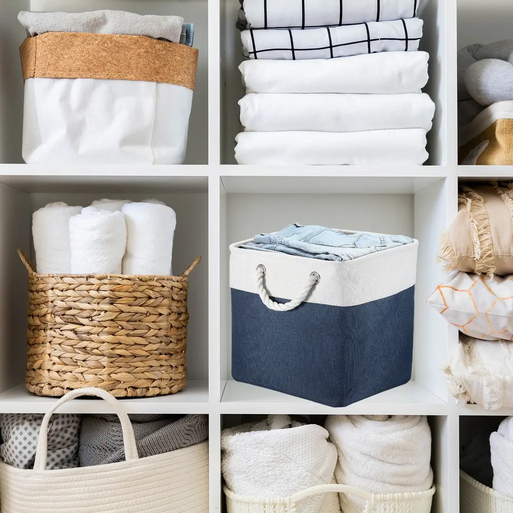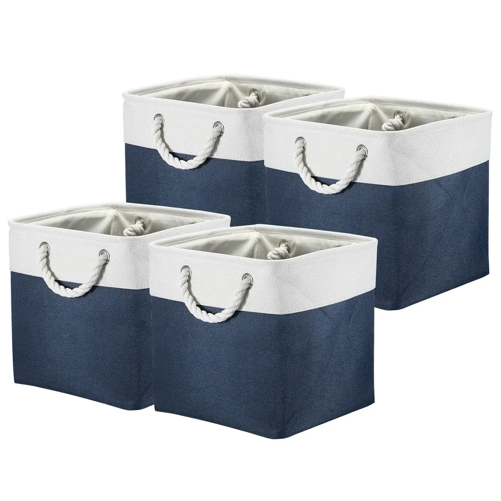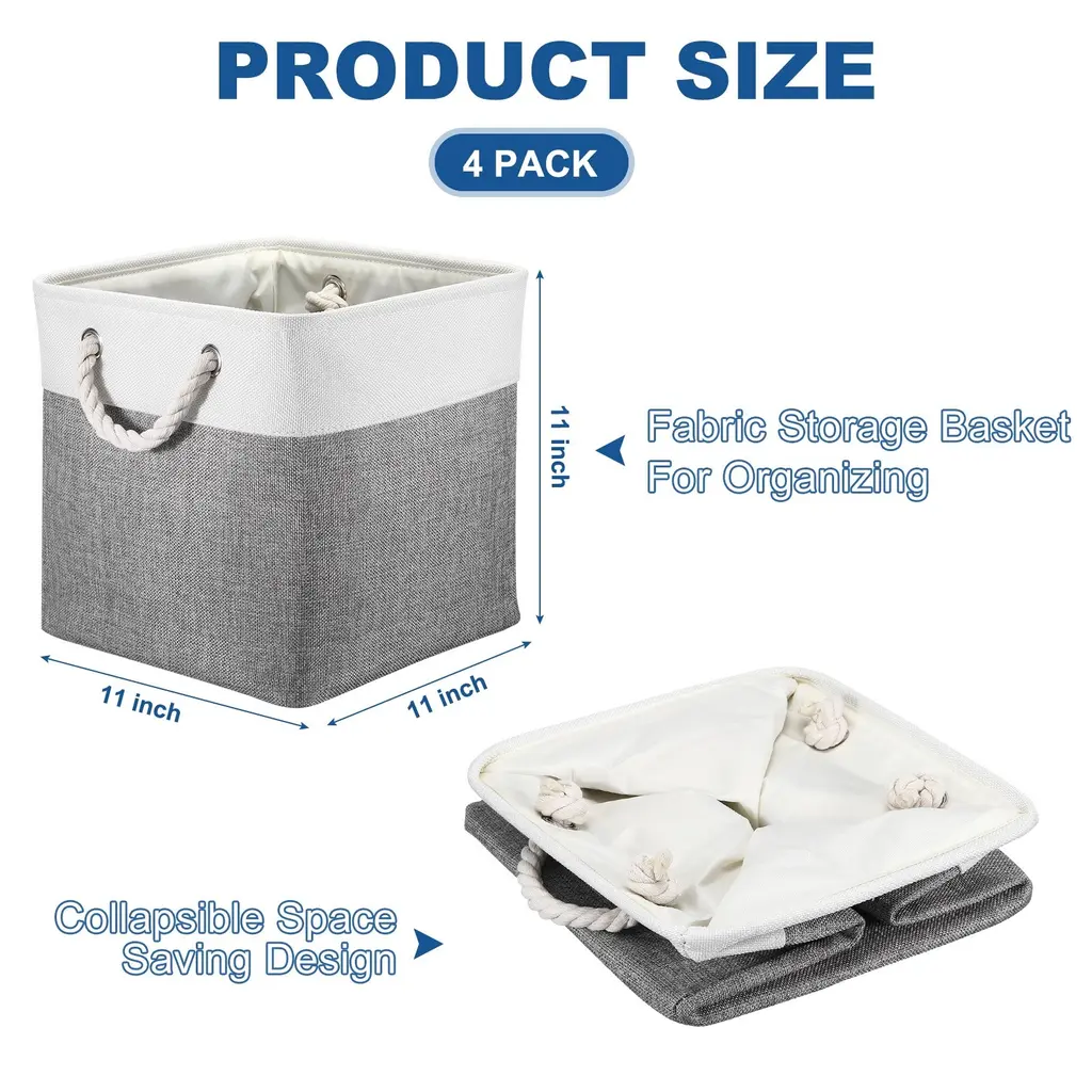 The Warm Home Storage BinCreating and decorating your home can sometimes feel like an task. They require a balance of beauty and function that sometimes seems impossible to strike, but these baskets will show that you can create a great space. This basket is a great way to hide items in your entryway or closet, It keeps the space looking clean and organized.Perfect Size For StorageThe storage baskets come in 4 packs, each measure 11", perfect for gifts baskets, and nursery organizers. These shelf baskets allow the storage of a variety of items.Lined With A Soft FabricLined with a thin muslin fabric, easy to clean, just wipe it with a damp sponge or cloth. The sturdy metal rod frame around the top keeps the basket Shape. A durable structure can allow you to put more heavy stuff. Cotton rope handles for easy slide-in and pull-out of shelves or closets. They are attached with metal grommets to the basket and the handles themselves are made from soft cotton rope.Fabric Storage Bin With Portable DesignThese shelf baskets can simply fold into flats for space-saving when not in use or to transport.Great Storage Basket For Shelf And ClosetThese Baskets are perfect for storage Blankets, Towels, DVD, Books, Magazines, Gifts, and Socks. Storage Bins work great for organizing closets, Living Rooms, Bedrooms, rooms, bathrooms, Nursery Rooms, and Apartments