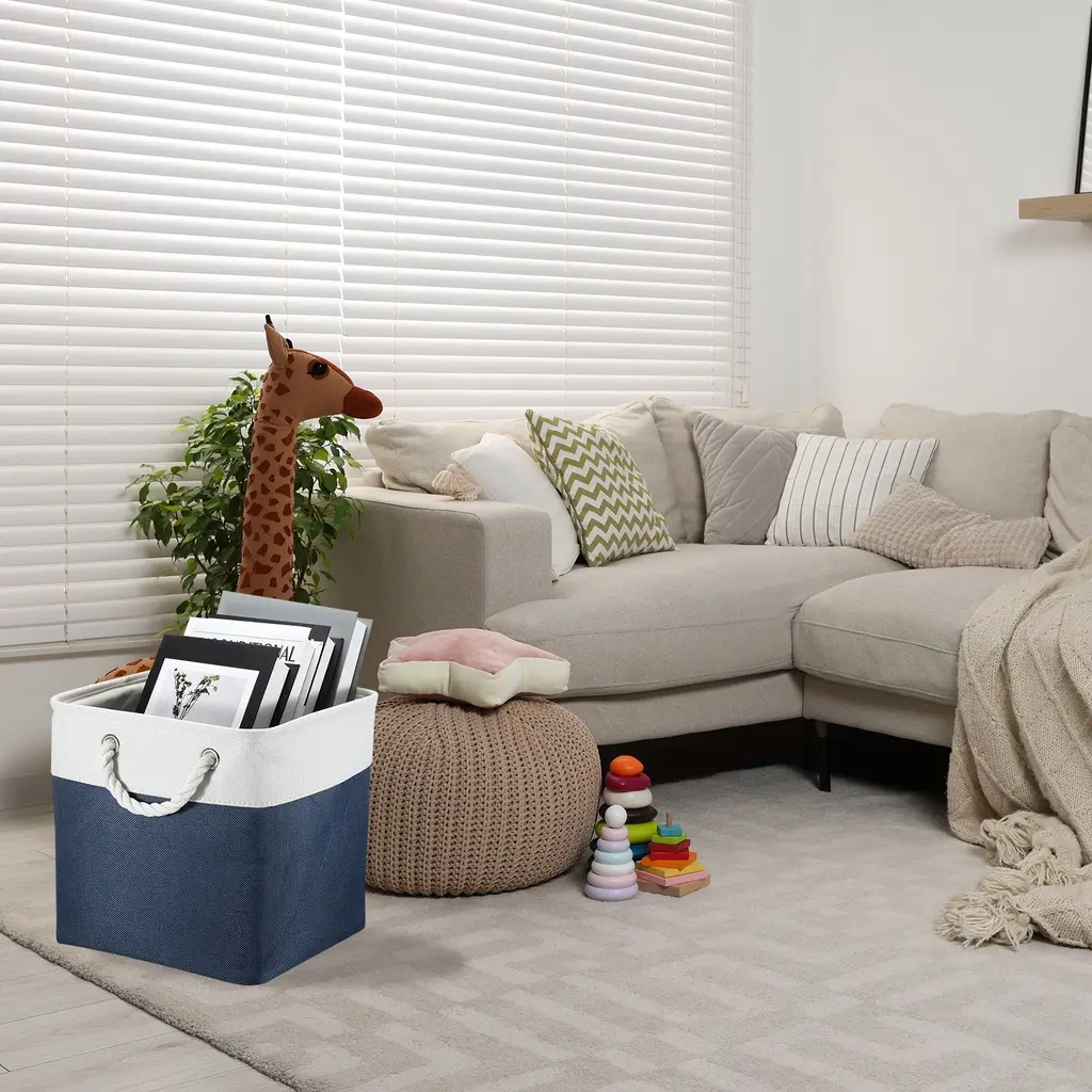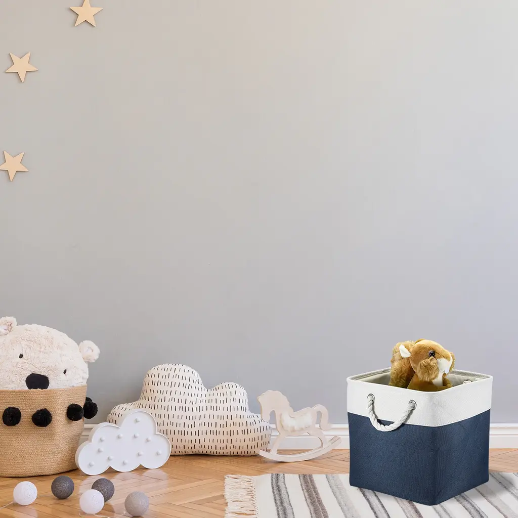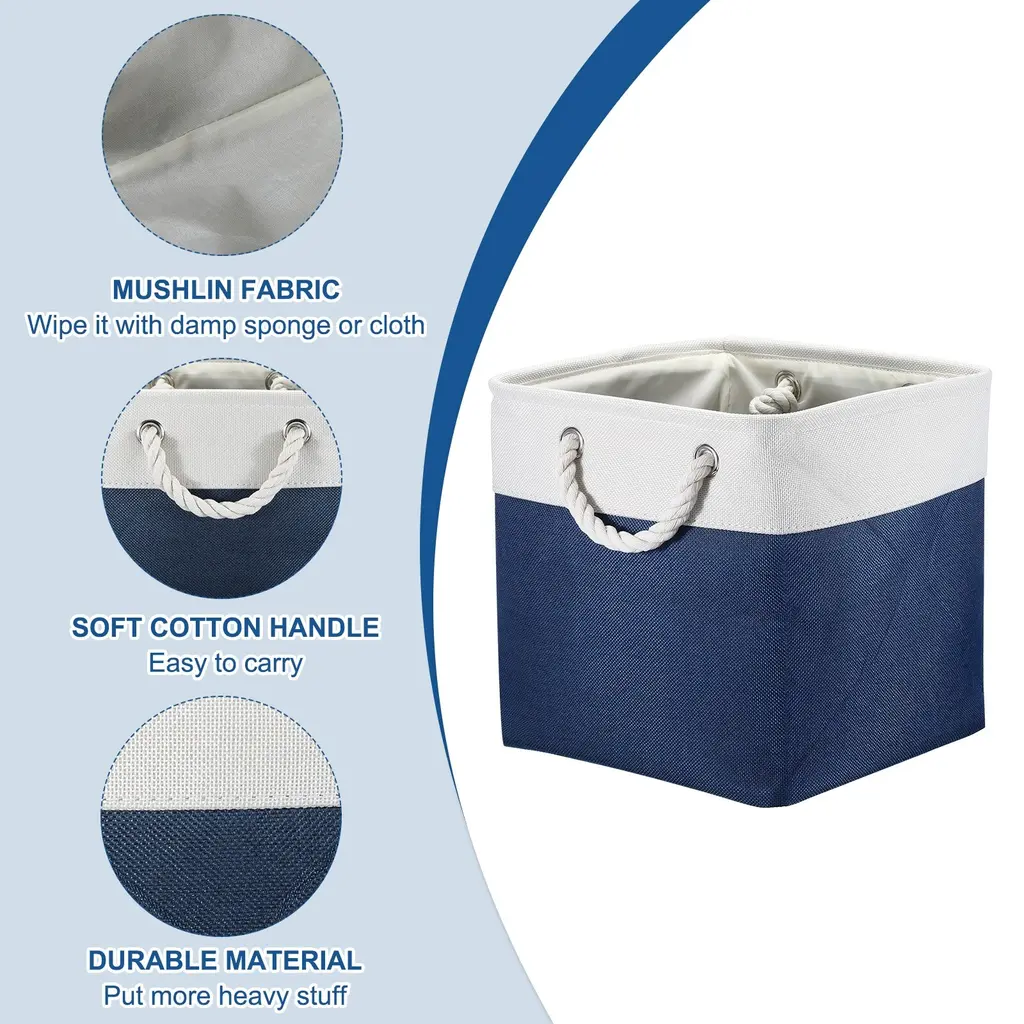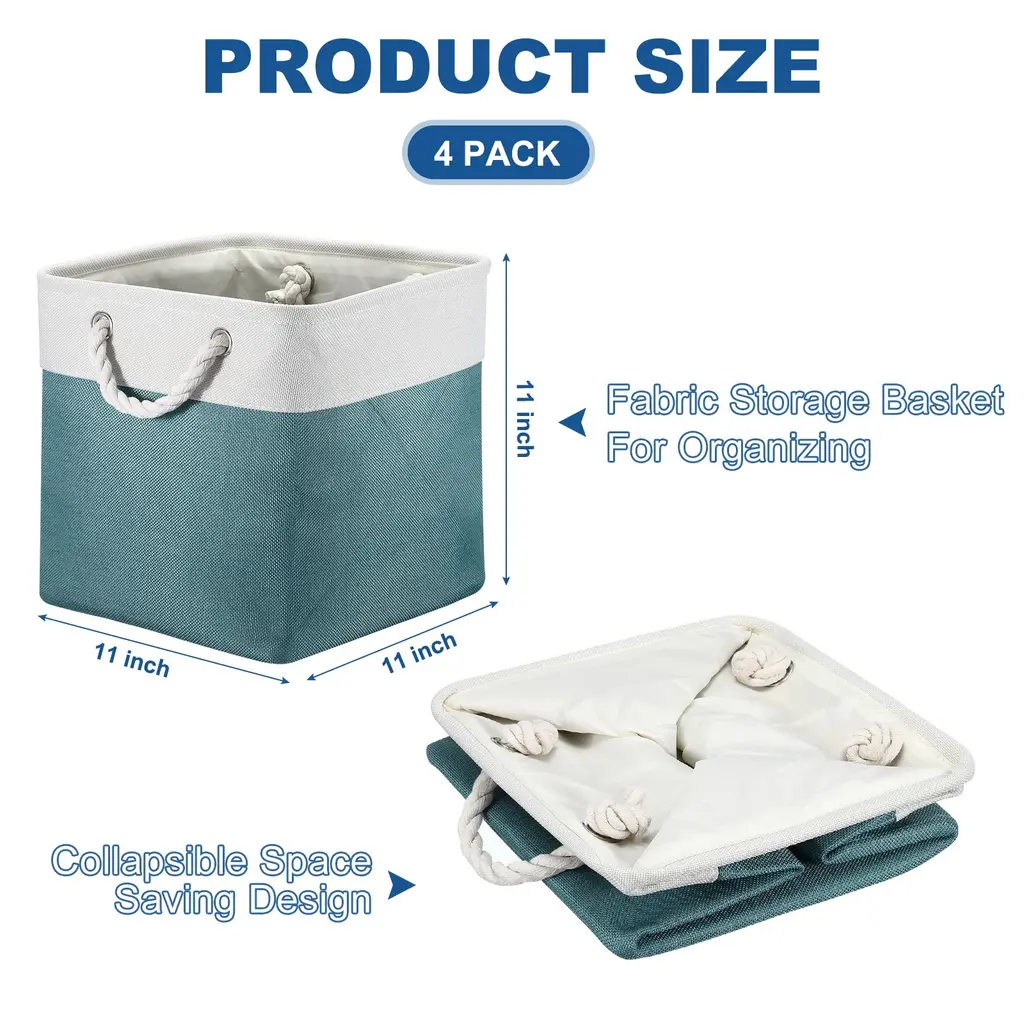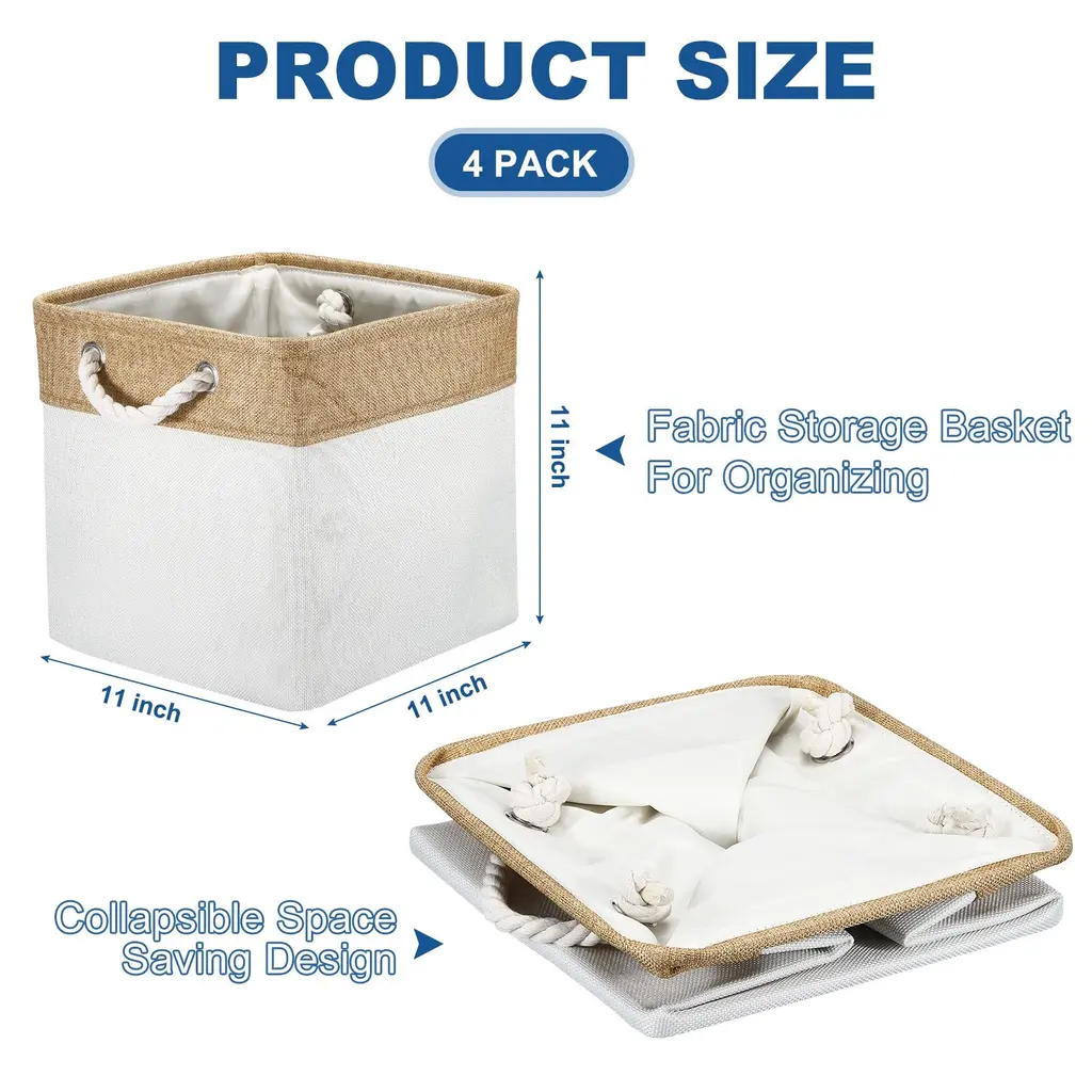 The Warm Home Storage BinCreating and decorating your home can sometimes feel like an task. They require a balance of beauty and function that sometimes seems impossible to strike, but these baskets will show that you can create a great space. This basket is a great way to hide items in your entryway or closet, It keeps the space looking clean and organized.Perfect Size For StorageThe storage baskets come in 4 packs, each measure 11", perfect for gifts baskets, and nursery organizers. These shelf baskets allow the storage of a variety of items.Lined With A Soft FabricLined with a thin muslin fabric, easy to clean, just wipe it with a damp sponge or cloth. The sturdy metal rod frame around the top keeps the basket Shape. A durable structure can allow you to put more heavy stuff. Cotton rope handles for easy slide-in and pull-out of shelves or closets. They are attached with metal grommets to the basket and the handles themselves are made from soft cotton rope.Fabric Storage Bin With Portable DesignThese shelf baskets can simply fold into flats for space-saving when not in use or to transport.Great Storage Basket For Shelf And ClosetThese Baskets are perfect for storage Blankets, Towels, DVD, Books, Magazines, Gifts, and Socks. Storage Bins work great for organizing closets, Living Rooms, Bedrooms, rooms, bathrooms, Nursery Rooms, and Apartments
