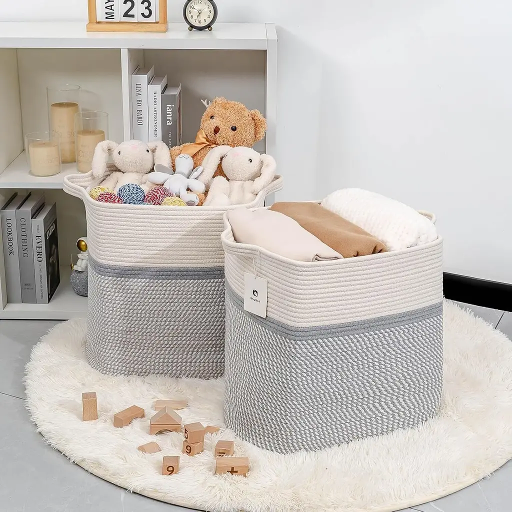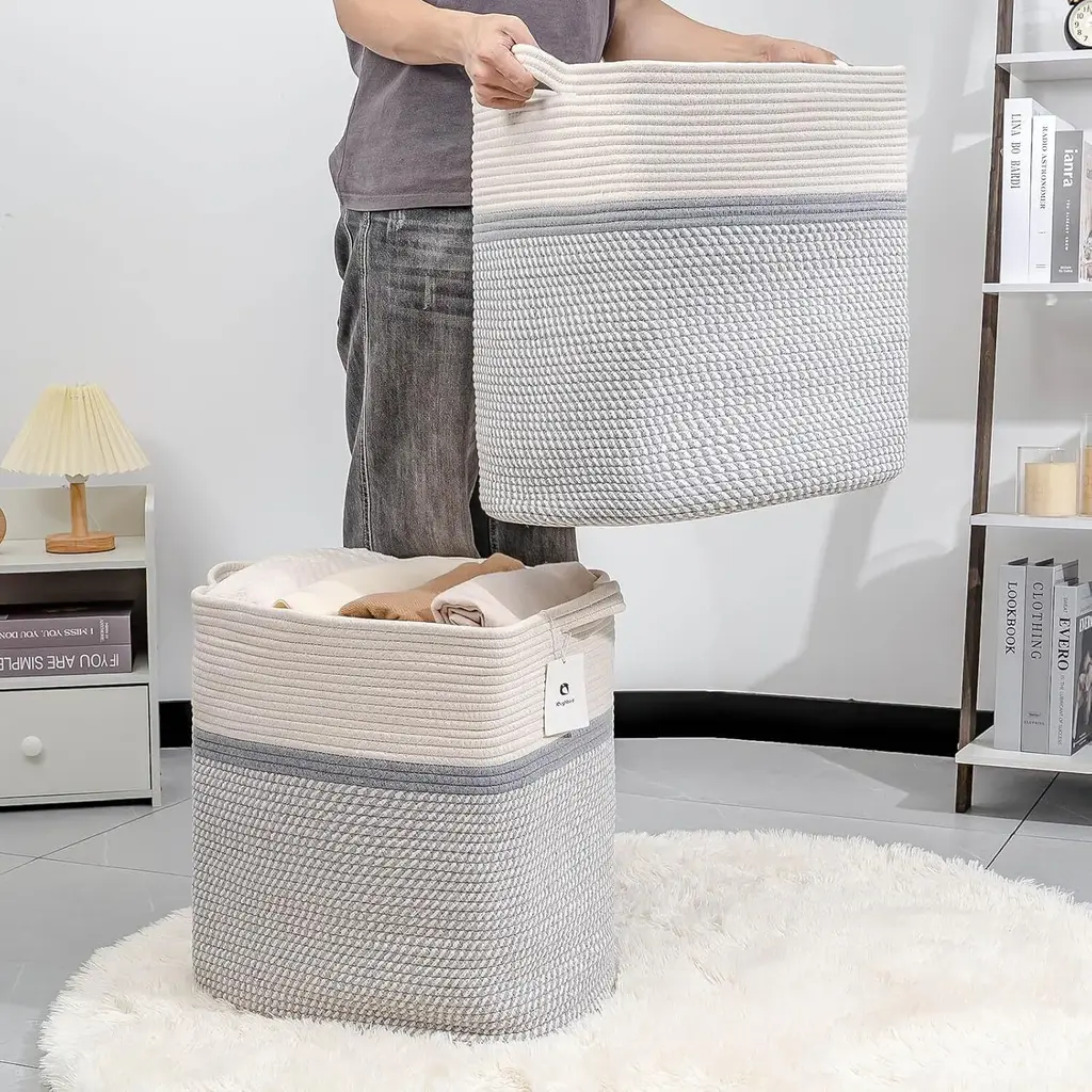 ⭐️Multipurpose Cube Storage Basket - TheseL16×W11.4×H15.9 rope storage baskets are great for keeping your daily routine more organized and provide plenty of compact for living room,laundry basket,room decor, children's toys or nursery Storage space storage and room accessories ⭐️ Design - These rope baskets are made of tightly woven cotton for storage and laundry, with a retro and modern feel, making them stronger and more durable than regular wicker storage baskets, linen closet organizers, and storage baskets. ⭐️Retro colors are suitable for every style - these multifunctional foldable storage bags come in 4 unique colors and multiple sizes, complementing your home wardrobe or style. ⭐️External handles - These storage rope baskets are also equipped with slender handles, which have a seamless appearance and complete functionality. It is very suitable for picking up toys or carrying items at home, storing clothes, and using dirty clothes.⭐️The oversized storage box for decorative shelves such as books, blankets, clothes, etc. is deeper and higher than a standard cotton rope basket, providing sufficient depth when storing household items, toys, hobbies, diapers, clothes, classroom storage rooms, or art and crafts Laughbird