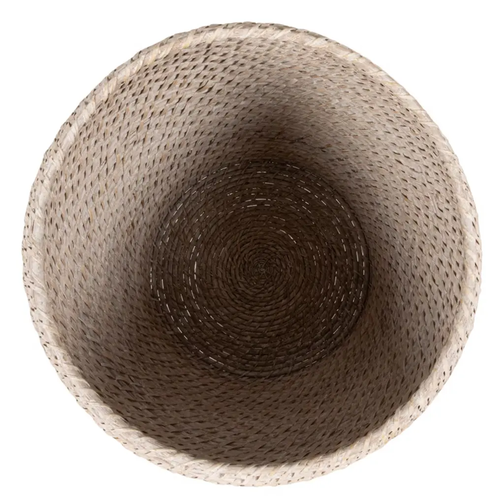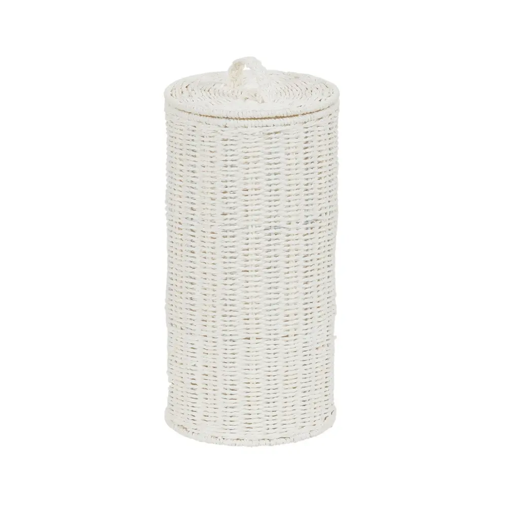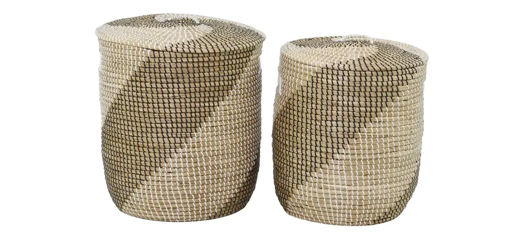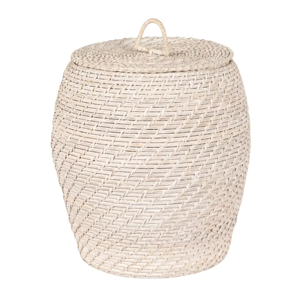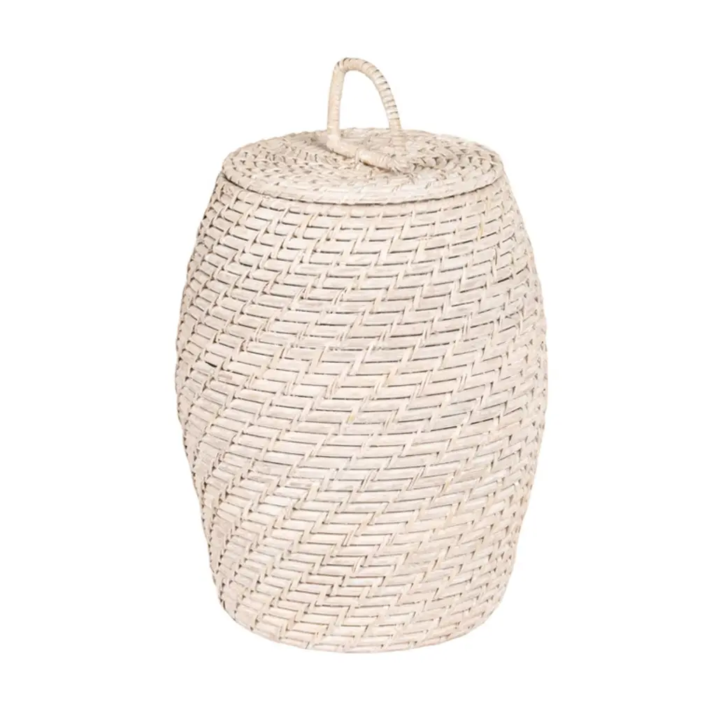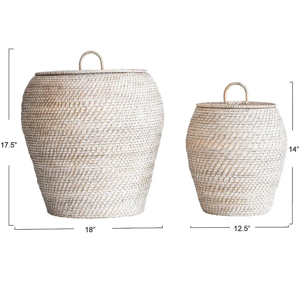 A charming and practical way to store and organize items is with these hand-woven rattan baskets with lids. They are made of natural rattan, a renewable material that is durable and flexible. They have a whitewashed finish that gives them a vintage and rustic appeal. They have round shapes and matching lids with handles that make them easy to open and close. Use it for various purposes, such as holding clothes, toys, books, or crafts. Place them in the bedroom, living room, bathroom, or laundry room for a neat and tidy look. The set includes two baskets of different sizes that can be nested together when not in use. The dimensions are: Large: 18 inches round x 17.5 inches tall; Small: 12.5 inches round x 14 inches tall. These baskets are easy to clean with a damp cloth and will bring a touch of nature to any home.