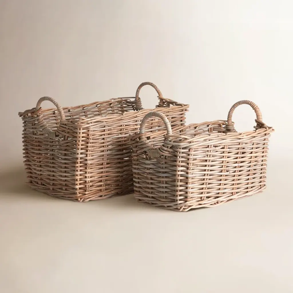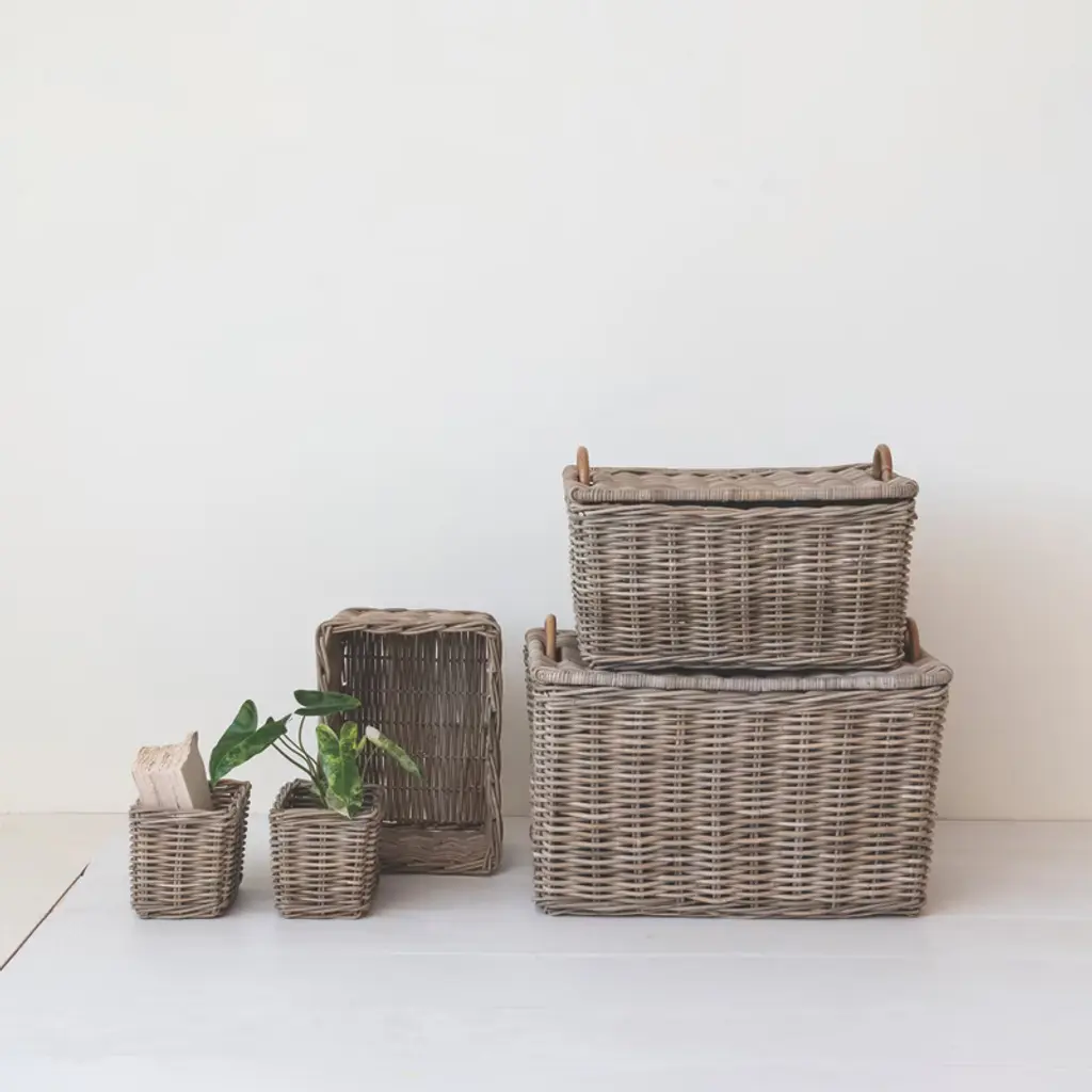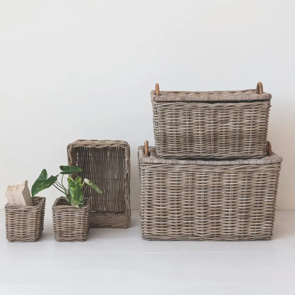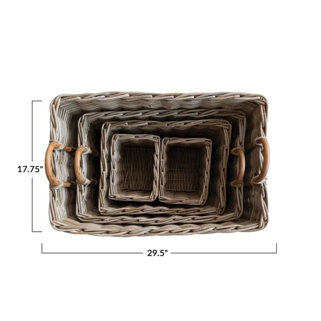 This set of five trunks and baskets is a beautiful and functional piece that will enhance the home with its natural charm. The trunks and baskets are made of natural hand-woven rattan, a durable material that skilled artisans weave. The rattan has a natural color and texture, adding warmth and character to the space. The trunks and baskets have a rectangular design that complements any shape of items. The trunks and baskets also have lids that keep items hidden and protected from dust and dirt. The trunks and baskets also have handles that make them easy to carry and move. Use them to store or organize items in any room of the house, where they will create a cozy and clutter-free environment with their versatile and nestable design. Whether used for clothes, books, toys, or other items, this set of five trunks and baskets will add a touch of rustic charm and storage space to the space. The largest size measures 29.5 inches in length, 17.75 inches in width, and 17.75 inches in height. Keep any items organized and stylish with these versatile and spacious baskets.